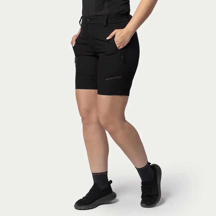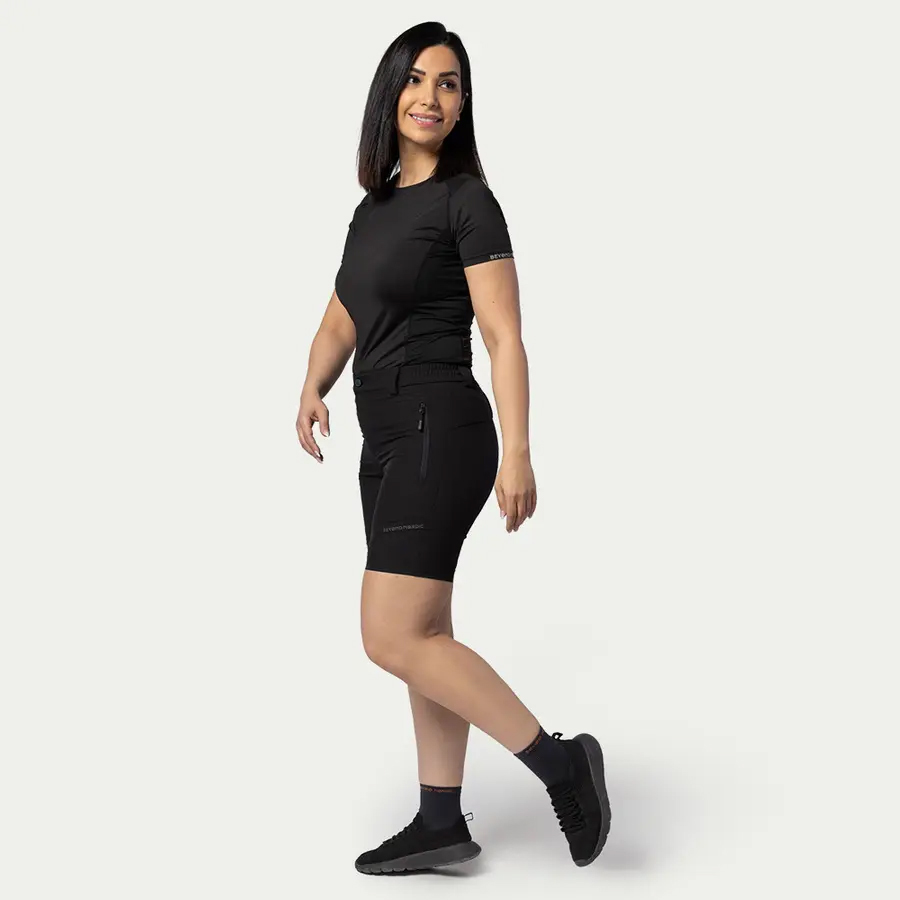 A BN013 Lightweight Flex Shorts női rövidnadrágokat a szabad mozgás és aktív életmód jegyében tervezték – ideális választás meleg időben és bármilyen kalandhoz. A kiváló teljesítményű Terraflex™ anyagból készült nadrág gyorsan szárad, négyirányú rugalmasságot biztosít, valamint fenntartható Teflon EcoElite® vízlepergető kezeléssel van ellátva a megbízható vízállóság érdekében. A BN013 modell hálós bélésű, cipzáras zsebeket kínál a jól szellőző és biztonságos tároláshoz, strapabíró YKK cipzárral és PGP zsebcipzárokkal az alapvető dolgok biztonságáért. A hátsó szellőzőpanel extra légáramlást biztosít intenzív tevékenységek során, a könnyű, könnyen csomagolható kialakítás pedig megkönnyíti, hogy minden utazásra magaddal vidd. Legyen szó vadregényes ösvényekről vagy városi sétákról – ezek a női rövidnadrágok technikai teljesítményt és sokoldalú stílust kínálnak, hogy lépést tartsanak veled a nap minden percében.