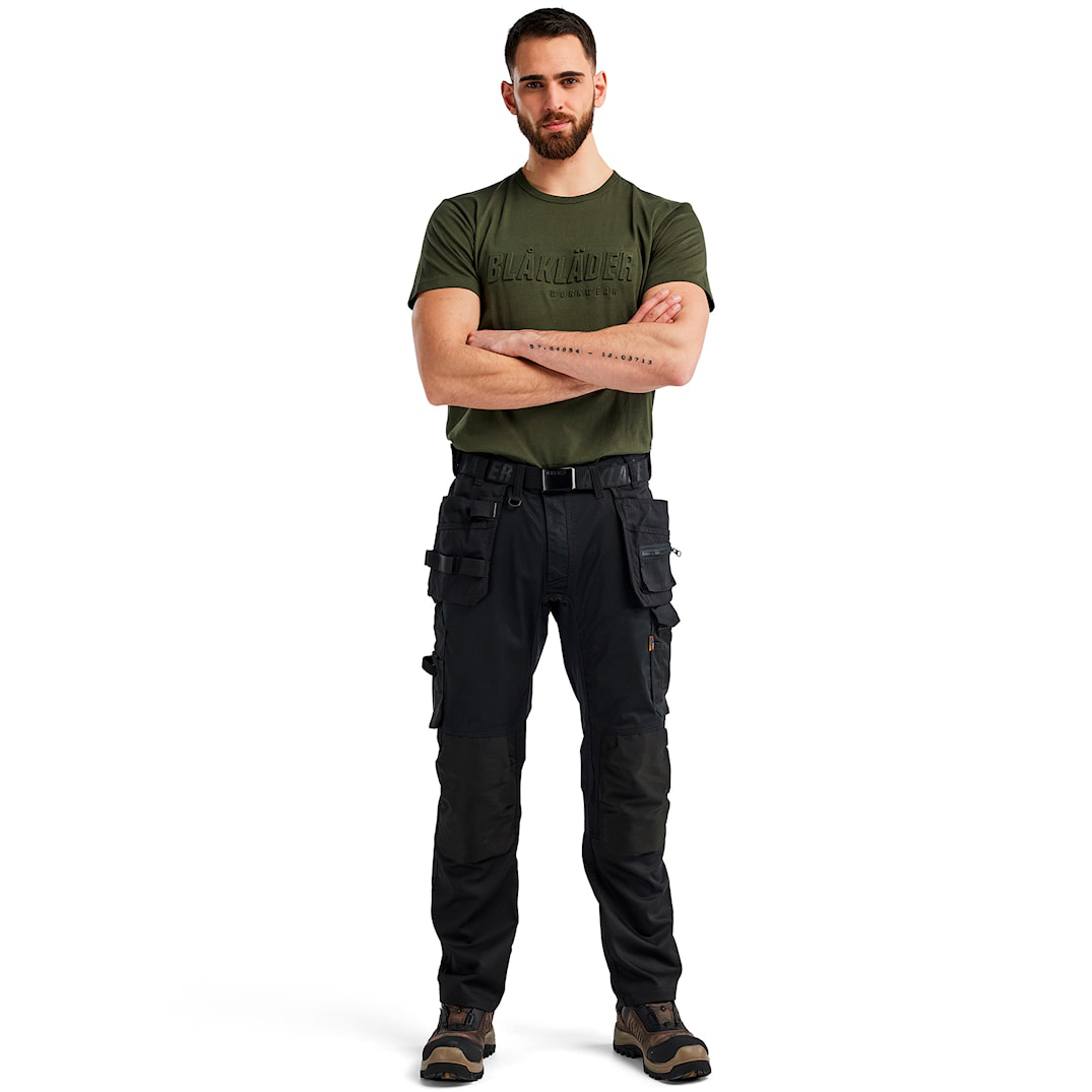 Ez a stílusos pamut póló feltűnő 3D „Blakläder” felirattal a mellrészen tökéletes választás munkába és mindennapi viseletre egyaránt. A lazább szabás maximális kényelmet és szabad mozgást biztosít, míg a kiváló minőségű anyag (100% pamut, egyszerű kötött szövet, 150 g/m2) légáteresztő és kellemes tapintású. A póló bordázott kerek nyakkivágással, megerősített váll- és nyakvarrásokkal rendelkezik a nagyobb tartósság érdekében. Az egyedi 3D „Blakläder” nyomat kiemeli az Ön kifinomult ízlését a munkaruházat terén, és modern megjelenést kölcsönöz a pólónak.