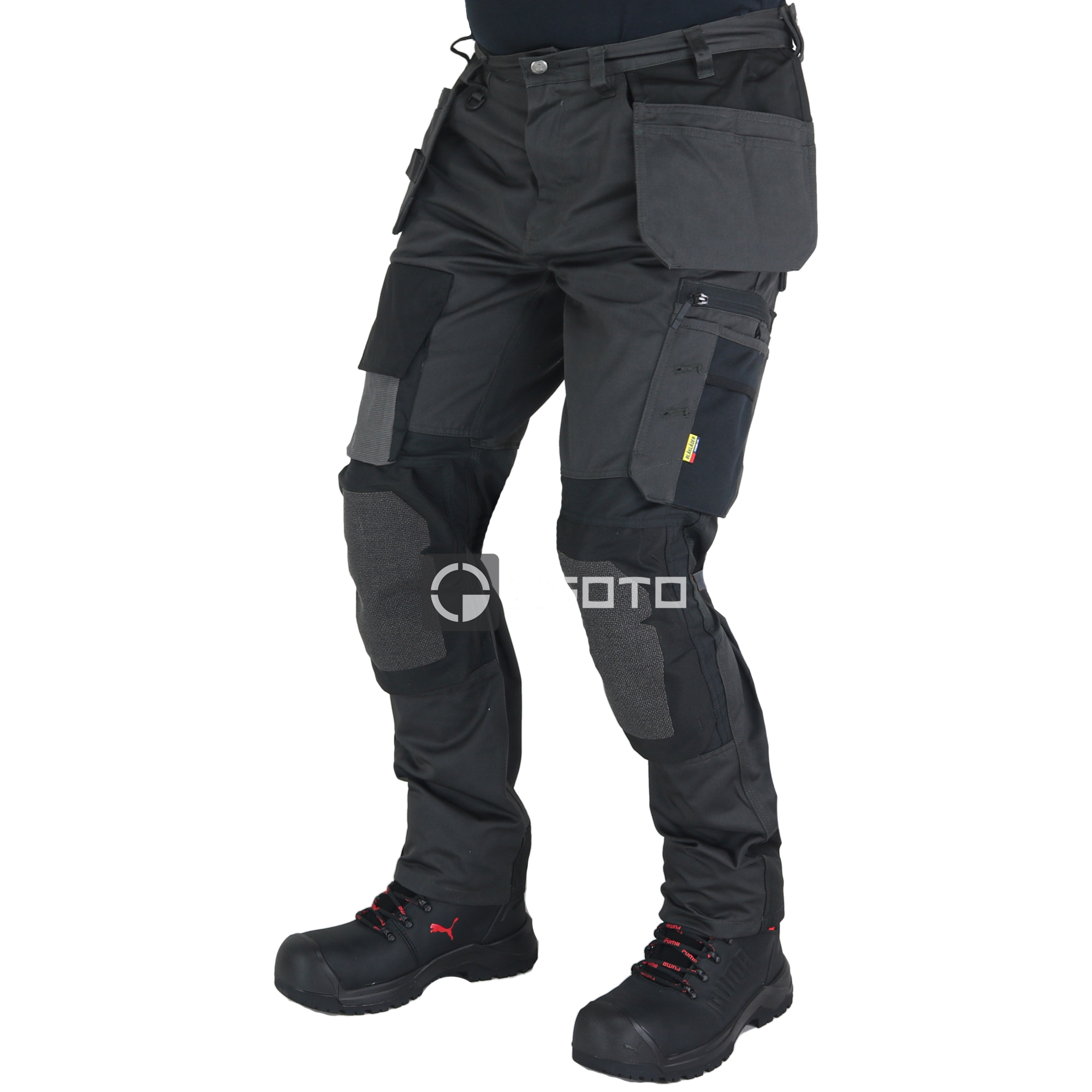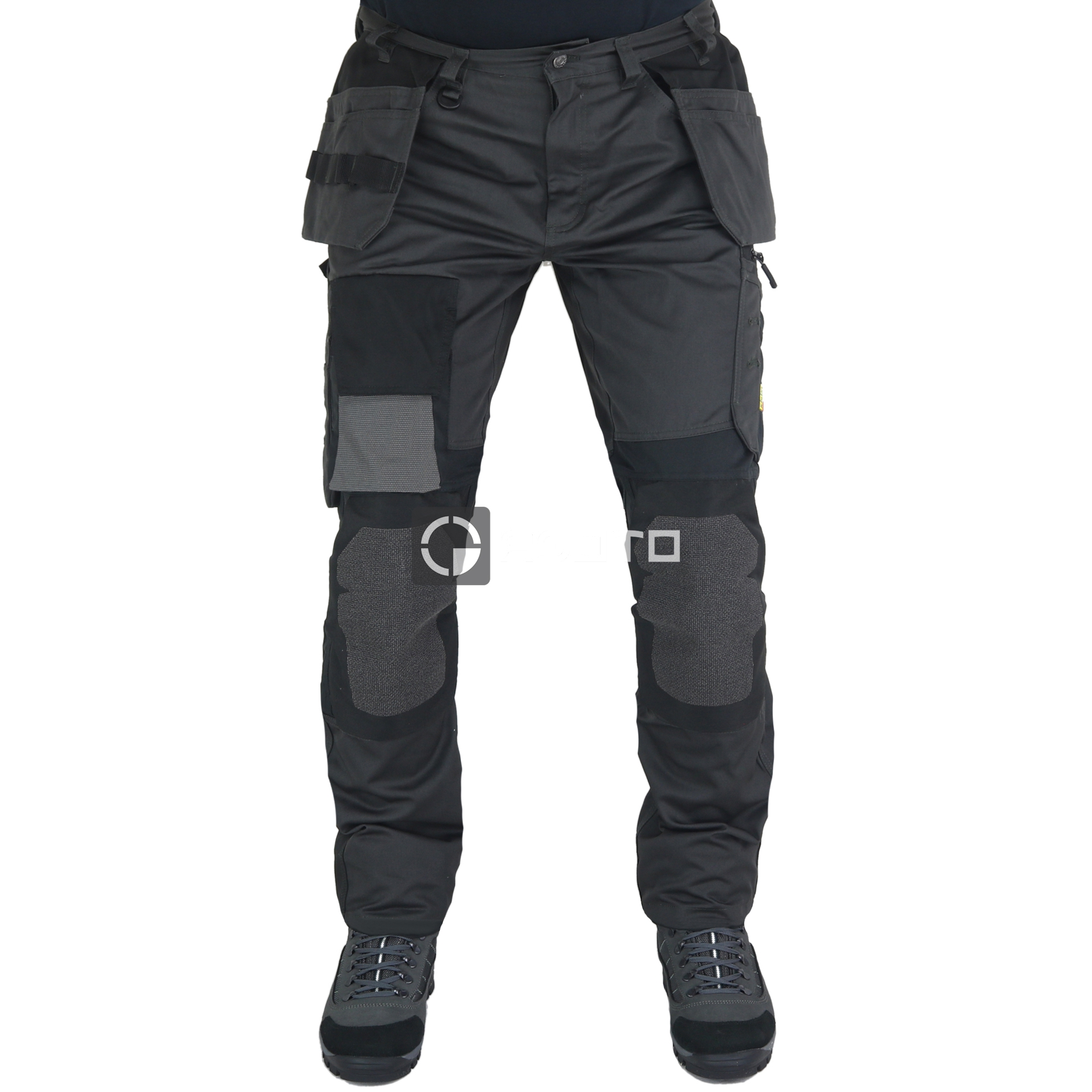 Ezek az elegáns, rugalmas és rendkívül tartós mesteremberek számára készült nadrágok a legnagyobb odafigyeléssel lettek megtervezve, hogy megfeleljenek a szakemberek legmagasabb elvárásainak a mozgásszabadság, funkcionalitás és kényelem terén. Az erős anyag és a rugalmas betétek kombinációja kivételes rugalmasságot biztosít, ami különösen hasznos a padlóburkolók, csempézők és más szakemberek számára, akik gyakran térdelő helyzetben dolgoznak. A stratégiailag elhelyezett rugalmas panelek a hátsó ülésrésznél, az elülső zsebeknél és a térdhajlatnál maximális mozgásszabadságot és egész napos kényelmet biztosítanak. A nadrágok praktikus zsebekkel vannak felszerelve, köztük egy speciális, Kevlar®-erősítésű készsebbel, patentos fedéllel és rugalmas résszel, valamint egy rugalmas telefontartó zsebbel, amely a legtöbb modern okostelefonhoz illik. A tartós, 65% poliészterből és 35% pamutból készült anyag kevertszálas twill szövésű, 300 g/m2 súlyú, ami nemcsak hosszú élettartamot, hanem nagyfokú ellenállóképességet is garantál a nehéz munkakörülmények között. A precíz kivitelezés és a prémium minőség bizonyítékaként a gyártó élettartam-garanciát vállal a varrásokra, ami garantálja, hogy ezek a nadrágok a legkeményebb körülmények között is megállják a helyüket.
