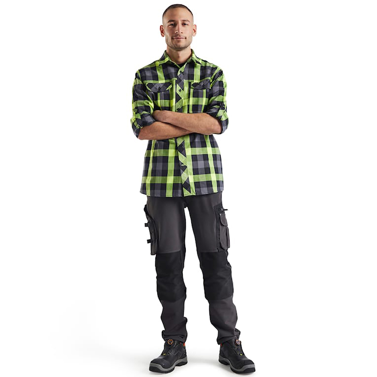 A Blakläder puha és stílusos flanel ing laza szabásban ideális választás munkához és mindennapi viselethez. A fekete-sárga kockás minta modern, feltűnő megjelenést kölcsönöz, miközben a belső oldal bolyhozott felülete kellemes meleget és kényelmet biztosít egész napos viselés során. Az ing két mellzsebbel rendelkezik, mindkettő fedéllel, a bal zseb pedig ceruzanyílással van ellátva. A műanyag gombok jól illenek az ing összképéhez, amely egyszerre laza és funkcionális. Az anyagösszetétel 82% pamut és 18% poliészter, 180 g/m2 súlyú, egyoldalasan bolyhozott flanel, amely puhaságot, tartósságot és kényelmet nyújt.