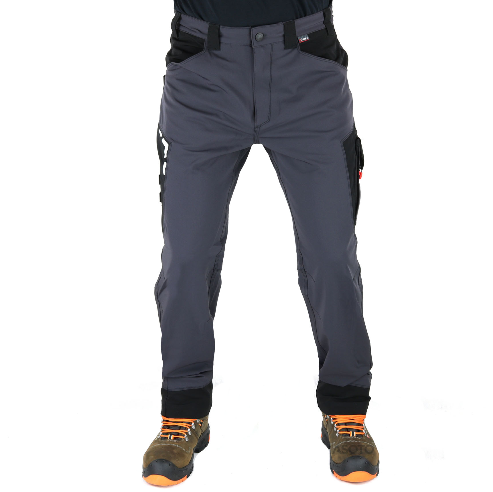A Cofra Hagfors Softshell munkanadrág széles elülső zsebekkel, dupla hátsó zsebbel zárt füllel, nagy rugalmasságú szövettel, kalapácshurokkal, ergonómikus térddel és lábszárral, bal oldali zsebbel dupla nyílással cipzárral, jobb oldali zsebbel préseléssel. Anyaga: 94% nylon, 6% elasztán, 250 g/m