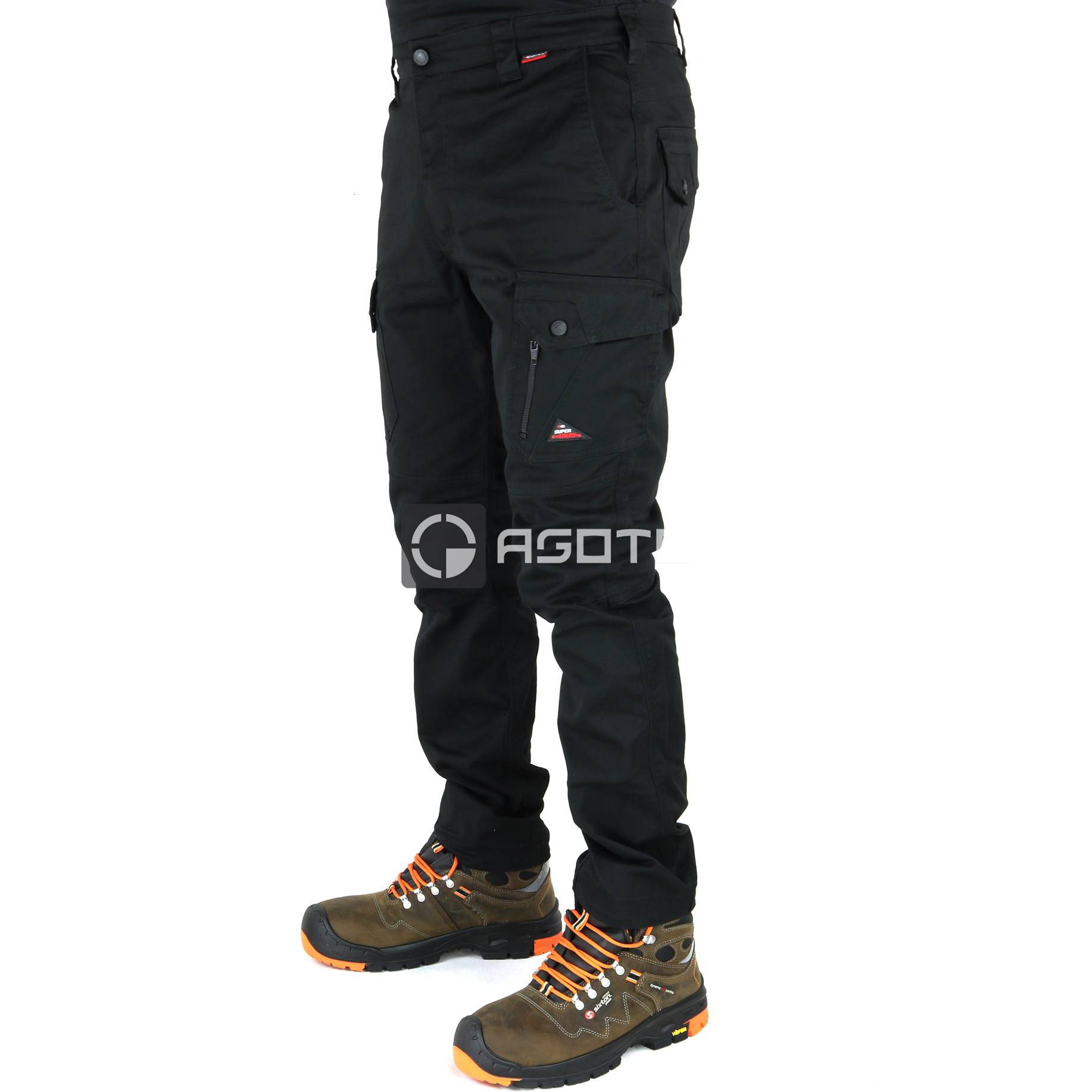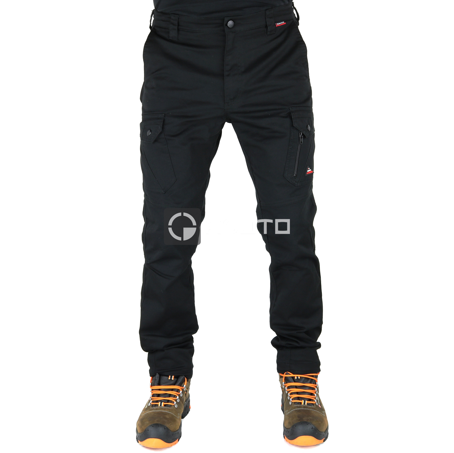 A Cofra Jember sztreccs munkanadrág széles elülső zsebekkel, dupla hátsó zsebbel, füles zárással, magasan elasztikus anyaggal, kalapácshurokkal, ergonomikus térd- és lábkialakítással, bal oldali zsebbel dupla cipzárral, jobb oldali zsebbel patenttal. Anyaga: 60% pamut, 37% poliészter, 3% elasztán, 245 g/m