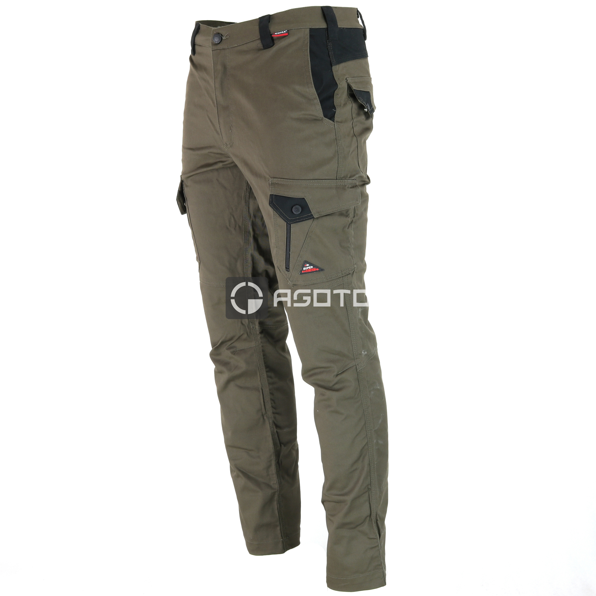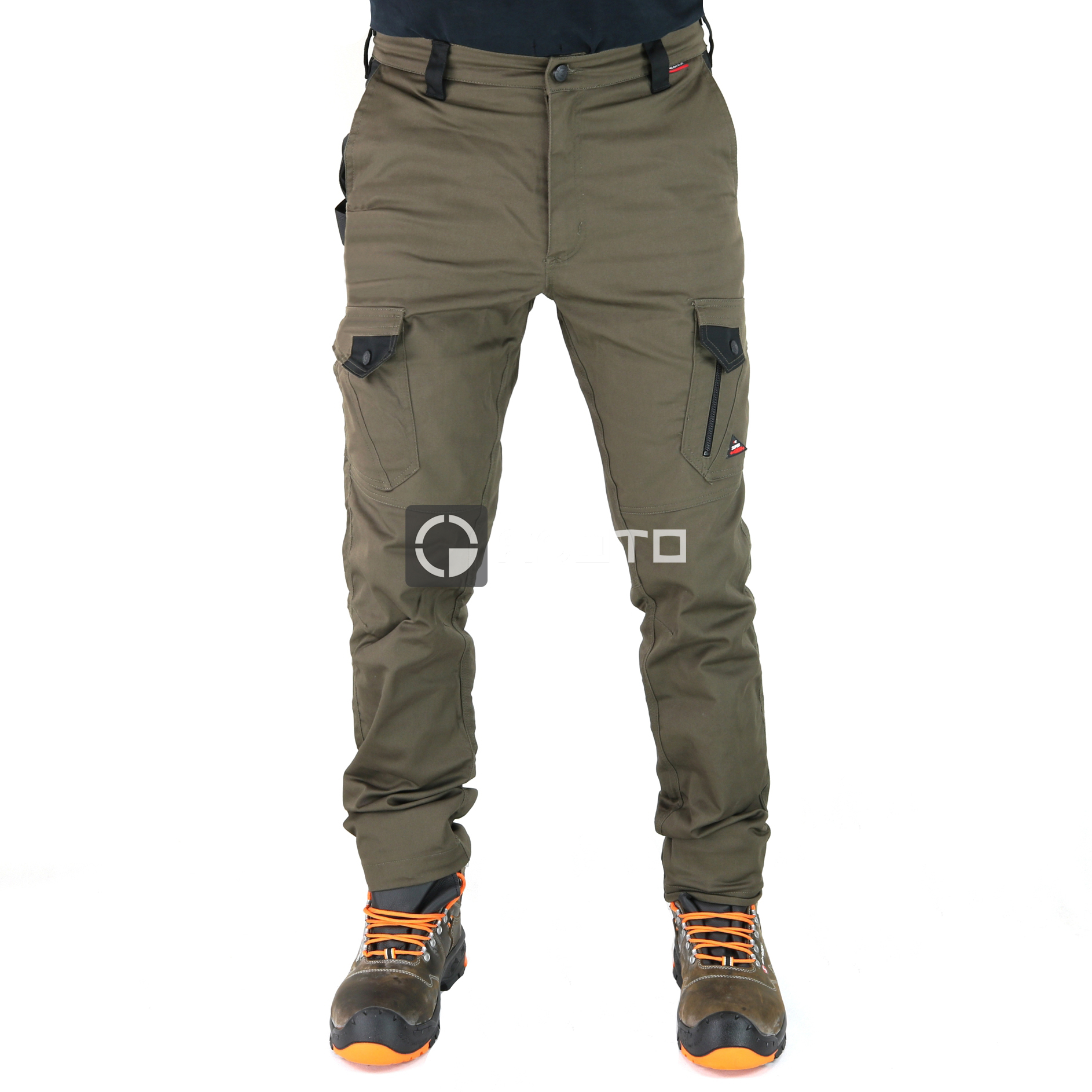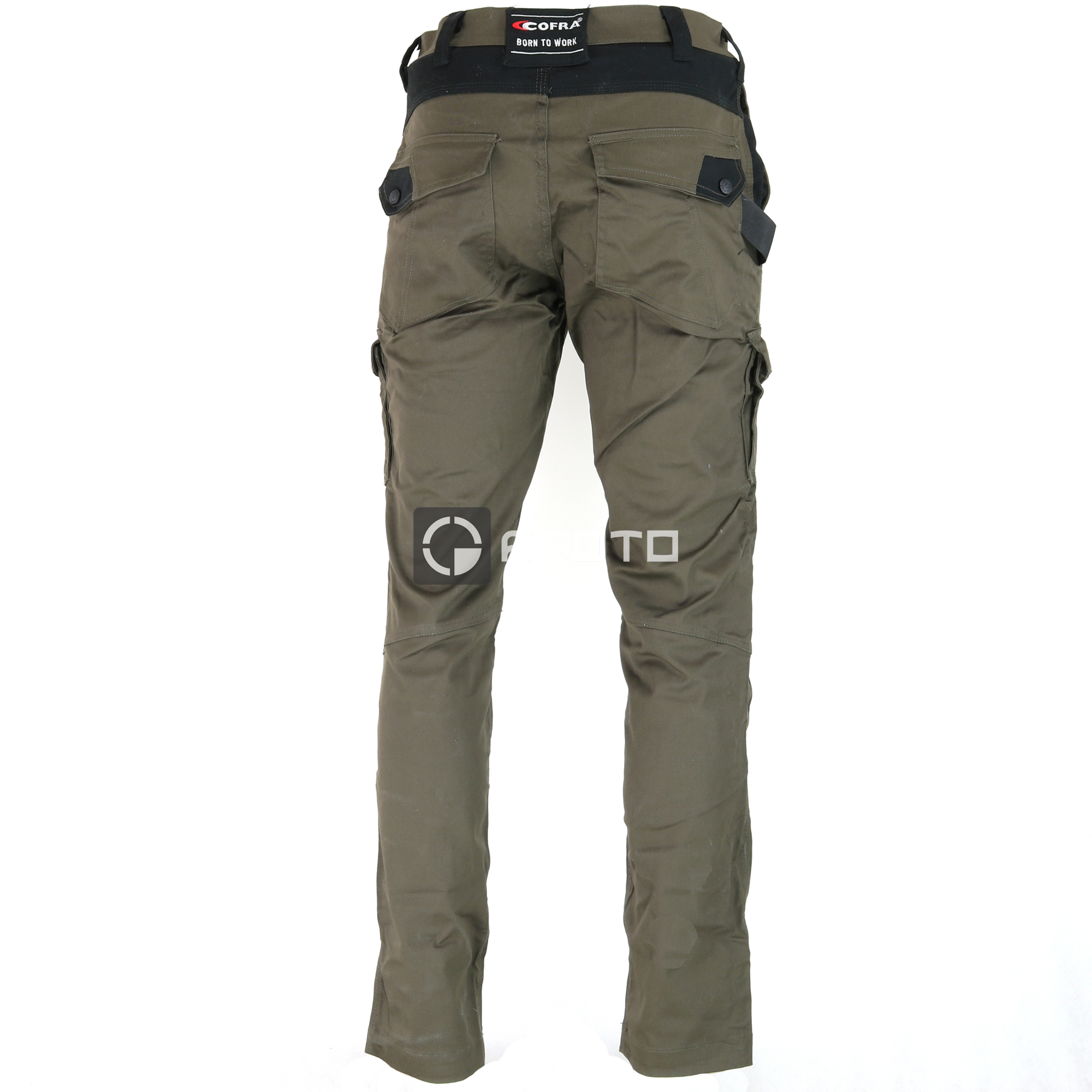 A Cofra Jember sztreccs munkanadrág széles elülső zsebekkel, dupla hátsó zsebbel, füles zárással, magasan elasztikus anyaggal, kalapácshurokkal, ergonomikus térd- és lábkialakítással, bal oldali zsebbel dupla cipzárral, jobb oldali zsebbel patenttal. Anyaga: 60% pamut, 37% poliészter, 3% elasztán, 245 g/m