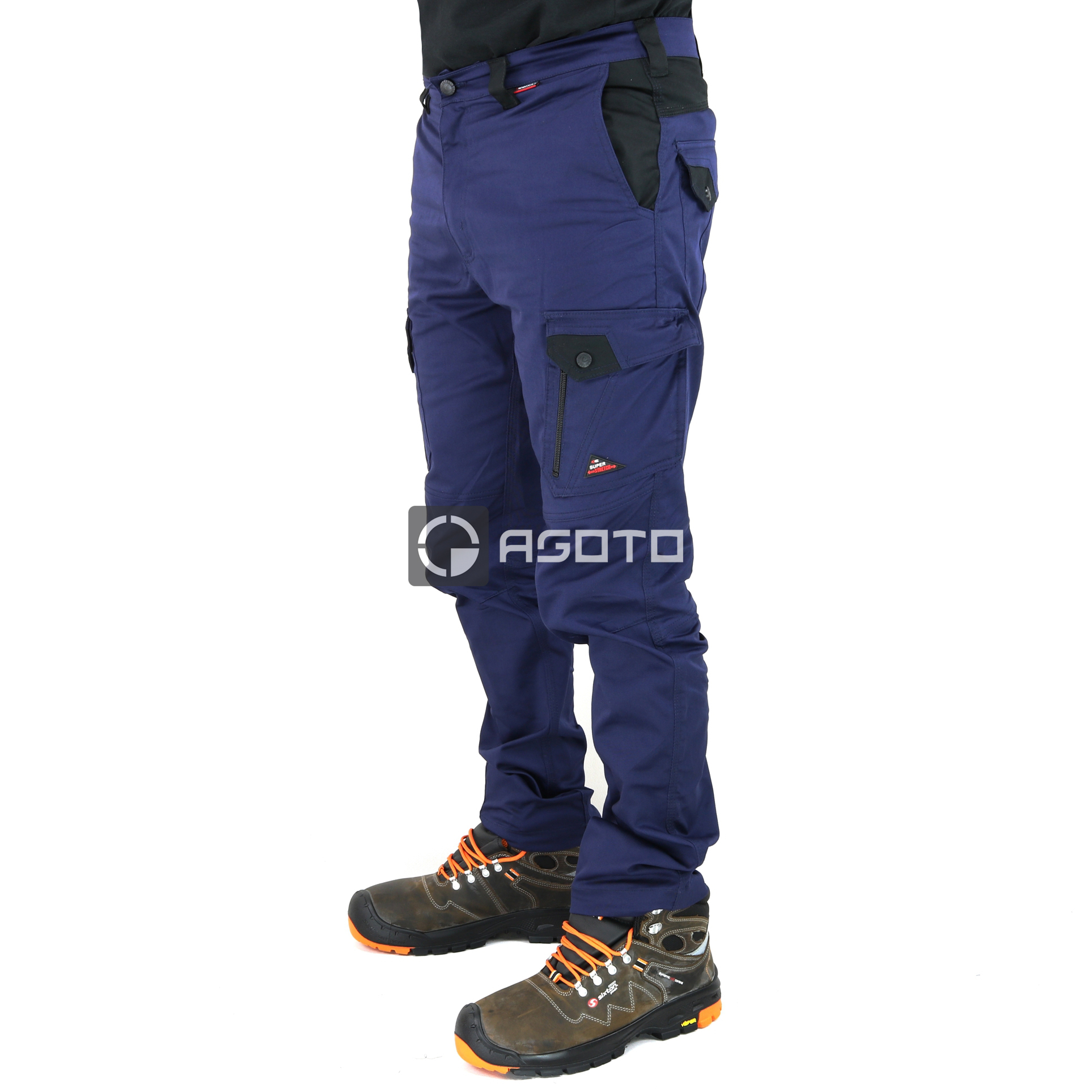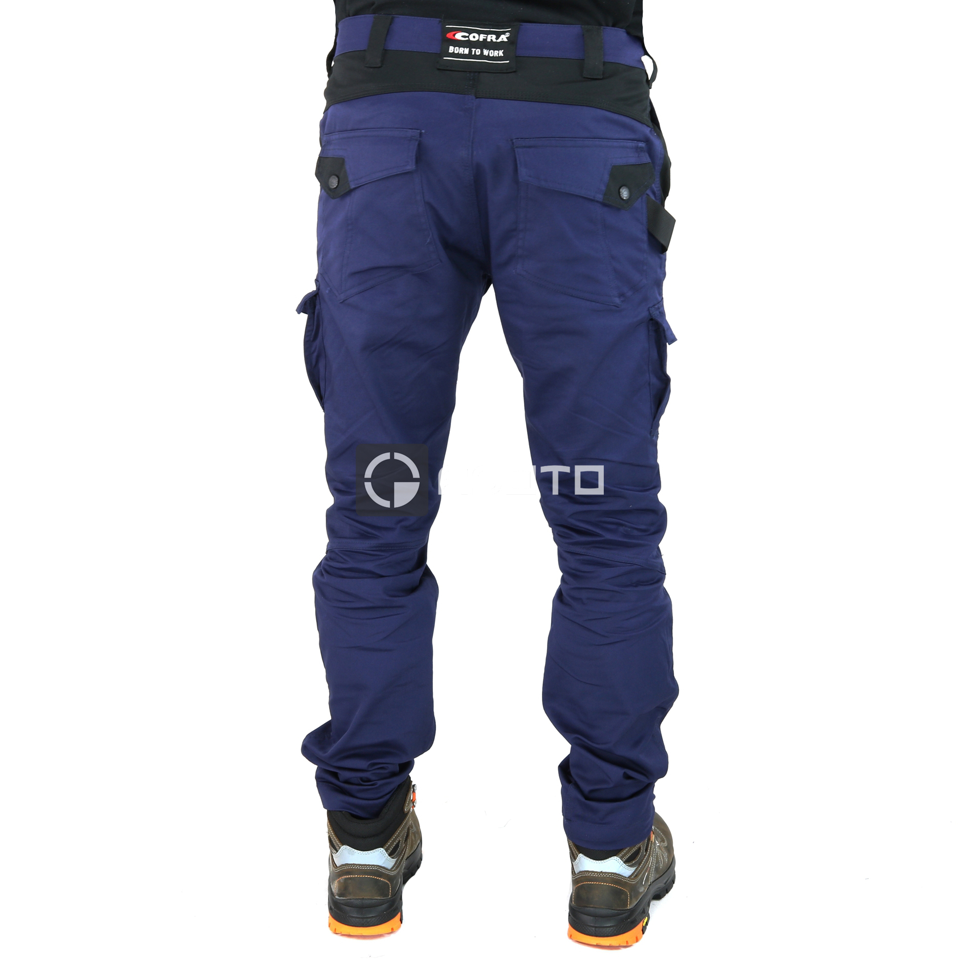 A Cofra Jember sztreccs munkanadrág széles elülső zsebekkel, dupla hátsó zsebbel, füles zárással, magasan elasztikus anyaggal, kalapácshurokkal, ergonomikus térd- és lábkialakítással, bal oldali zsebbel dupla cipzárral, jobb oldali zsebbel patenttal. Anyaga: 60% pamut, 37% poliészter, 3% elasztán, 245 g/m