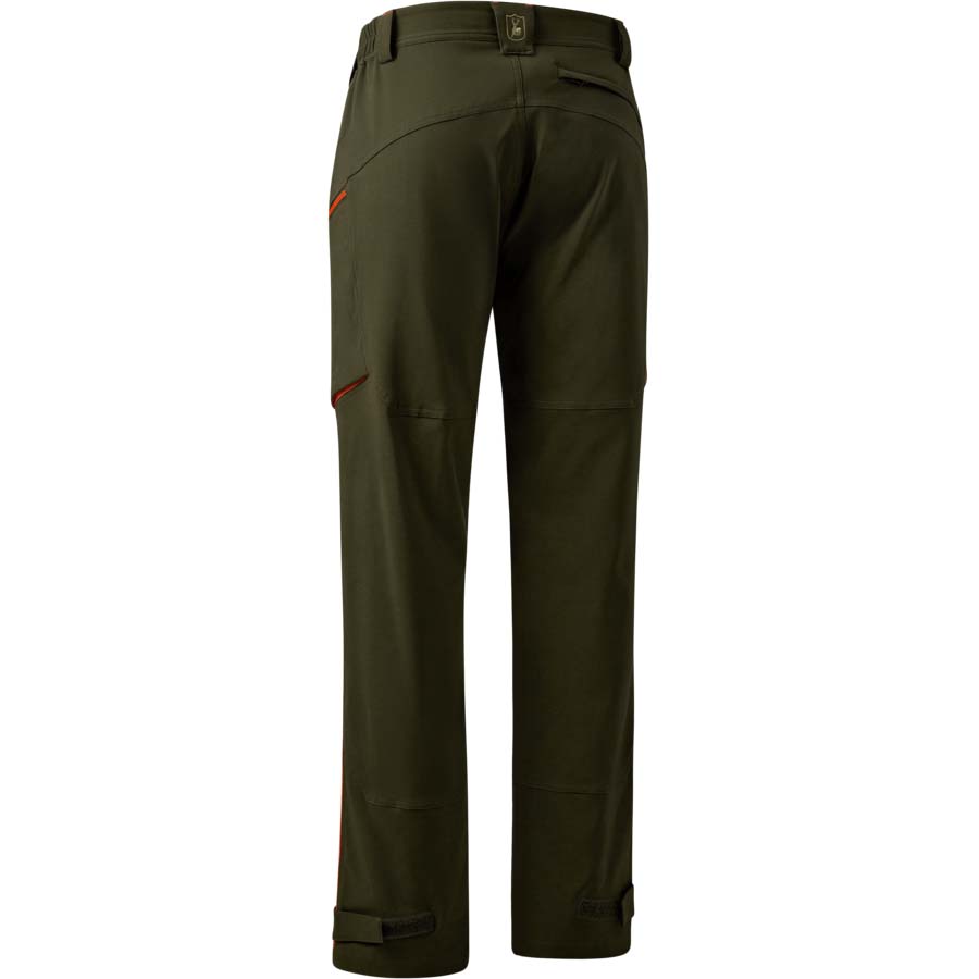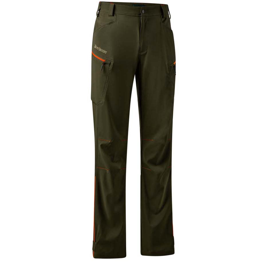 A Chamois nadrág Forest Green színben, narancssárga részletekkel ötvözi a kényelmet és a funkcionalitást, így tökéletes választás igényes szabadtéri tevékenységekhez. A rugalmas és légáteresztő anyagnak köszönhetően maximális mozgásszabadságot és tökéletes illeszkedést biztosít. Az oldalán gumírozott derék egész napos kényelmet garantál. Praktikus tárolóhelyet biztosít két elülső zseb, két cipzáras combzseb és egy rejtett cipzáras hátsó zseb. Az előformázott térdrész növeli a mozgáskomfortot, míg a tépőzáras bokaszabályozás lehetővé teszi a személyre szabott illeszkedést. A vízlepergető anyag védelmet nyújt a nedvesség és a szennyeződések ellen, a könnyű kialakítás pedig kényelmet biztosít felesleges súly nélkül. Ideális választás vadászoknak, túrázóknak és természetkedvelőknek. 90% Polyester / 10% Elastane