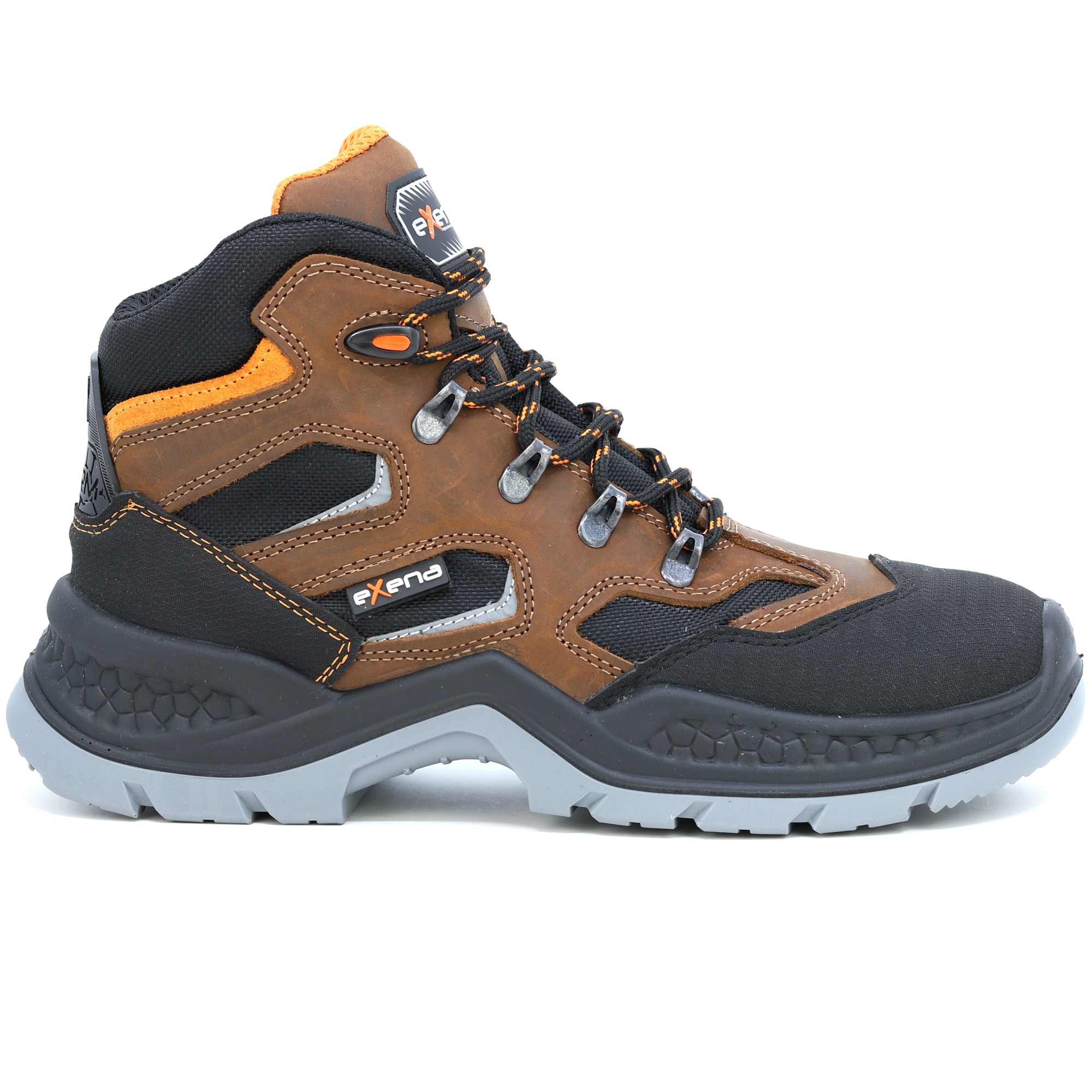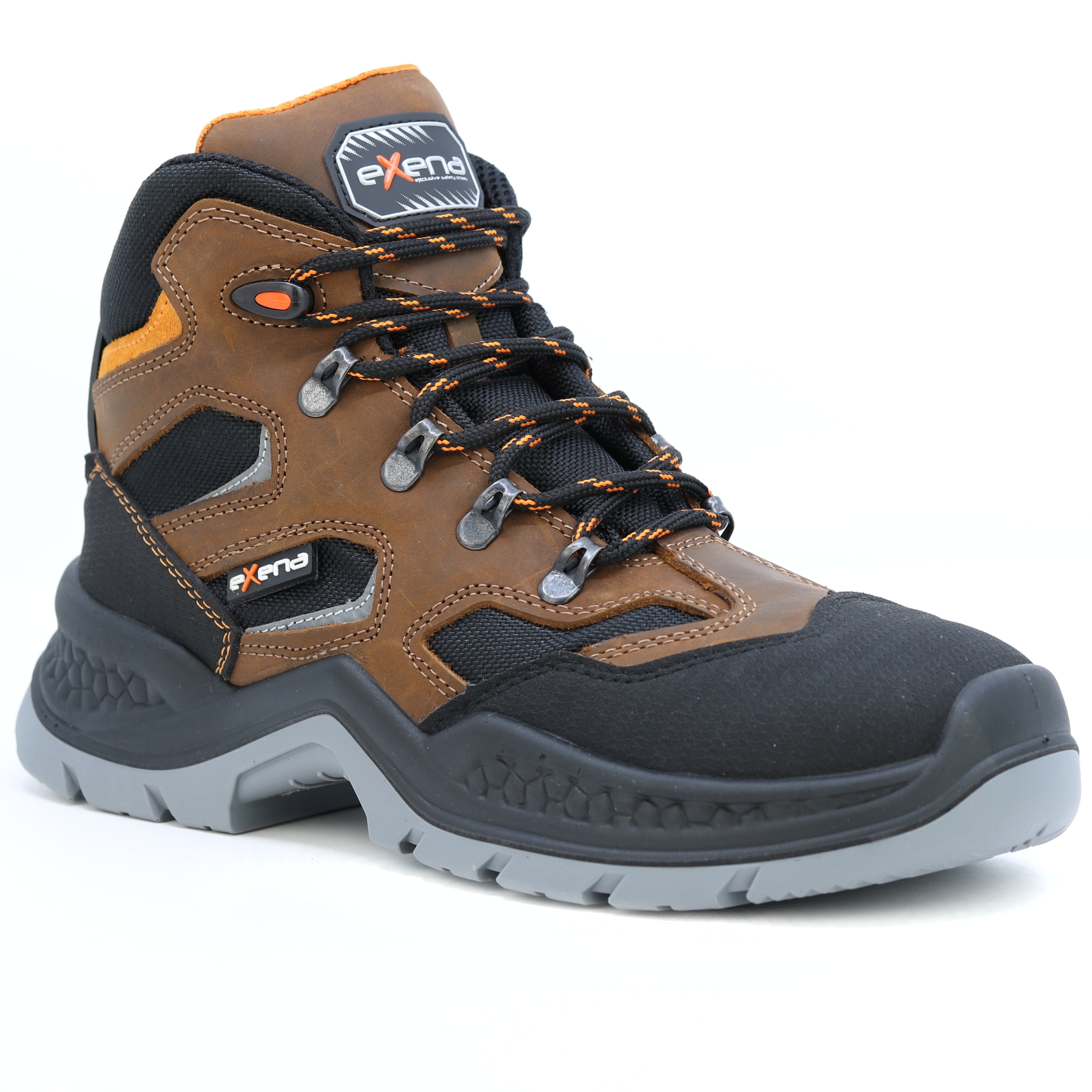 Kožené pracovní boty italské značky Exena se stupněm ochrany S3 jsou navrženy tak, aby vyhověly nejpřísnějším požadavkům kladeným na pracovní obuv. Špička obuvi obsahuje kompozitovou tužinku s kevlarovou stélkou pro účinnou ochranu proti mechanickému nárazu. Výhodou kompozitové tužinky je vlastnost, která zabraňuje přehřívání v letních měsících a zároveň vede k udržení tepelného komfortu při chladných dnech. Svršek boty je vyroben z kvalitní lícové usně. Vnitřek obuvi je opatřen prodyšnou textilií, která umožňuje noze volně dýchat při vysoké pracovní zátěži. Podrážka je vyrobena z antistatického a olejivzdorného materiálu. Pracovní obuv Exena udělá radost zákazníkům hledajícím u obuvi zejména kvalitu a pohodlí. EN ISO 20345 - BEZPEČNOSTNÍ OBUV.
