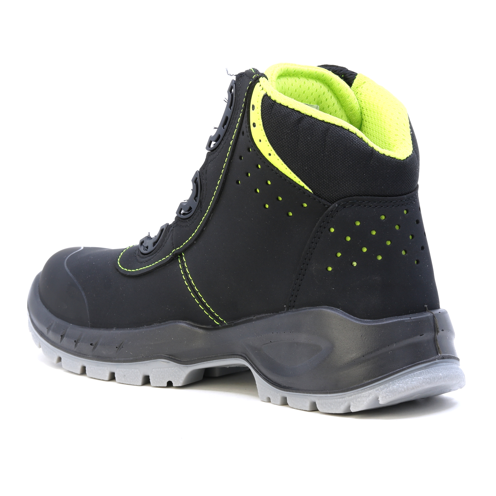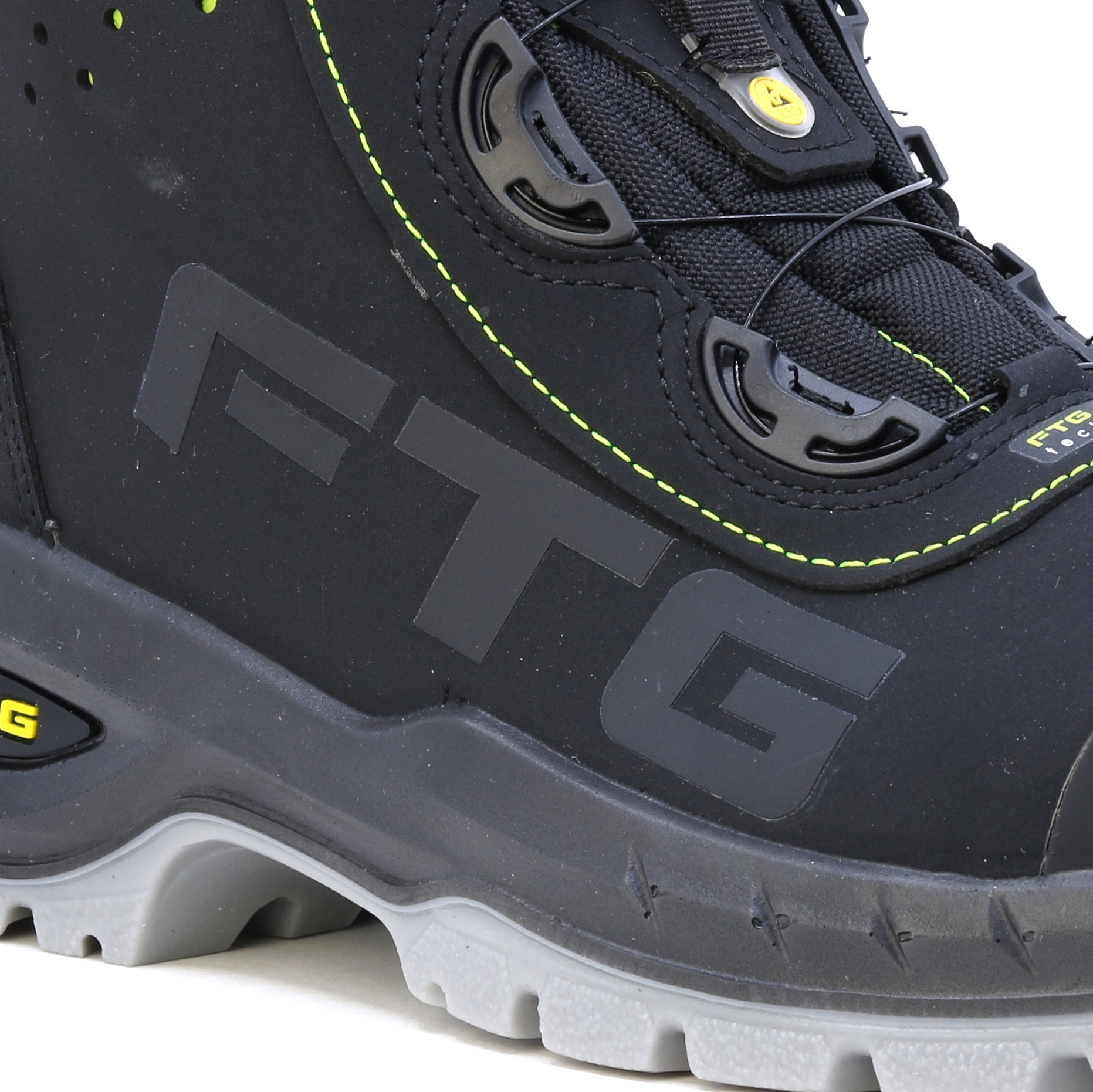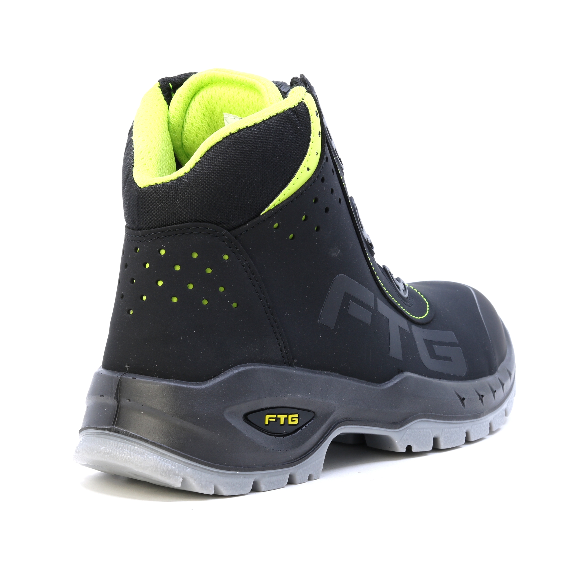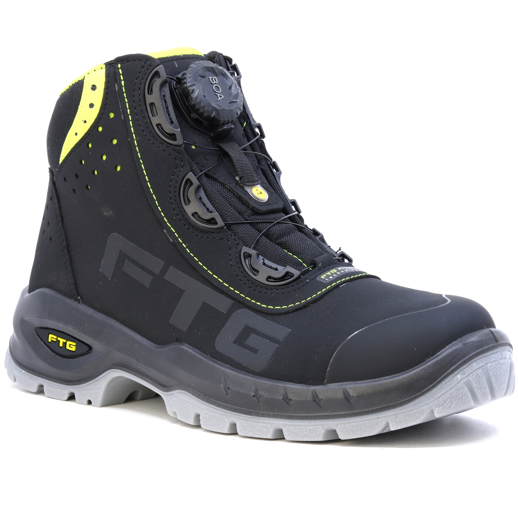 Csúcskategóriás lábbeli áttekinthető kialakítással az igényes feladatokhoz. BOA rendszer a könnyű és kényelmes cipők felhúzásához. Az FTG Concorde S3 fémmentes védő orrvédőjével és átszúrásgátló talpbetétjével ideális biztonsági cipő az építőiparban, a kereskedelemben és az iparban. Nubuk bőr felsőrész a többszörös varrásnak köszönhetően könnyen tisztítható és stabilitást biztosít. A TPU átfedő talpat szándékosan a Professional Line számára tervezték, és különféle, erre a célra optimalizált profilelemekből áll. A talp kopásálló, jobb hajlékonysággal, jobb tapadású talajjal és optimális folyékony extrudálási profillal rendelkezik a biztos tartás érdekében. A sarokrészben található lengéscsillapító elnyeli az energiát. Az FTG® Memory Foam talpbetét extra plusz kényelmet biztosít a biztonsági cipőben. A testhőnek köszönhetően a talpbetét termikus habja egyénileg alkalmazkodik a láb formájához. Ez optimális nyomáseloszlást ér el a láb teljes felületén. Tökéletes hosszú munkanapokhoz! Az ESD antisztatikus kezelés védelmet nyújt az elektrosztatikus kisülés lehetőségével járó műveletek során. EN ISO 20345 – BIZTONSÁGI Lábbeli Az ESD antisztatikus kezelés védelmet nyújt az elektrosztatikus kisülés lehetőségével járó műveletek során. EN ISO 20345 – BIZTONSÁGI Lábbeli