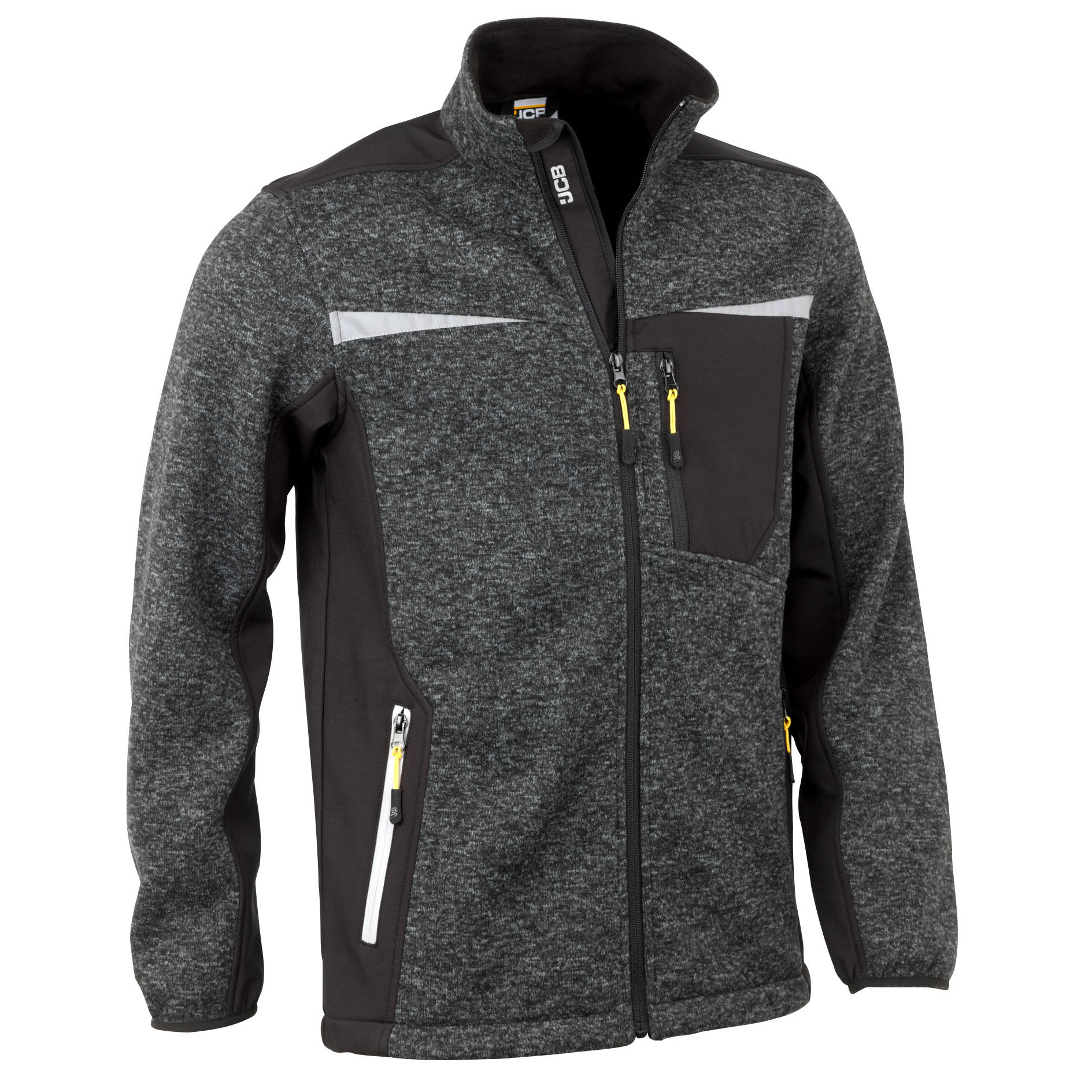 Pletená bunda s celopropínacím zipem se dvěma bočními kapsami na zip, elastickými páskami na manžetách a stahovací šňůrkou kolem spodního lemu pro pohodlí během celého pracovního dne. Reflexní detaily na hrudi, ramenou a kolem bočních kapes. Softshellové boční panely a podpaží pro snadný pohyb při práci a trychtýřový krk pro extra teplo.