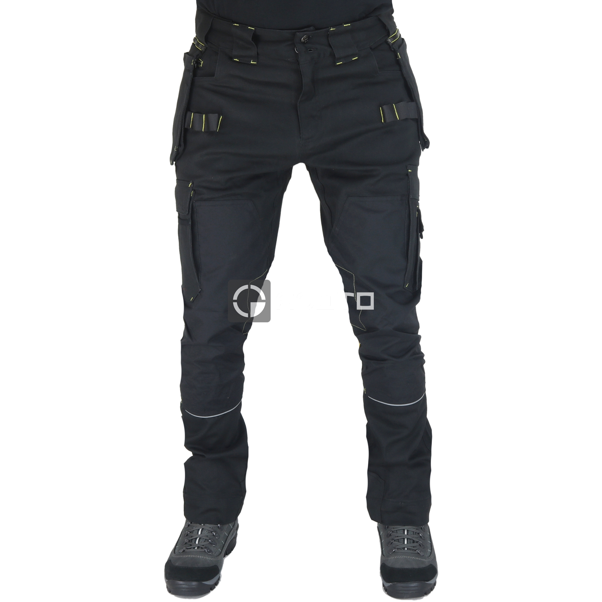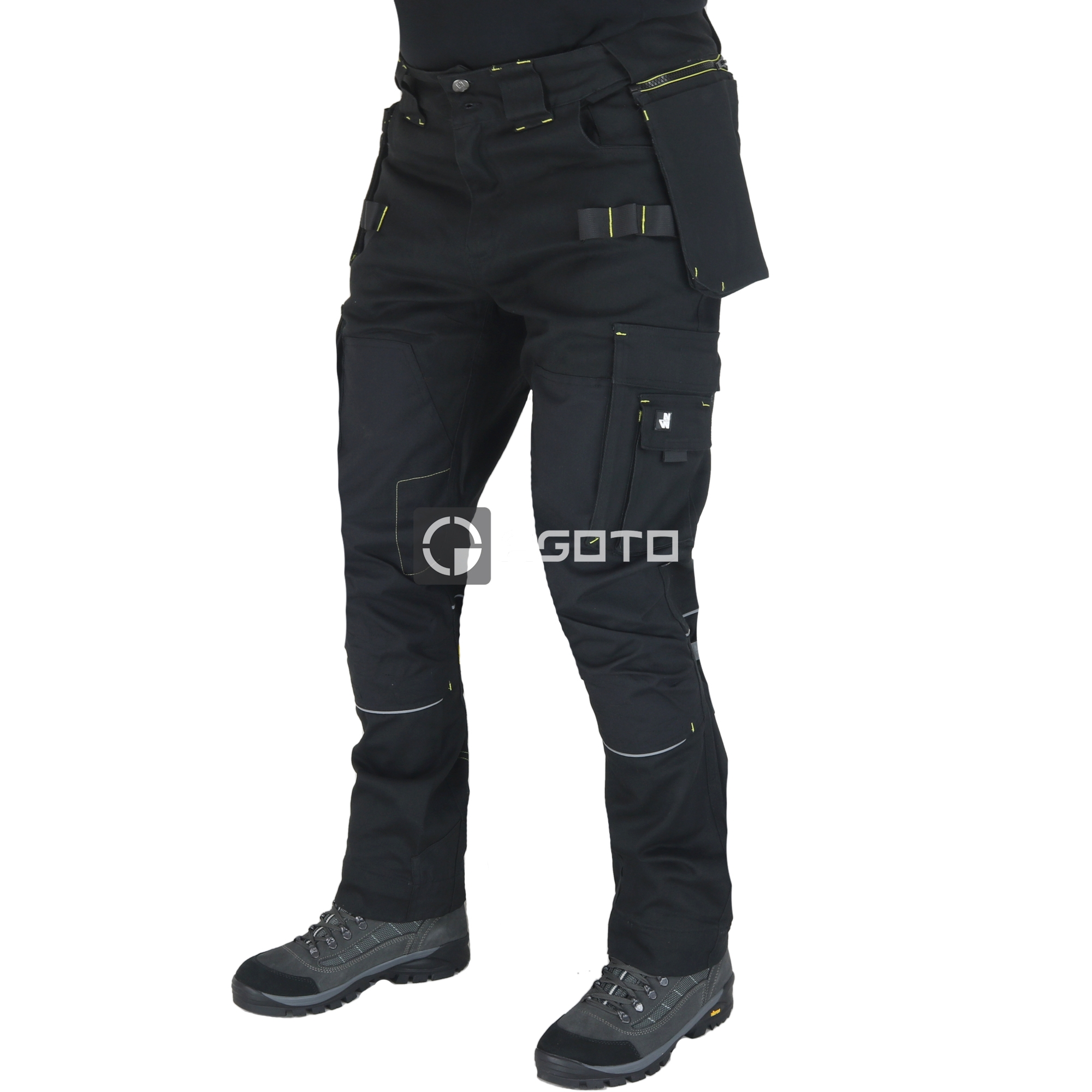 NINE WORTHS A fekete színű Howard Stretch férfi munkanadrág maximális kényelmet és tartósságot biztosít az igényes munkavégzés során. A fő anyag 98% pamutból és 2% elasztánból (300 g/m2) áll, twill kialakítással, amely biztosítja a rugalmasságot és a kényelmet mozgás közben. A nadrág feszített helyeken poliészter 600D Oxford PU bevonattal (250 g/m2), a térdvédők pedig tartós CORDURA® 500D anyagból készültek (100% poliamid PU bevonattal, 245 g/m2). Megfelelnek az EN 14404 + A1 1. szintű tanúsítványnak, ami megerősíti védettségüket. Állítható MOOV pánttal és 12 zsebbel rendelkeznek, köztük szerszámok, okostelefon és összecsukható mérőszalag zsebekkel. A nadrág szerszámhurokkal, hármas varrással és állítható szegéllyel is rendelkezik a nagyobb tartósság érdekében.