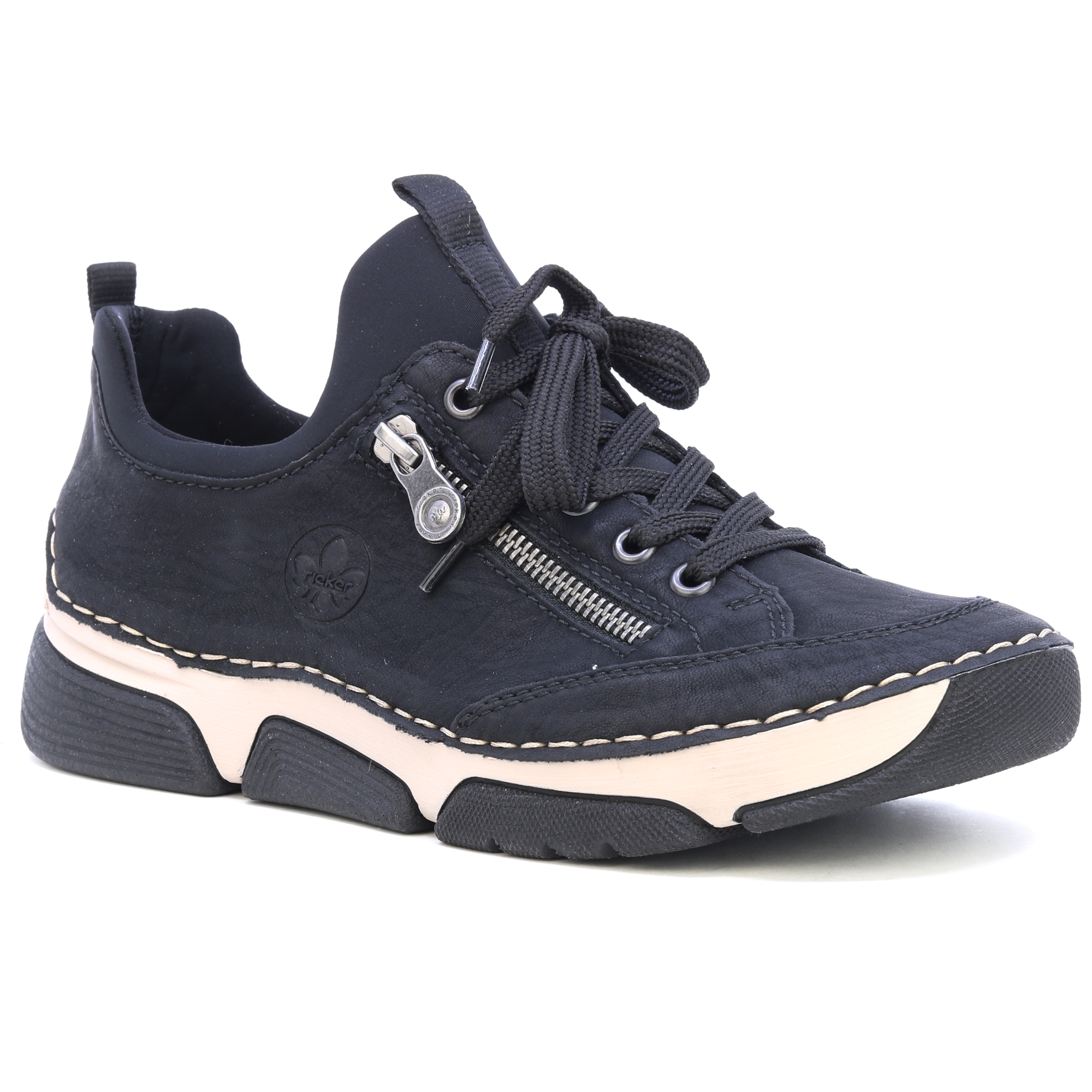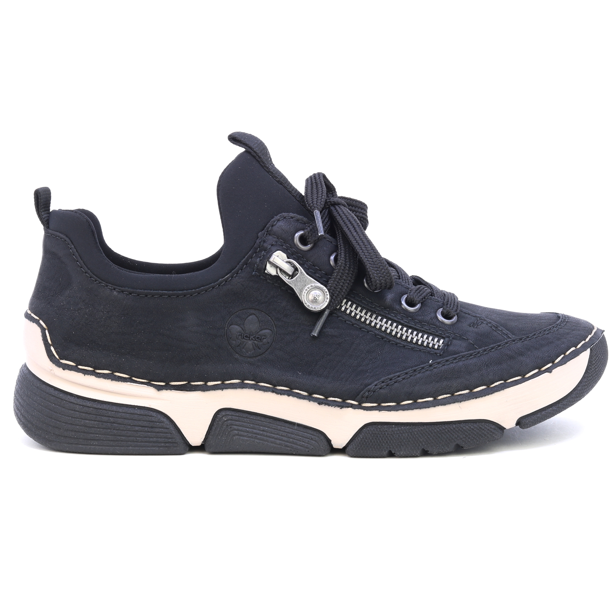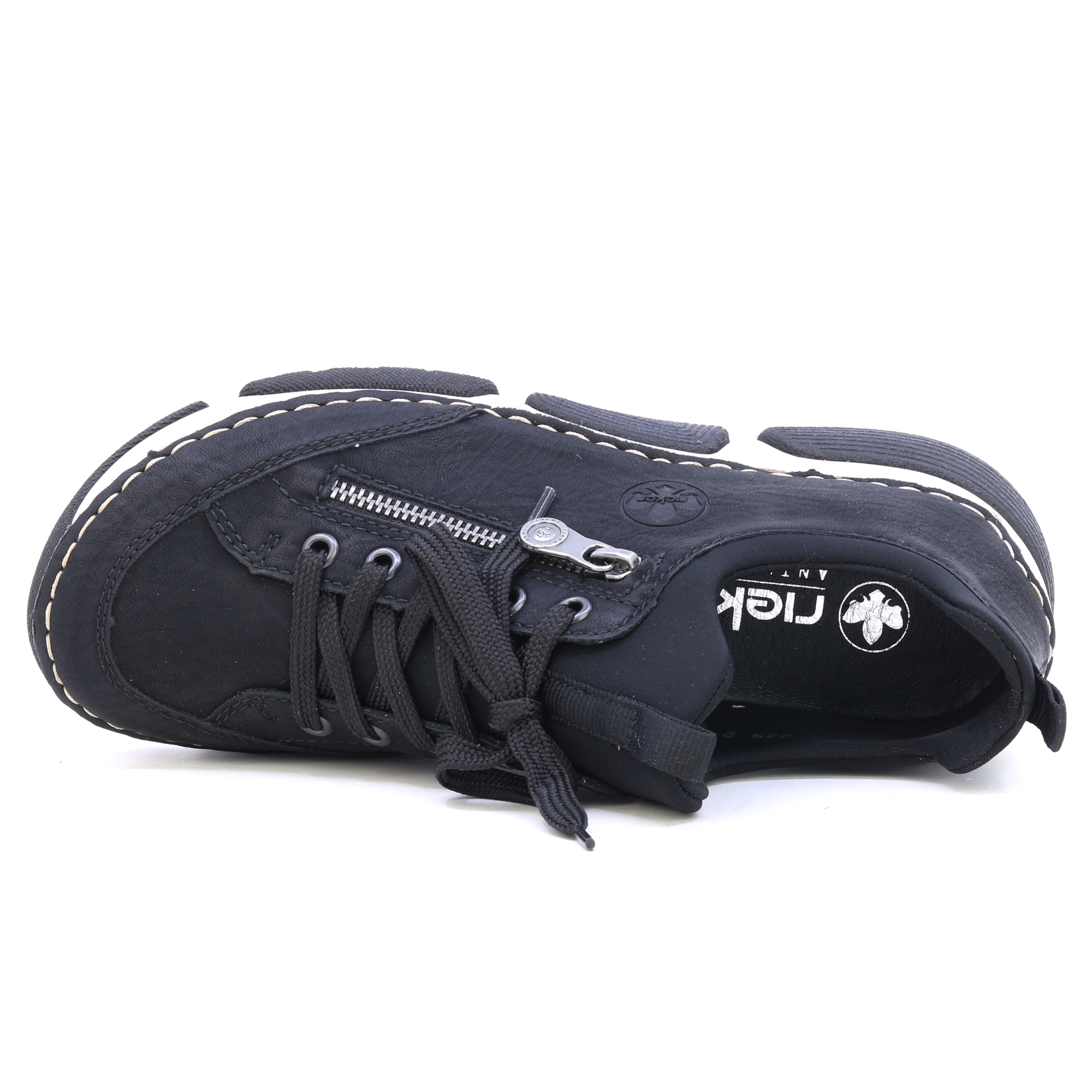 A RIEKER fekete tornacipői dekoratív cipzárral és gravírozott logóval a stílus és a praktikum kombinációját kínálják. A fekete felsőrész kontrasztban áll a modern talppal, amely a lengéscsillapító technológiának köszönhetően maximális kényelmet biztosít járás közben. A bőr talpbetét kellemes érzést biztosít a lábon, míg a felső él fűzése és rugalmas szegélye könnyű belépést és tökéletes illeszkedést tesz lehetővé. Ezek a tornacipők ideális választás a mindennapi viselethez, megbízható tartást és kényelmet biztosítanak egész nap. Technológia: Antistressz: Ez a technológia könnyedséget, rugalmasságot, tágasságot és kiváló lengéscsillapítást garantál, így hozzájárul a kényelmesebb sétához.