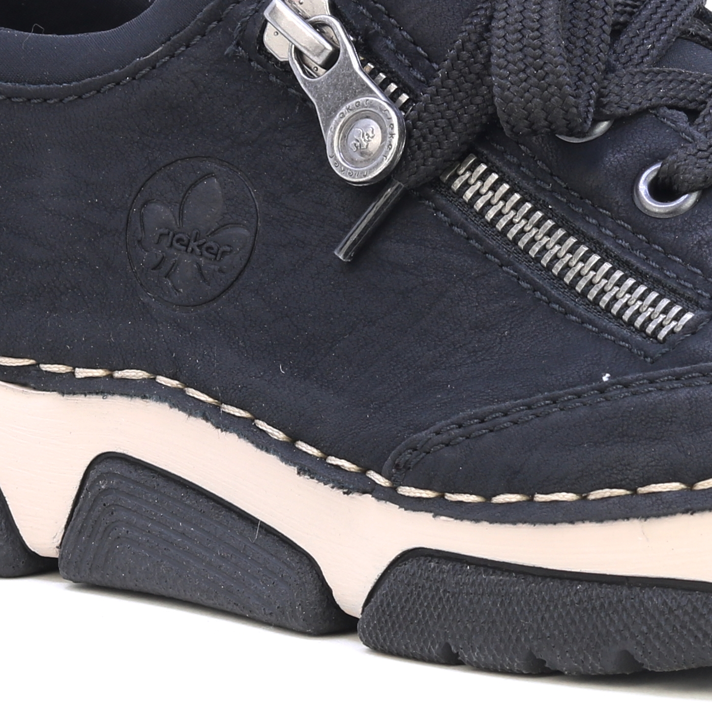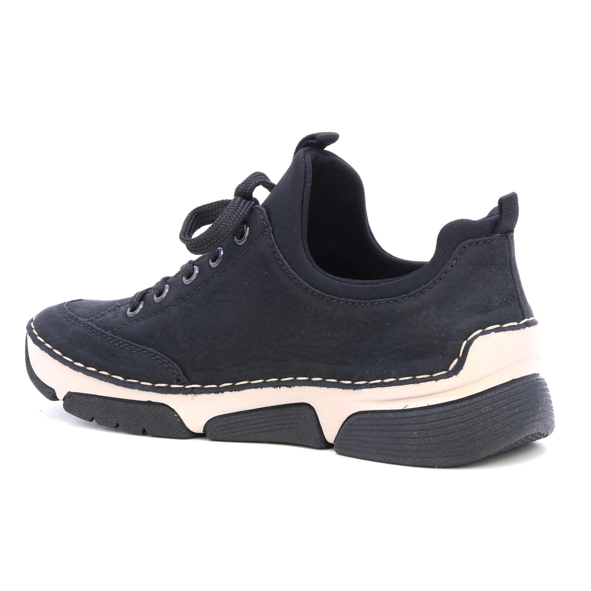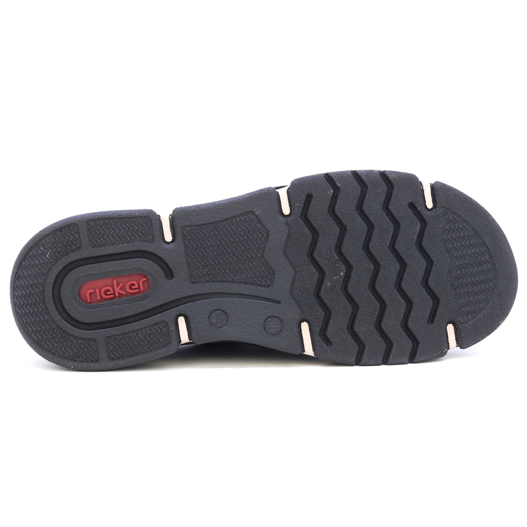 A RIEKER fekete tornacipői dekoratív cipzárral és gravírozott logóval a stílus és a praktikum kombinációját kínálják. A fekete felsőrész kontrasztban áll a modern talppal, amely a lengéscsillapító technológiának köszönhetően maximális kényelmet biztosít járás közben. A bőr talpbetét kellemes érzést biztosít a lábon, míg a felső él fűzése és rugalmas szegélye könnyű belépést és tökéletes illeszkedést tesz lehetővé. Ezek a tornacipők ideális választás a mindennapi viselethez, megbízható tartást és kényelmet biztosítanak egész nap. Technológia: Antistressz: Ez a technológia könnyedséget, rugalmasságot, tágasságot és kiváló lengéscsillapítást garantál, így hozzájárul a kényelmesebb sétához.