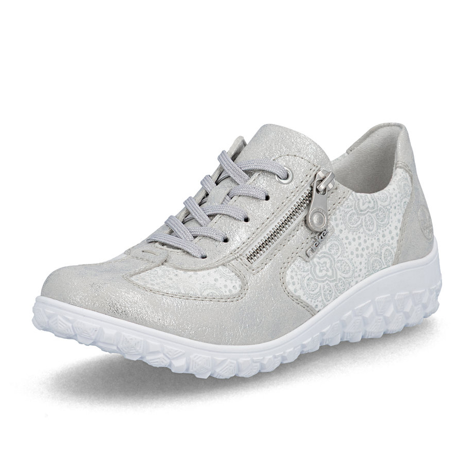 A RIEKER női félcipő elegáns ezüst színben a divatos megjelenés, a mindennapi praktikum és a kiemelkedő kényelem tökéletes kombinációja azoknak a nőknek, akik stílusos, mégis egész nap kényelmes viseletet keresnek munkába vagy városi használatra. A textil és szintetikus anyagok kombinációjából készült felsőrész látványos mintával és finom fényhatással, valamint diszkrét márkalogóval teszi egyedivé a modellt, míg a rüszt részen elhelyezett praktikus cipzár és a fűző lehetővé teszi a gyors fel- és levételt, illetve a lábformához igazodó pontos illeszkedést. Az Antistress technológia könnyűséget, rugalmasságot, tágas kialakítást és kiváló ütéscsillapítást biztosít, a kivehető RiekerSoft memóriahabos talpbetét pedig puha alátámasztást nyújt minden lépésnél. Az EXTRA WIDE H szélesség elegendő helyet kínál a láb elülső részén, a rugalmas szintetikus talp és a 3,8 cm magas stabil sarok pedig támogatja a természetes járást. A ragasztott gyártási technológia hozzájárul a cipő alacsony súlyához és tartós kényelméhez.
