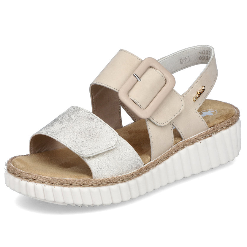 A RIEKER telitalpú szandálok tökéletes választást jelentenek a nyári napokra, kényelmet és stílust egyesítve. Egyedi színkombinációjuk finom csillogással és markáns csattal a lábfejpánton elegáns megjelenést kölcsönöz. A sarokpántnak és a széles, tépőzáras pántoknak köszönhetően könnyen személyre szabhatók. A könnyű, ütéscsillapító talp és a puha talpbetét maximális kényelmet biztosítanak viselés közben. Emellett szélesebb fazonnal rendelkeznek, így tágas helyet nyújtanak a szélesebb lábfej számára. Ezek a szandálok modern dizájnt és funkcionális technológiákat ötvöznek a tökéletes járási élmény érdekében.