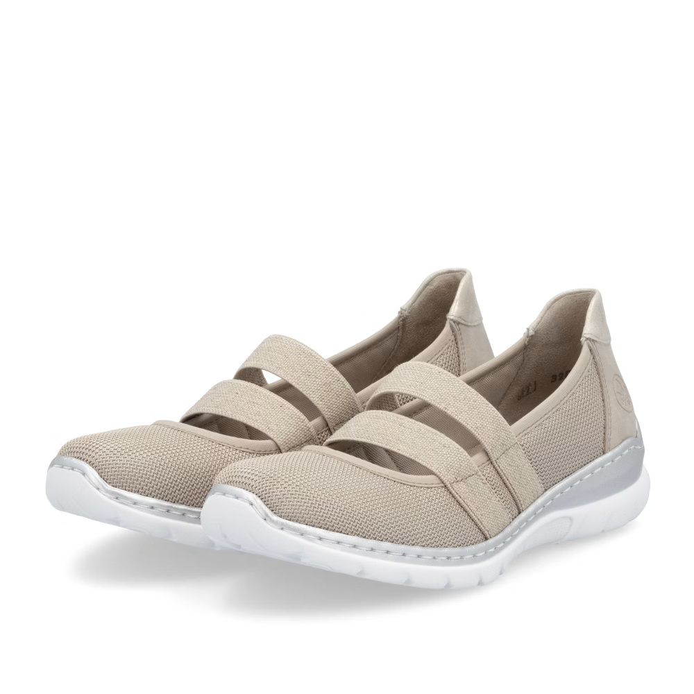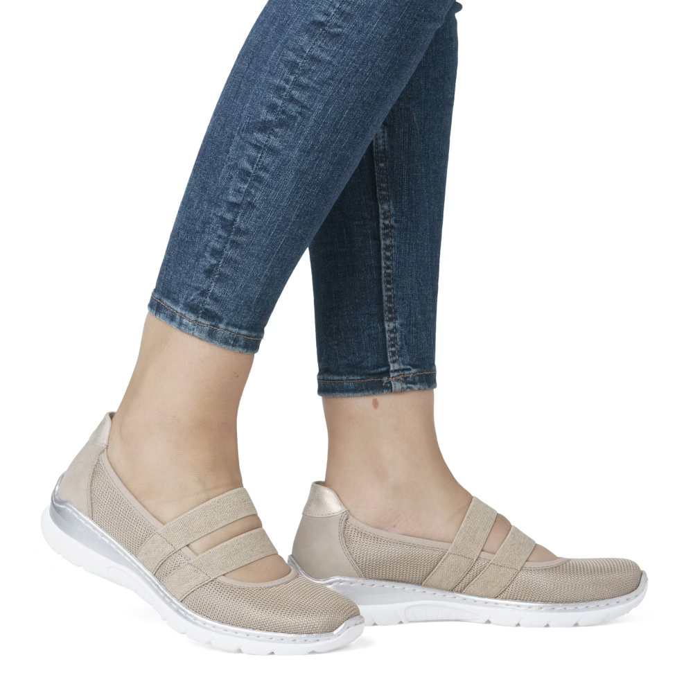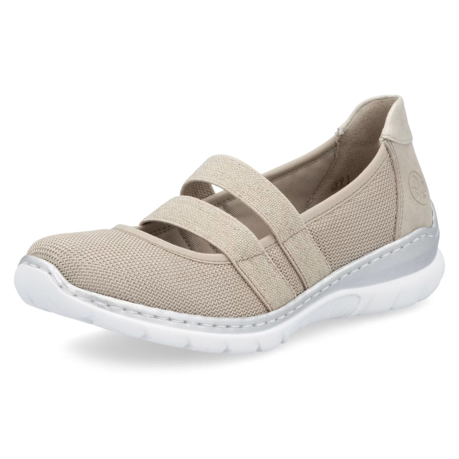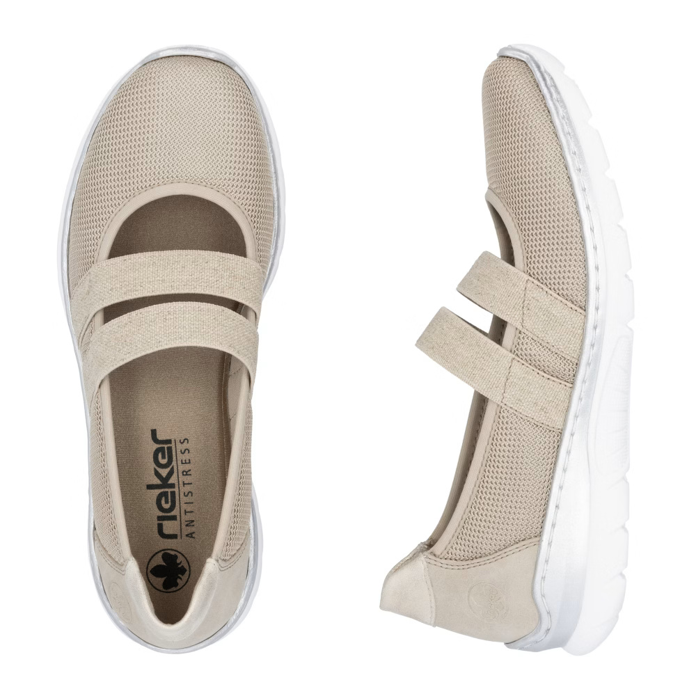 Ez a RIEKER cipő tökéletesen ötvözi a stílust és a kényelmet, miközben finom, világos árnyalatú anyagkombinációjával hódít. A rüsztön elhelyezett rugalmas pántok stabilitást biztosítanak és tökéletes illeszkedést garantálnak, míg a MemoSoft memóriahabos talpbetét puha párnázatával tompítja a lépéseket, így maximális komfortot nyújt egész nap. Az Antistress technológiával készült, könnyű és rugalmas talp természetes mozgásszabadságot biztosít és hatékonyan elnyeli az ütéseket, ezért ez a cipő ideális választás munkába és szabadidős tevékenységekhez egyaránt. Az elegáns dizájn és a kifinomult kényelmi megoldások kombinációja tökéletes viseletté teszi ezt a modellt minden nő számára, aki stílusos megjelenést és gondtalan kényelmet keres.