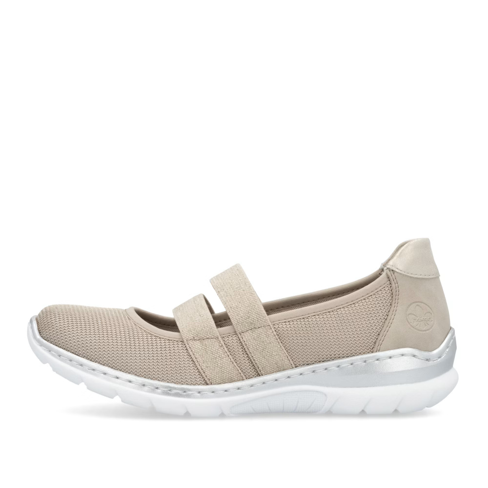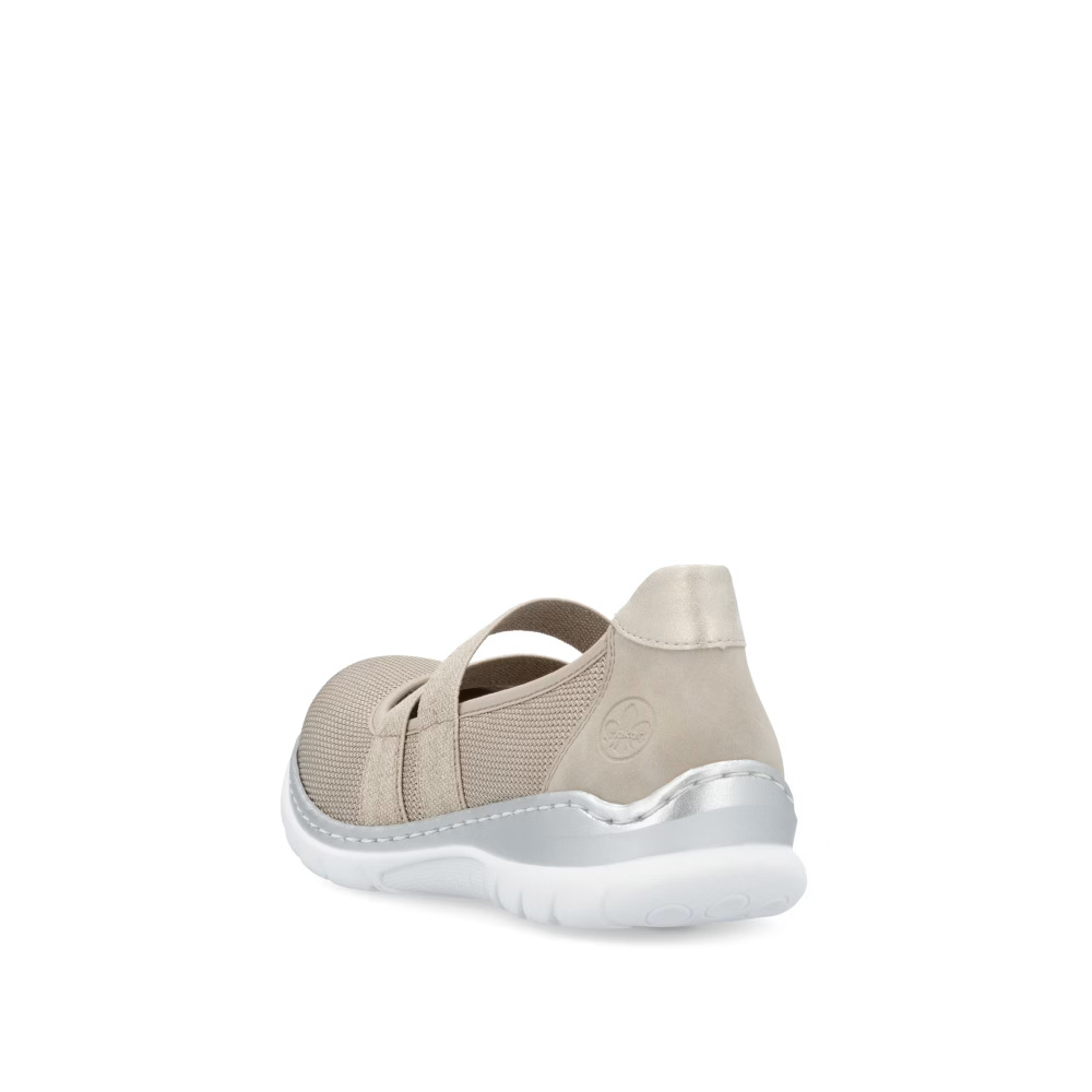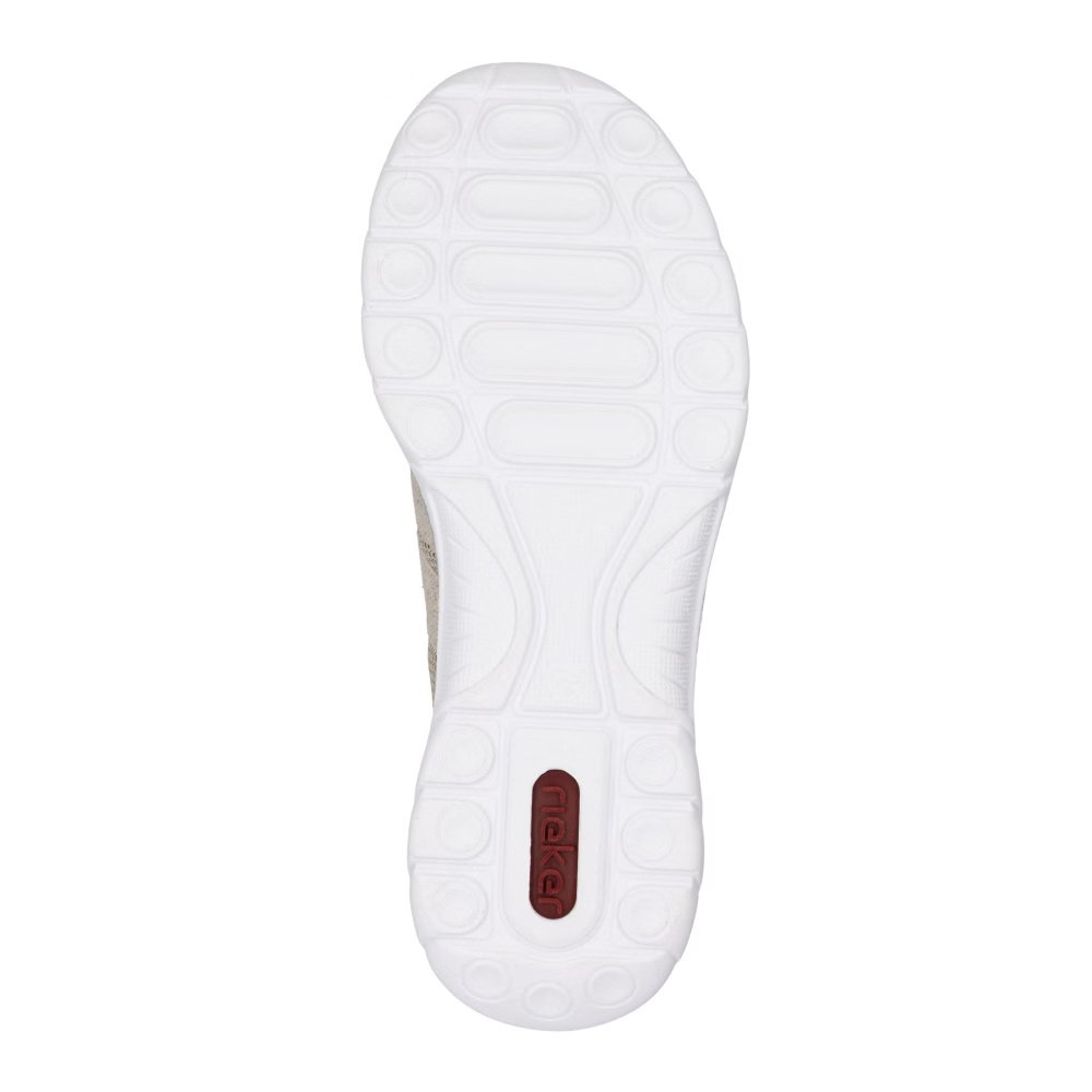 Ez a RIEKER cipő tökéletesen ötvözi a stílust és a kényelmet, miközben finom, világos árnyalatú anyagkombinációjával hódít. A rüsztön elhelyezett rugalmas pántok stabilitást biztosítanak és tökéletes illeszkedést garantálnak, míg a MemoSoft memóriahabos talpbetét puha párnázatával tompítja a lépéseket, így maximális komfortot nyújt egész nap. Az Antistress technológiával készült, könnyű és rugalmas talp természetes mozgásszabadságot biztosít és hatékonyan elnyeli az ütéseket, ezért ez a cipő ideális választás munkába és szabadidős tevékenységekhez egyaránt. Az elegáns dizájn és a kifinomult kényelmi megoldások kombinációja tökéletes viseletté teszi ezt a modellt minden nő számára, aki stílusos megjelenést és gondtalan kényelmet keres.