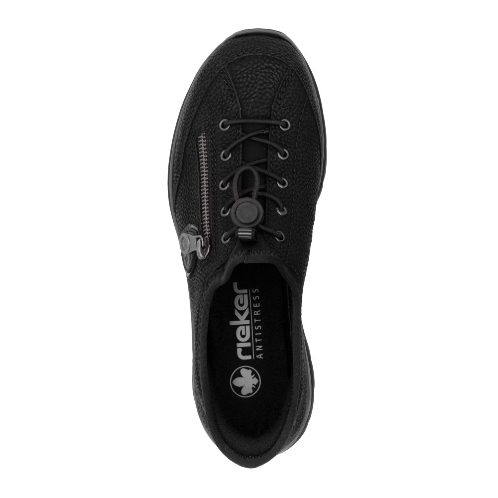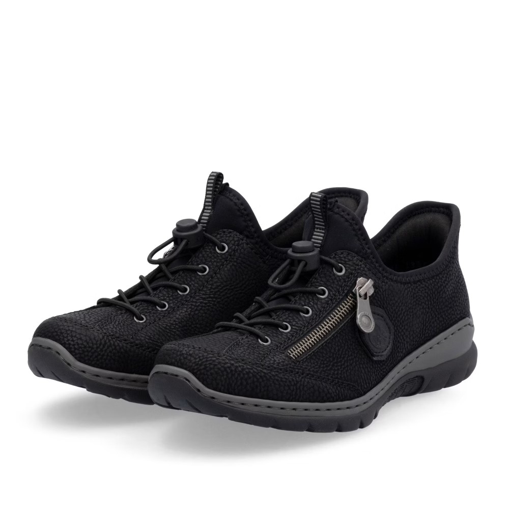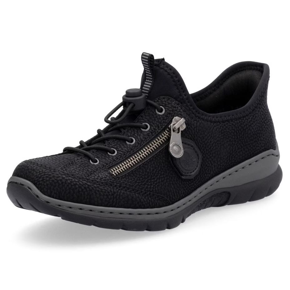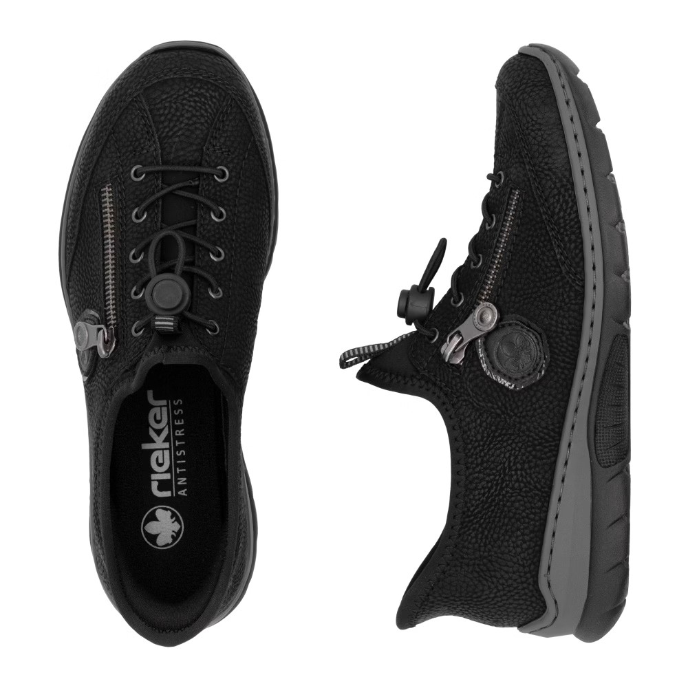 Fedezd fel a kényelmet az időtlen fekete színben – a RIEKER cipők modern dizájnt ötvöznek páratlan komforttal. Kiváló minőségű anyagok és precíz kidolgozás gondoskodnak a mindennapi kényelemről, míg a felső perem rugalmas betétje megkönnyíti a felhúzást. Az esztétikus gumis fűző és a praktikus cipzár elegáns megjelenést biztosítanak, míg a MemoSoft memóriahabos talpbetét tökéletesen alkalmazkodik a láb formájához. Az Antistress technológia könnyedséget, rugalmasságot és kiváló ütéselnyelést nyújt, így minden lépés maximális kényelmet biztosít. Ez a modell ideális választás a mindennapokra, akár munkába, akár szabadidős tevékenységekhez, és a Ready2GO technológiának köszönhetően rendkívül könnyen felvehető.