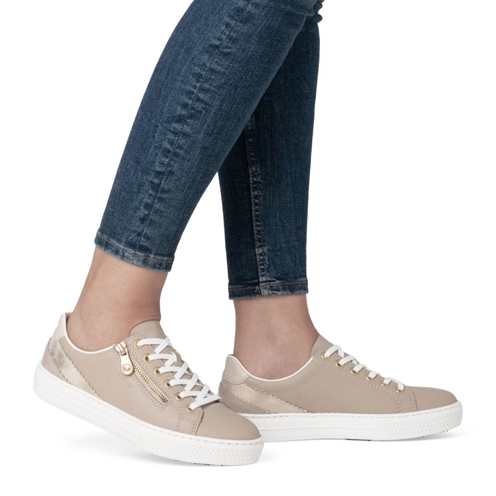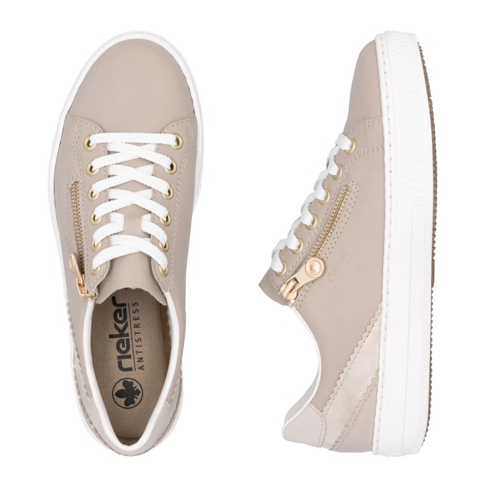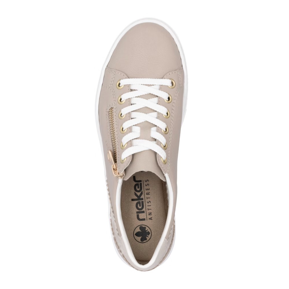 A RIEKER bézs színű, stílusos sportcipői tökéletes választást jelentenek azoknak a hölgyeknek, akik a divatos megjelenést és a maximális kényelmet keresik egy cipőben. A sarokrészen található fémes részlet kifinomult eleganciát kölcsönöz a cipőnek, míg a RIEKER logó a minőség és megbízhatóság garanciája. A praktikus rüsztcipzár megkönnyíti a gyors felhúzást, míg a fűzők lehetővé teszik az optimális illeszkedést és stabil tartást. A stabil talprész biztosítja a megfelelő alátámasztást és kényelmet minden lépésnél. A MemoSoft memóriahabos talpbetét egyedülálló kényelmet nyújt, mivel alkalmazkodik a láb formájához és puhává teszi a járást. Ezek a sportcipők ideális választásnak bizonyulnak a mindennapi viselethez, legyen szó munkáról, városi sétáról vagy szabadidős tevékenységekről. Technológia: Antistress – a könnyű, rugalmas és tágas talpszerkezet elnyeli az ütéseket és kényelmes járást biztosít. MemoSoft – memóriahabos talpbetét, amely alkalmazkodik a láb formájához és extra puhaságot nyújt.