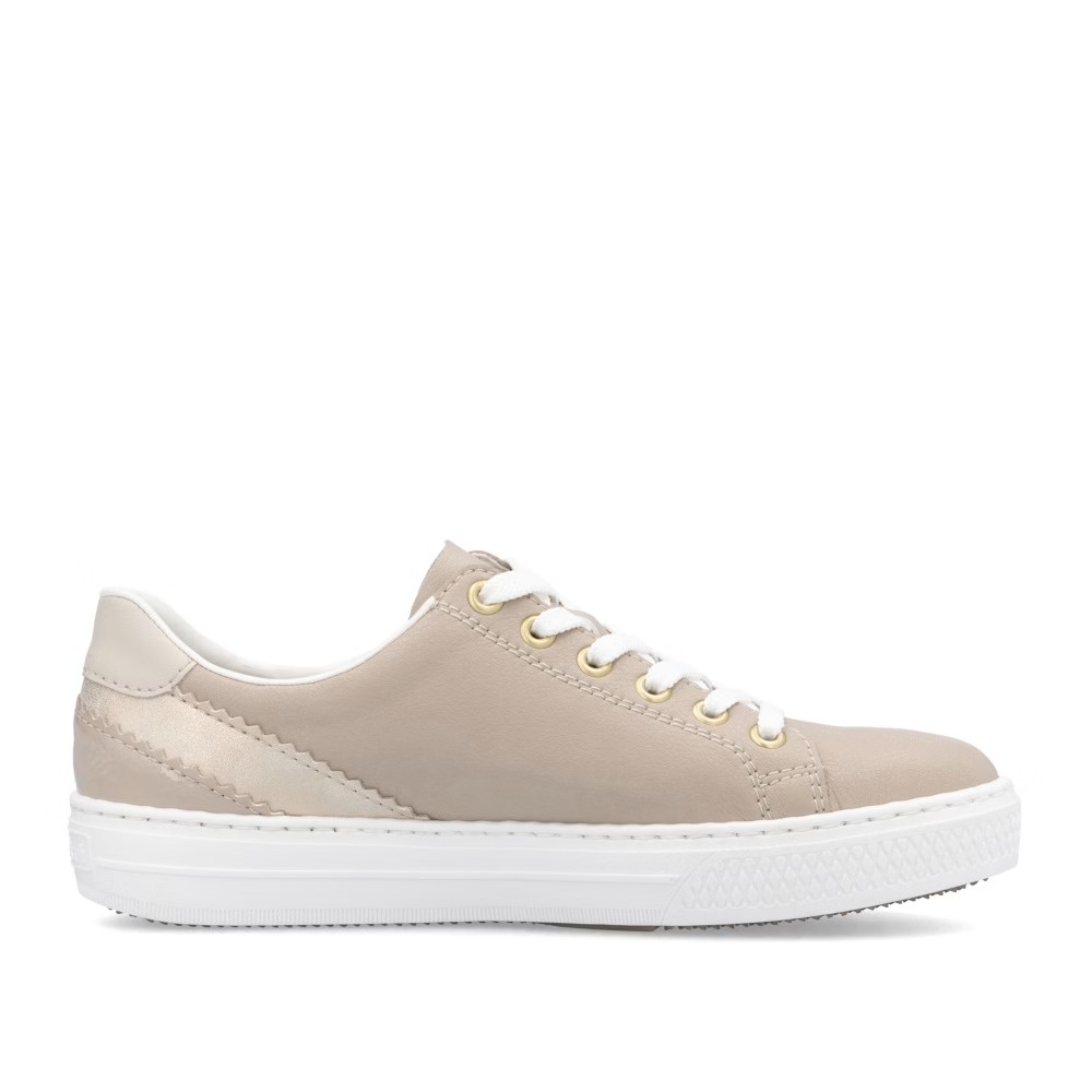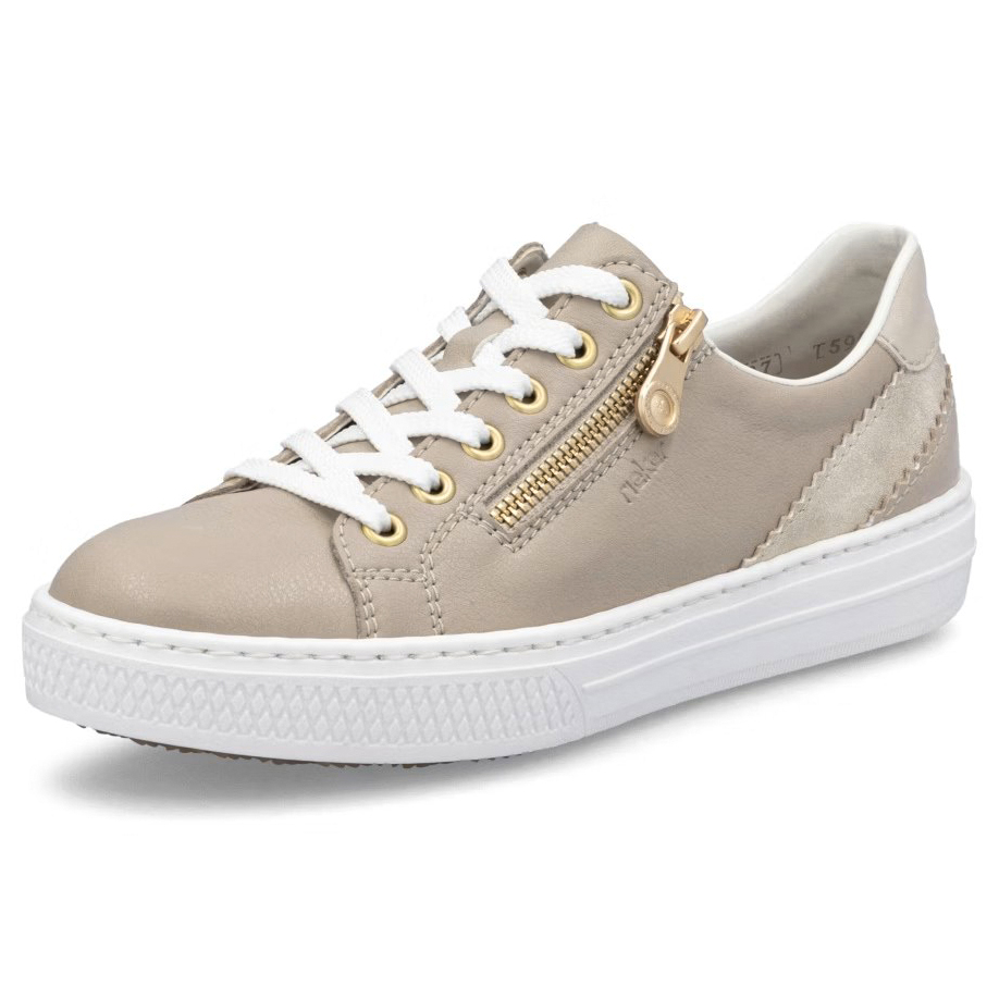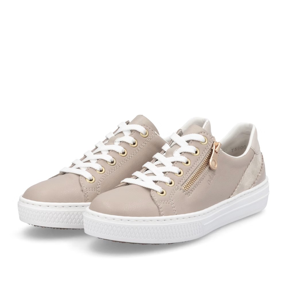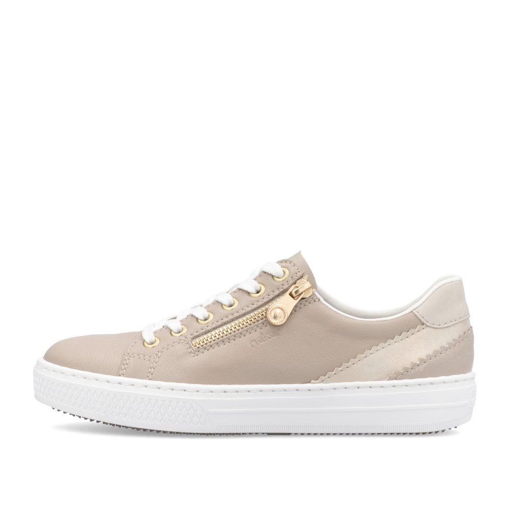 A RIEKER bézs színű, stílusos sportcipői tökéletes választást jelentenek azoknak a hölgyeknek, akik a divatos megjelenést és a maximális kényelmet keresik egy cipőben. A sarokrészen található fémes részlet kifinomult eleganciát kölcsönöz a cipőnek, míg a RIEKER logó a minőség és megbízhatóság garanciája. A praktikus rüsztcipzár megkönnyíti a gyors felhúzást, míg a fűzők lehetővé teszik az optimális illeszkedést és stabil tartást. A stabil talprész biztosítja a megfelelő alátámasztást és kényelmet minden lépésnél. A MemoSoft memóriahabos talpbetét egyedülálló kényelmet nyújt, mivel alkalmazkodik a láb formájához és puhává teszi a járást. Ezek a sportcipők ideális választásnak bizonyulnak a mindennapi viselethez, legyen szó munkáról, városi sétáról vagy szabadidős tevékenységekről. Technológia: Antistress – a könnyű, rugalmas és tágas talpszerkezet elnyeli az ütéseket és kényelmes járást biztosít. MemoSoft – memóriahabos talpbetét, amely alkalmazkodik a láb formájához és extra puhaságot nyújt.