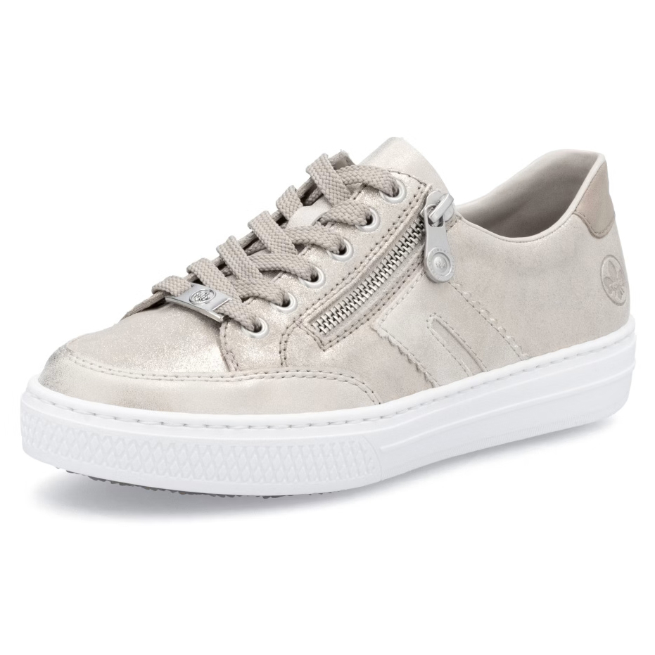 A ragyogó RIEKER tornacipők aranyszínű árnyalatban nemcsak modern megjelenésükkel, hanem elegáns díszítőelemeikkel is lenyűgöznek. A praktikus cipzár a rüsztnél megkönnyíti a fel- és levételt, míg a fűzők tökéletes illeszkedést biztosítanak a láb formájához. A MemoSoft memóriahabos talpbetét kiváló kényelmet nyújt és minden lépésnél elnyeli az ütődéseket, így egész napos viselet során is maximális komfortot garantál. A magasabb talp nemcsak a stabilitást növeli, hanem divatos megjelenést is kölcsönöz a cipőnek. Ezek a tornacipők ideálisak a mindennapi viselethez – akár a városban, akár szabadidős programokhoz vagy könnyed sporttevékenységekhez. Az Antistress és MemoSoft technológiáknak köszönhetően ötvözik a divatos dizájnt a maximális kényelemmel.