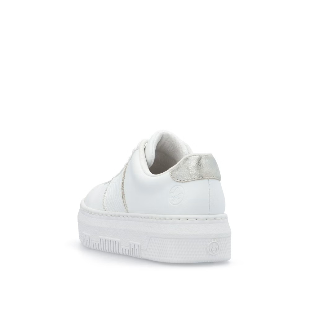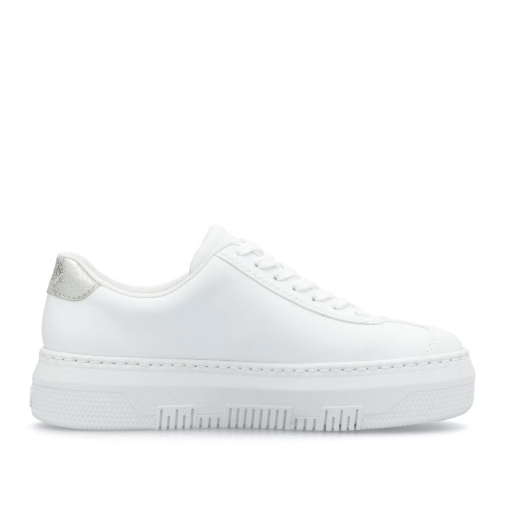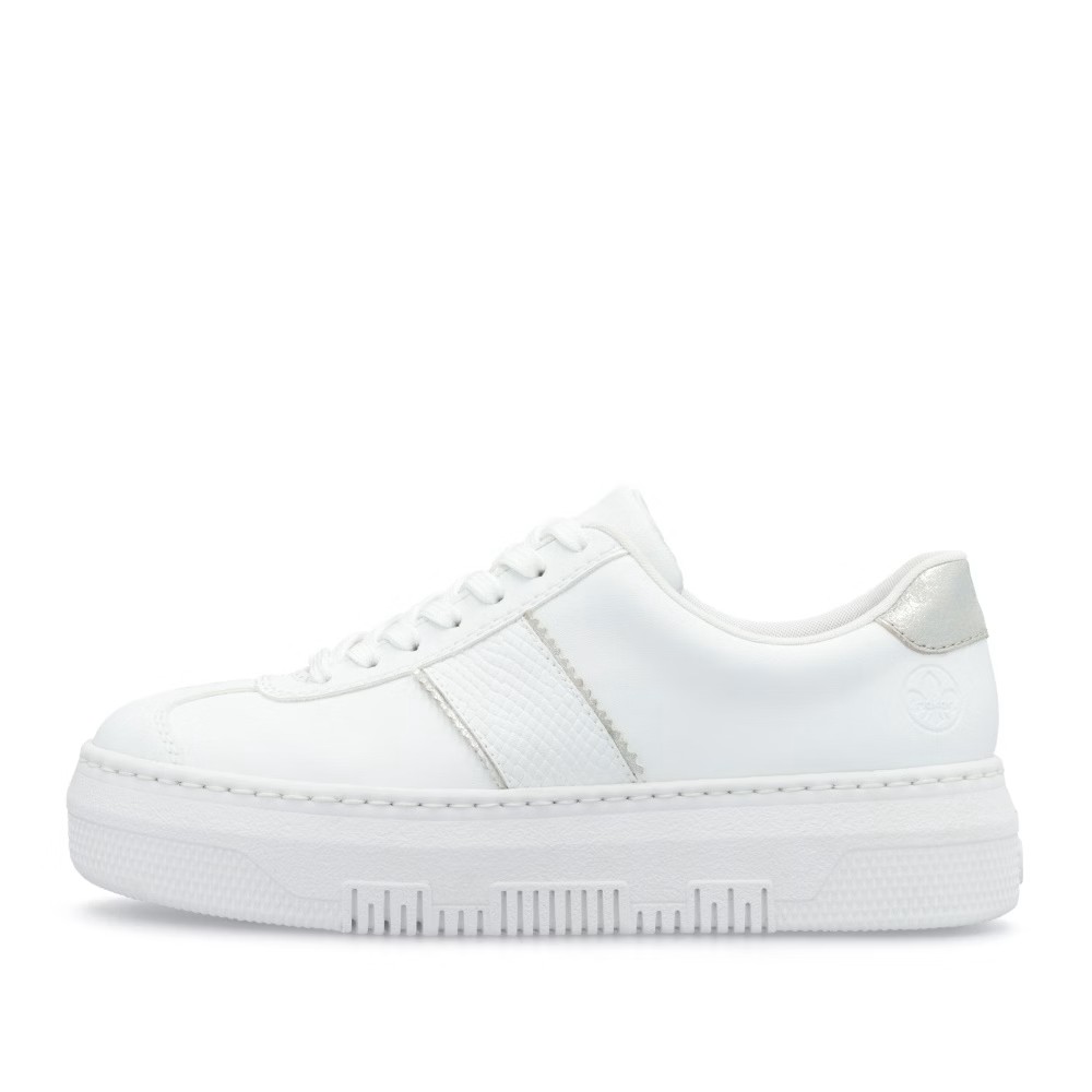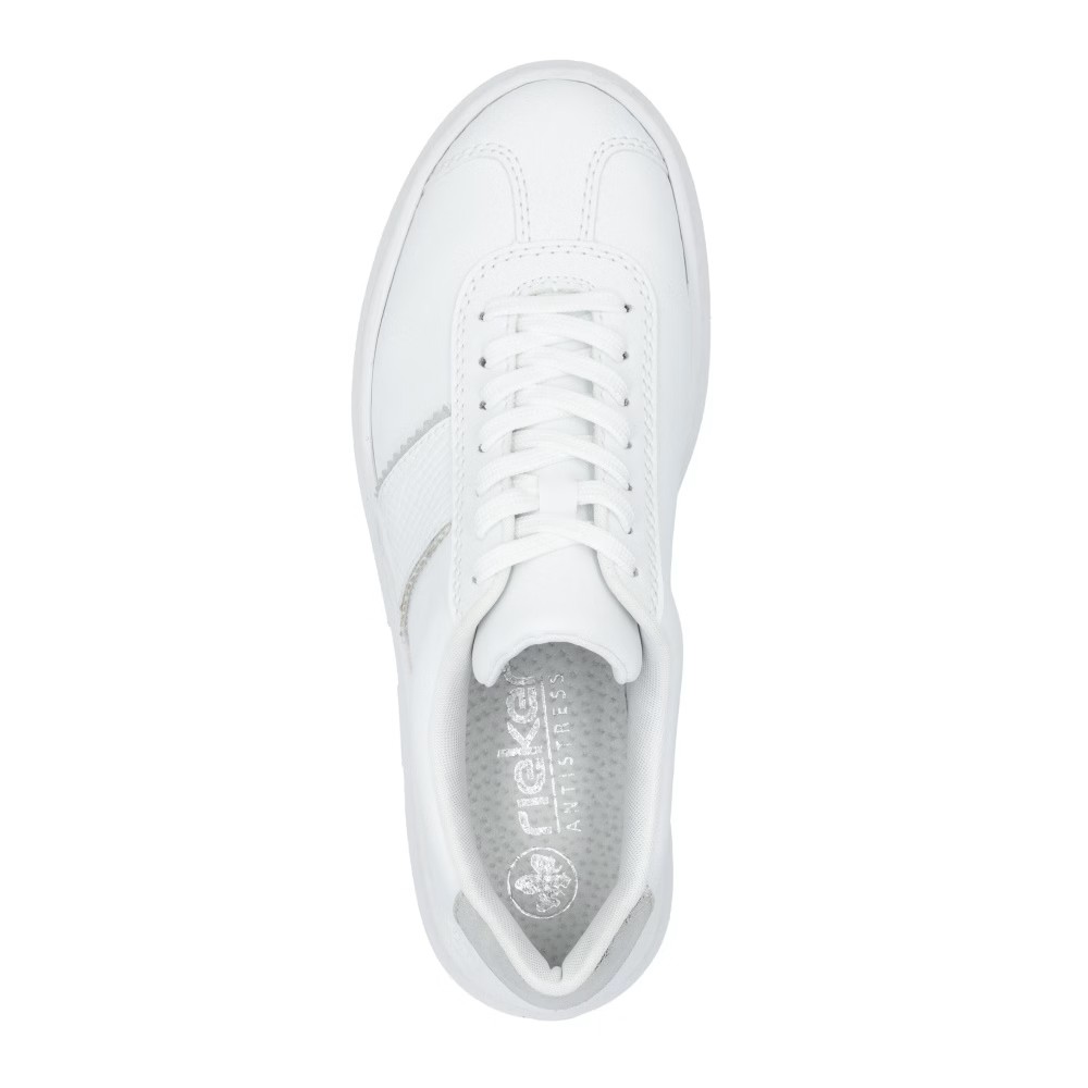 Ez a sportcipő tökéletes választás a modern nő számára, aki egyszerre keres stílust, kényelmet és praktikusságot. A cipő kifinomult részletei, például a fémes sarokrész és az oldalán található finom minta elegáns és divatos megjelenést kölcsönöznek neki. A fűzők segítségével könnyen felvehető, valamint a láb szélességéhez igazítható, ami maximális kényelmet biztosít. A robusztus, mégis könnyű talp nemcsak a dizájnt egészíti ki, hanem stabilitást és támaszt is nyújt járás közben. A kiváló minőségű anyagok és az innovatív technológiák révén ez a sportcipő ideális választás a mindennapokra – tökéletesen kiegészíti az öltözékedet, miközben egész nap könnyedséget és kényelmet biztosít. Az Antistress technológia négy kulcsfontosságú tulajdonságával – könnyedség, rugalmasság, tágasság és kiváló ütéselnyelés – kényelmesebb járást biztosít. A RIEKER Lite technológia a könnyű talpat és a puha talpbetétet kombinálja, így olyan érzést nyújt, mintha felhőkön járnál.