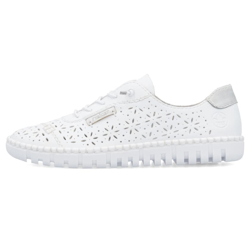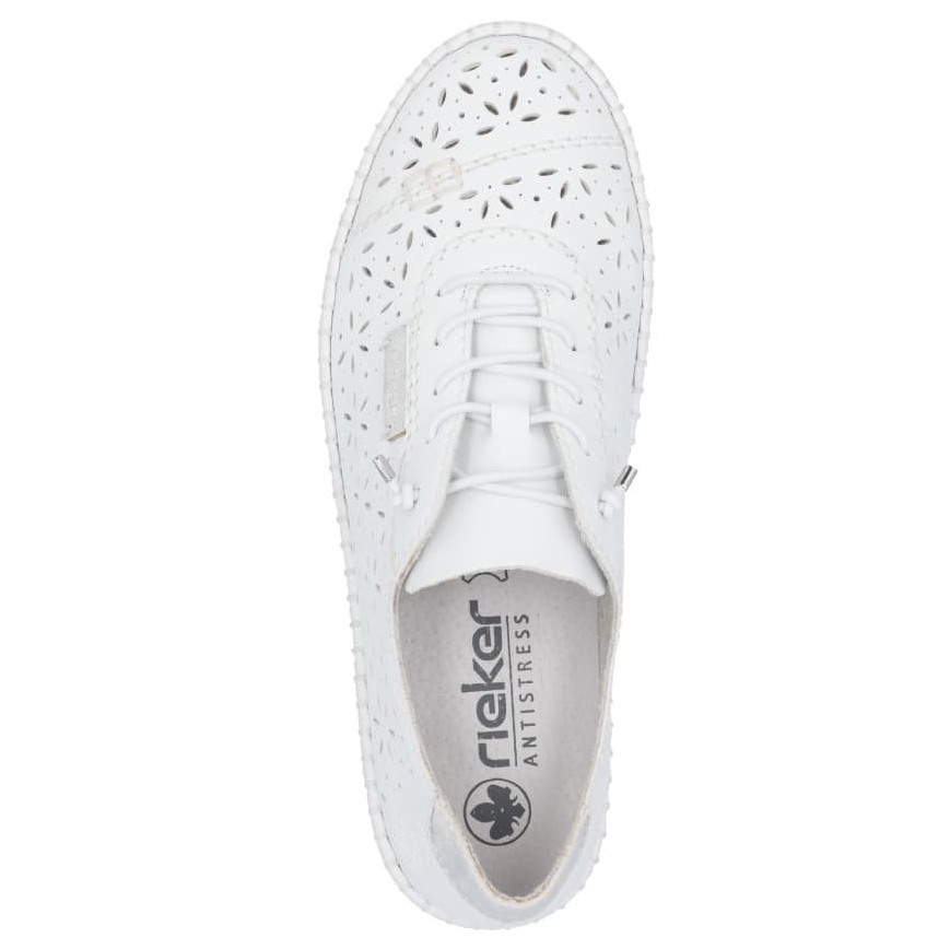 Ezek a RIEKER sportcipők stílust és kényelmet ötvöznek modern megjelenéssel. A fehér szintetikus bőr felsőrész finom kivágásokkal díszített, amelyek nemcsak esztétikus megjelenést biztosítanak, hanem fokozzák a szellőzést is. A rugalmas gumipántok a rüszt részen lehetővé teszik a cipő tökéletes illeszkedését és megkönnyítik a felhúzást. A belső rész extra puha bőr talpbetéttel van ellátva, amely egész napos kényelmet biztosít. Az Antistress technológia könnyedséget, rugalmasságot és megfelelő térérzetet nyújt, miközben hatékonyan csökkenti az ütéseket, így óvva a gerincet járás közben.