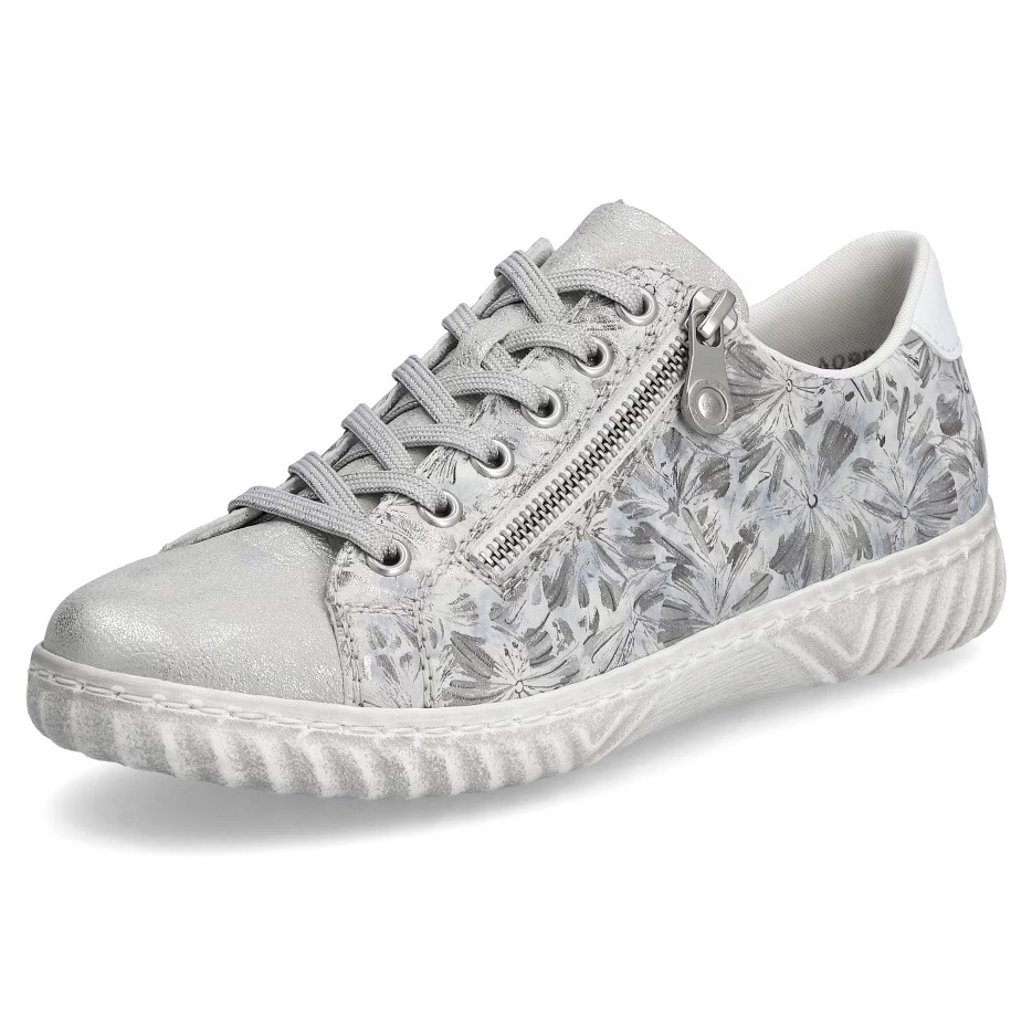 A RIEKER stílusos női cipője elegáns ezüst árnyalatban modern csillogásával és gyönyörű mintázatú felsőrészével vonzza a tekintetet. A fűzőrendszer lehetővé teszi a tökéletes illeszkedést, míg a praktikus cipzár a lábfejen megkönnyíti a fel- és levételt. A rugalmas talp természetes mozgást és kényelmes járást biztosít, míg a puha bőrbélés maximális komfortot nyújt egész nap. Ez a sneaker tökéletes választás azoknak a nőknek, akik az eleganciát és a kényelmet egyaránt fontosnak tartják, és könnyedén kombinálható nadrággal vagy szoknyával, hogy stílusos megjelenést kölcsönözzön.