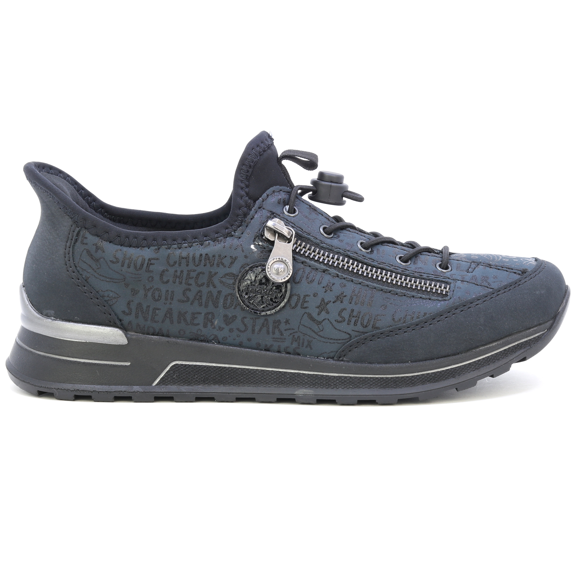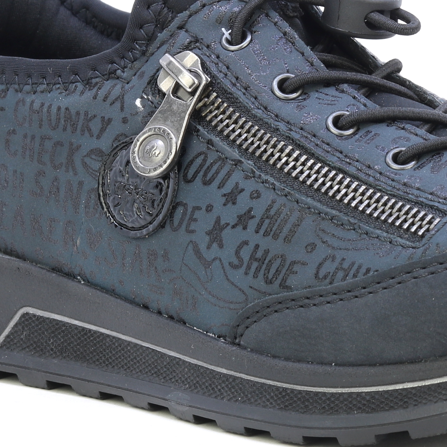 Ezek az egyedi RIEKER tornacipők a sötétkék szín és az egyedi nyomat, a dekoratív cipzár és a márkalogó kombinációját kínálják, ez a kombináció egy kis eredetiséget ad a cipőknek. A rugalmas fűzés és a rugalmas felső szél lehetővé teszi a könnyű fel- és levételt. A puha, kivehető talpbetét és a rugalmas talp maximális kényelmet és támogatást biztosít egész nap. Ezek a tornacipők nem csak stílusosak, de praktikusak is a mindennapi viselethez. Technológia: Antistressz - négy antistressz tulajdonságának köszönhetően - könnyedség, rugalmasság, tágasság és kiváló ütéselnyelés - a RIEKER cipők kényelmesebb sétát kínálnak.