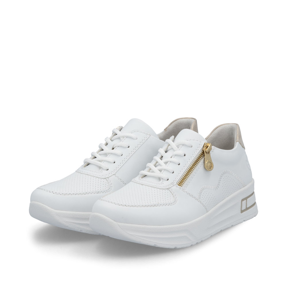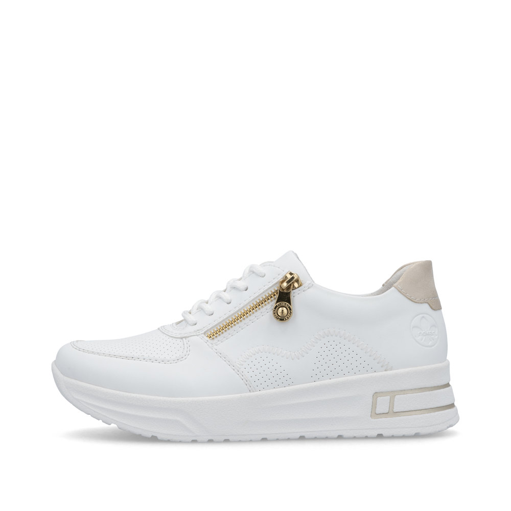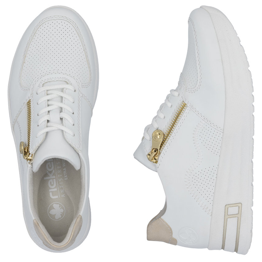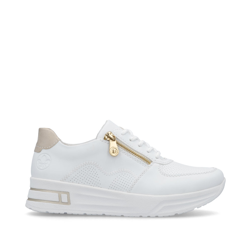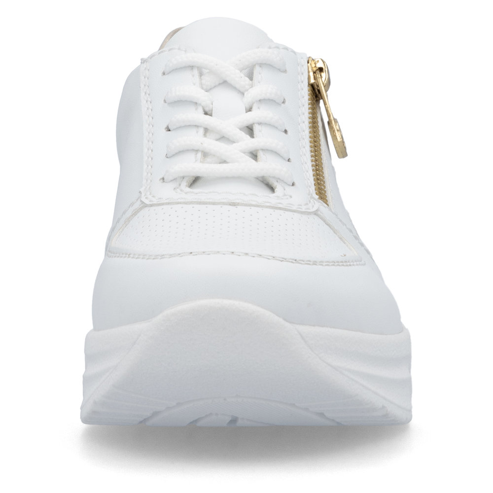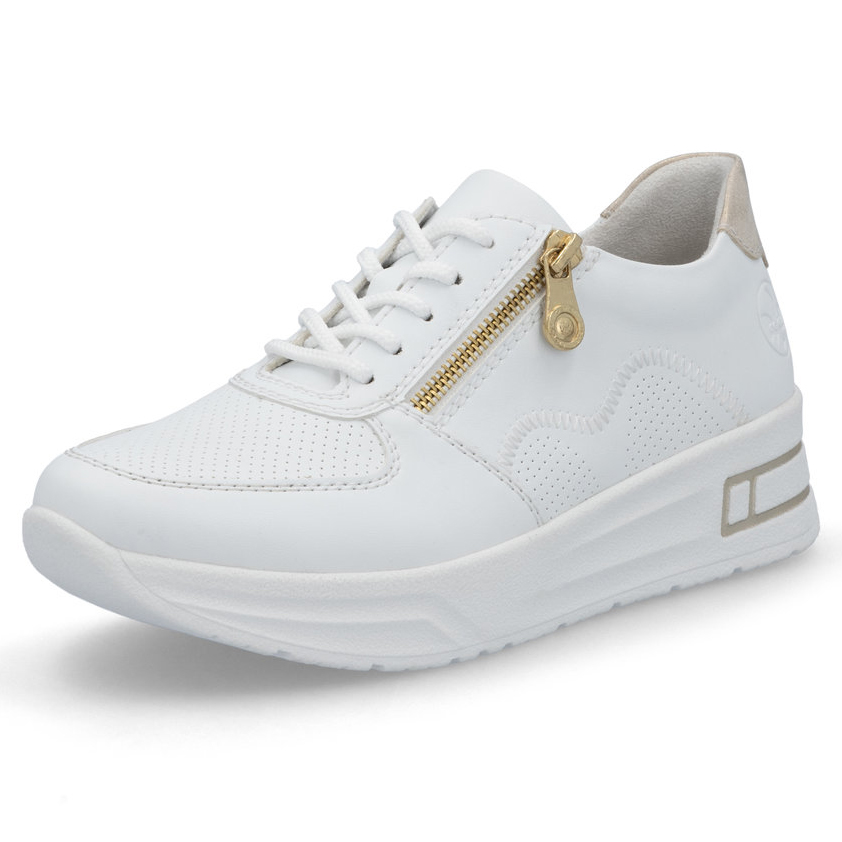 Fedezze fel a stílus és kényelem tökéletes kombinációját a RIEKER fehér tornacipőivel, amelyek elegáns kivitelezésükkel és kifinomult részleteikkel tűnnek ki. A finom perforáció a felsőrészen nemcsak modern megjelenést kölcsönöz, hanem optimális szellőzést is biztosít. Az arany sarokrész luxusérzetet ad a cipőnek, míg a fűzős és cipzáras kialakítás megkönnyíti a felvételt és tökéletes illeszkedést biztosít. A rugalmas talp puha lépést és maximális kényelmet nyújt, a kivehető talpbetét pedig extra komfortot biztosít. Ezek a tornacipők tökéletes választás azoknak a nőknek, akik divatos és kényelmes lábbelit keresnek a mindennapokra.