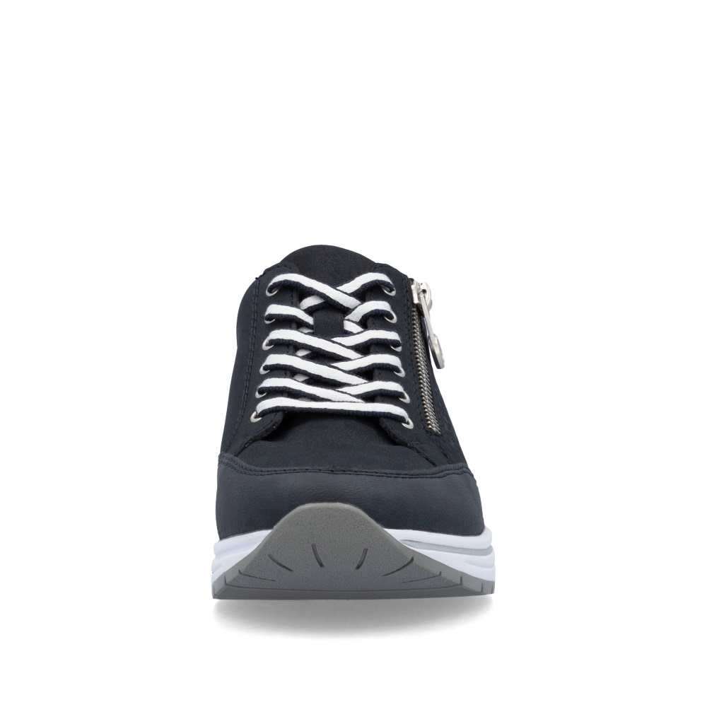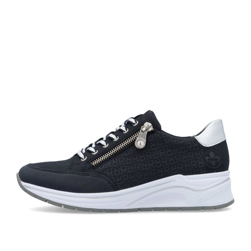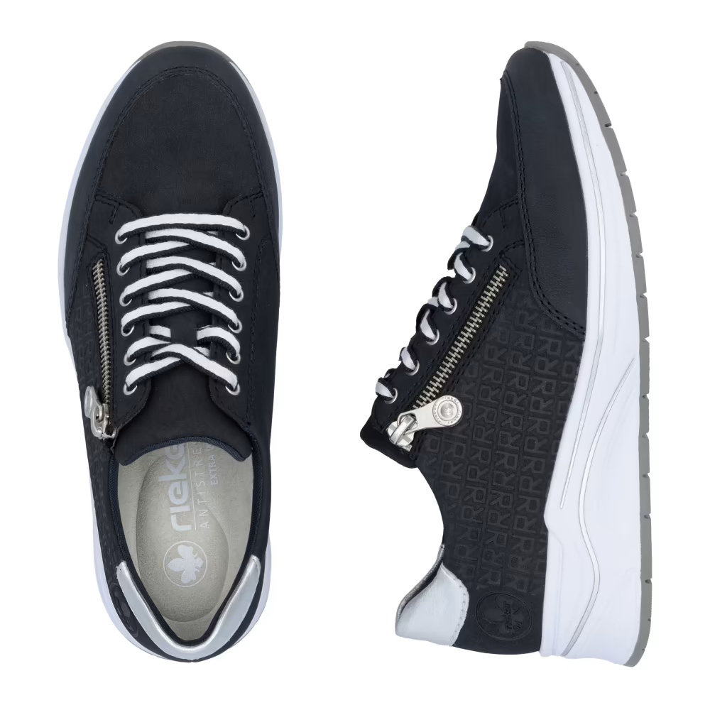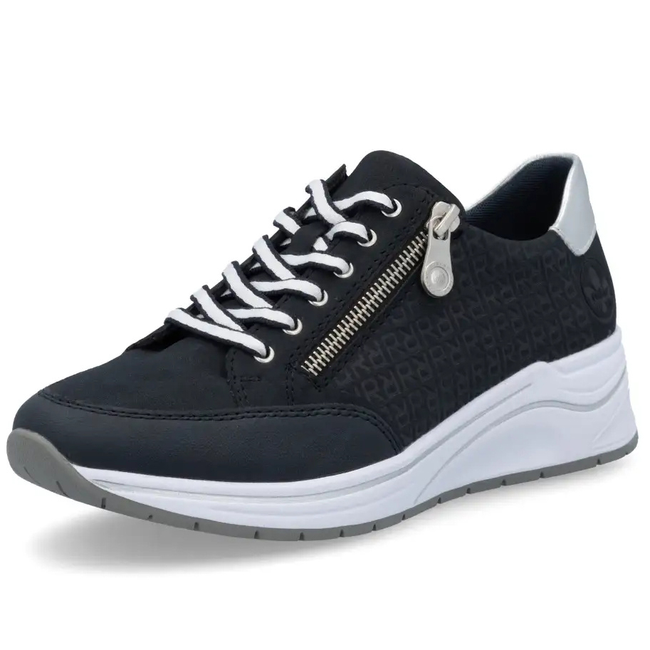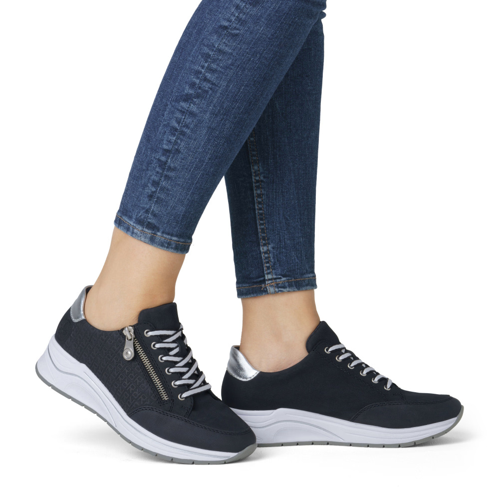 A RIEKER sportcipők egyedülálló stílust és maximális kényelmet kínálnak, amely minden lépésnél nagyszerű élményt nyújt. A sötétkék felsőrész finom márka logó alkalmazásával és a saroknál található fémes elemmel modern és divatos megjelenést biztosít. Az átgondolt tervezésnek és a kiváló minőségű anyagoknak köszönhetően ezek a sportcipők ideális választássá válnak a mindennapi viseletre. A felsőrészi fűző és a praktikus cipzár nemcsak figyelemfelkeltő vizuális hatást biztosítanak, hanem megkönnyítik a cipő felvételét is. A puha, kivehető talpbetét biztosítja a kényelmet és a támogatást minden lépésnél, míg a talp hatékonyan tompítja a lépések során fellépő ütéseket és stílusos megjelenést kölcsönöz. Ez a modell ideális választás minden napra, amikor a kényelmet és a stílust szeretnéd ötvözni.