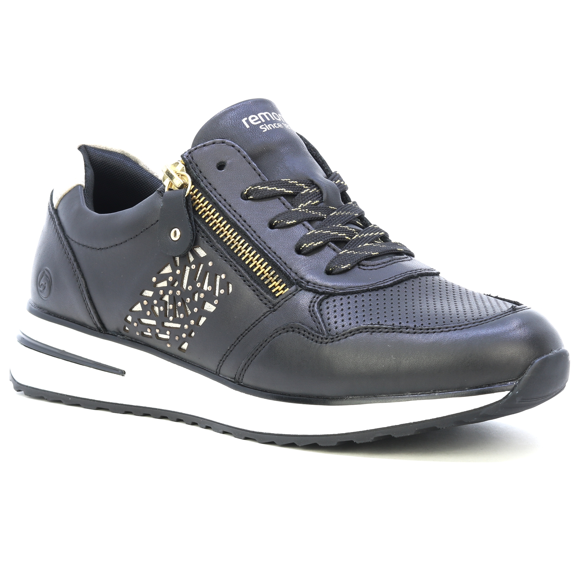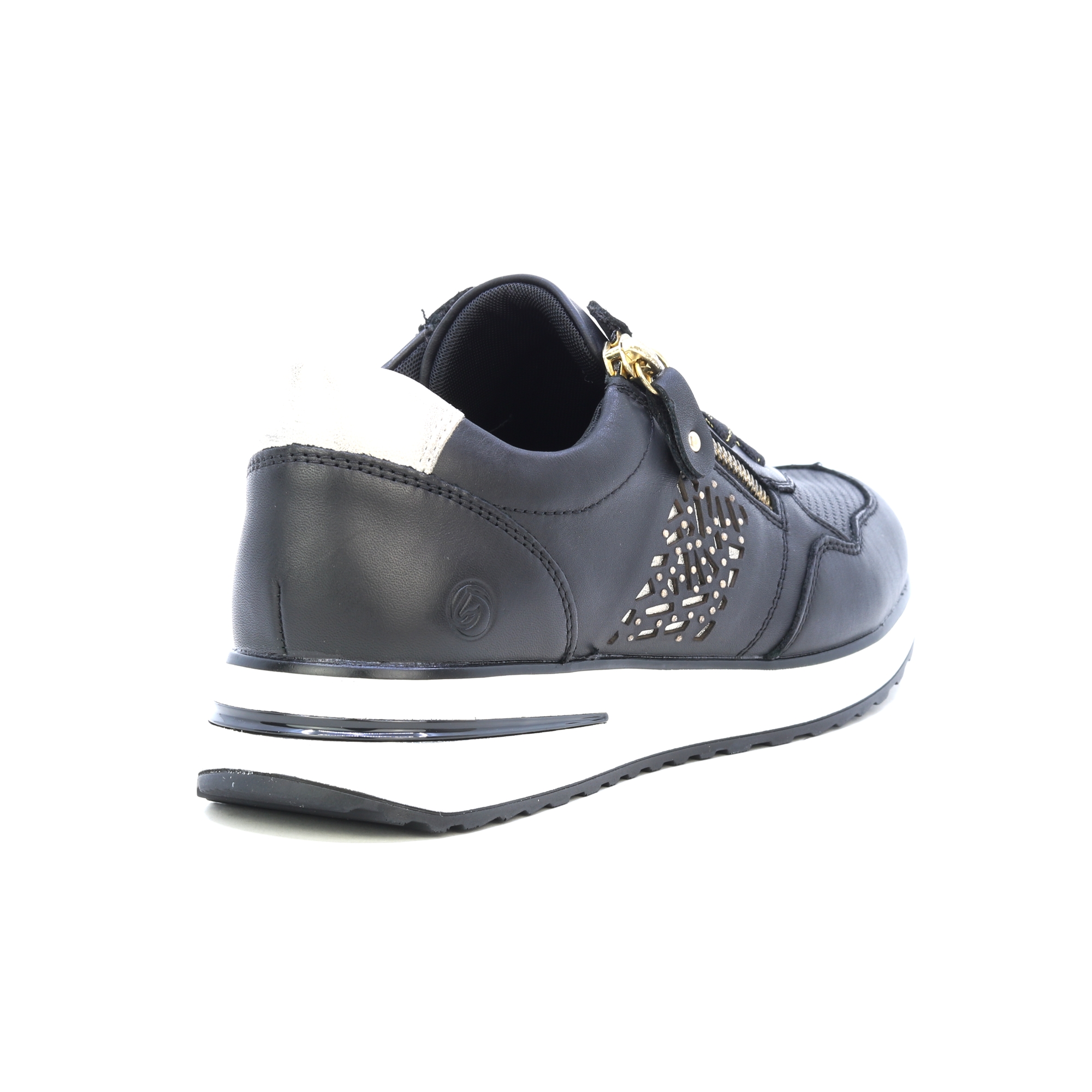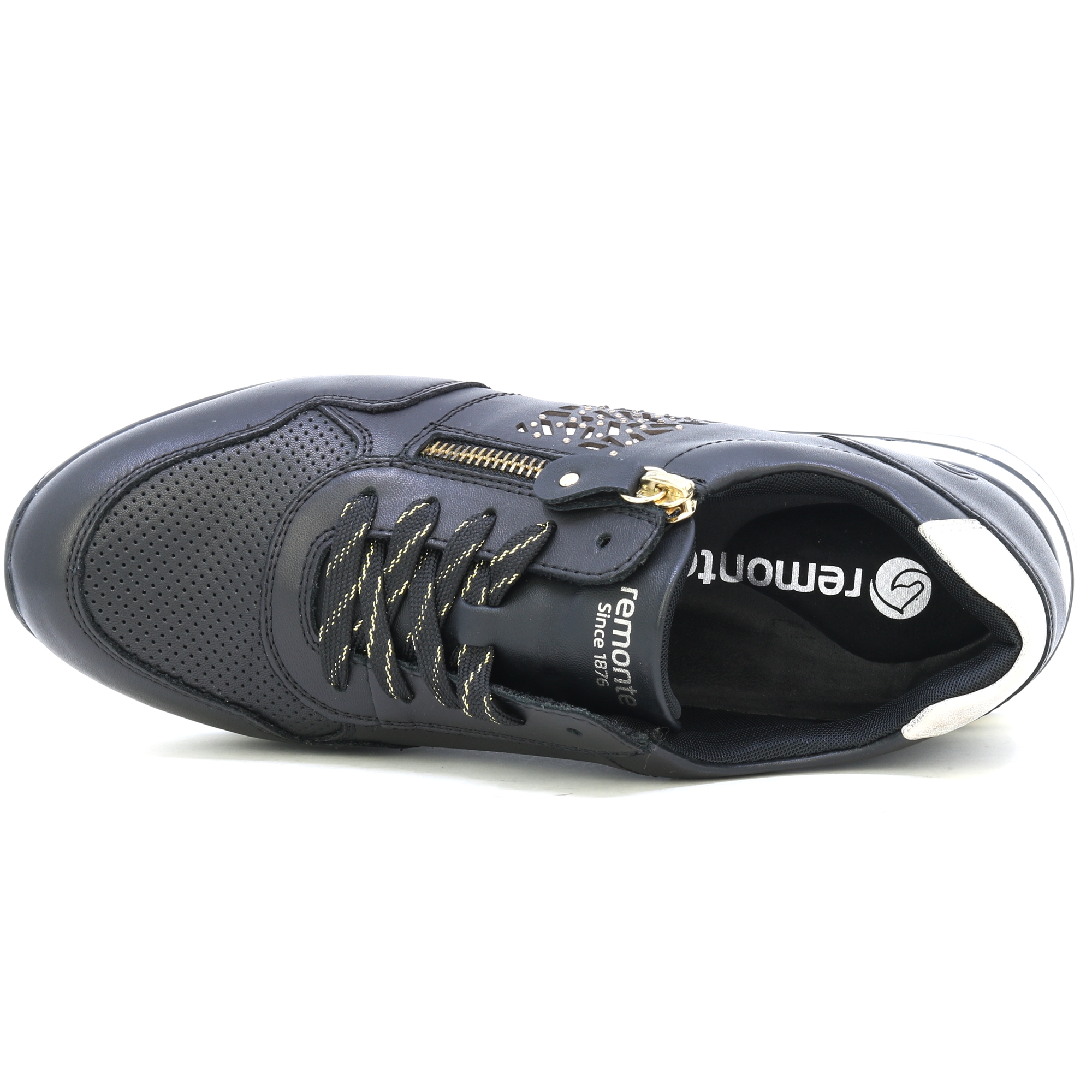 REMONTE cipő - ez a RIEKER márka magasabb vonala, ezt a cipőt a felső anyagok kiváló kombinációja jellemzi. Ezek a fekete RIEKER cipők a divatos elegancia és kényelem nagyszerű képviselői. Az oldalrész lenyűgöző elemével és az elülső részének finom perforációjával egyedi design elemet alkot. A fűzés és a cipzár kombinációja megkönnyíti a felhelyezést és a lábhoz való alkalmazkodást. A puha, kivehető talpbetét kényelmet biztosít és alkalmazkodik a láb formájához. Ez azt jelenti, hogy személyre szabhatja a cipőt egyéni igényei szerint. Ezek az összetéveszthetetlen RIEKER cipők ideális választás azoknak a nőknek, akik a jellegzetes dizájn és kényelem kombinációját keresik. Technológia: Remonte Soft – egyedülálló, lélegző anyagból készült talpbetét, mely formájával és anyagával komfortérzetet biztosít az egész napos viselet során. Ez a cipő kivehető talpbetéttel van felszerelve. Lite'n Soft - a könnyű talp és a puha talpbetét kombinációja biztosítja a felhőkön járás érzését.