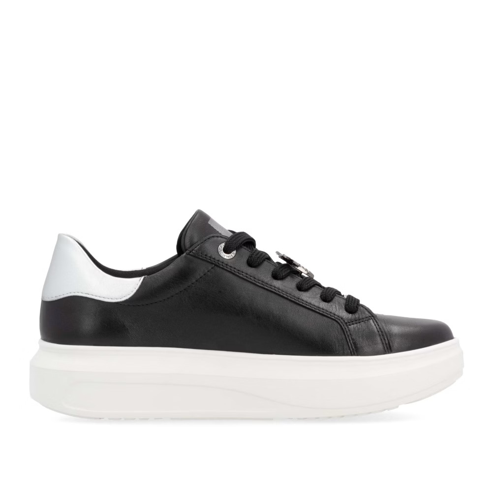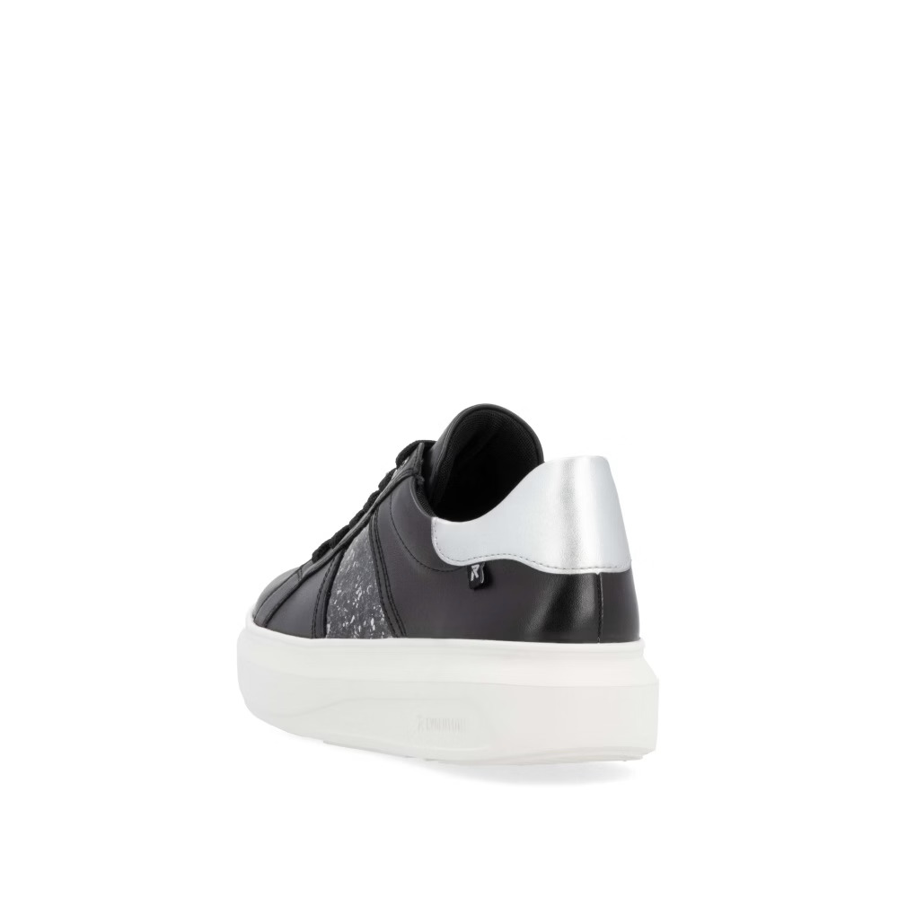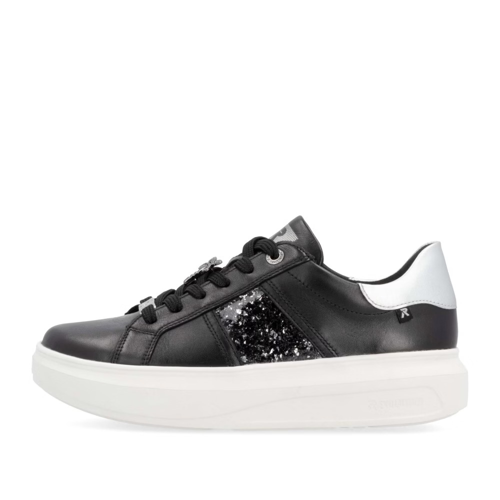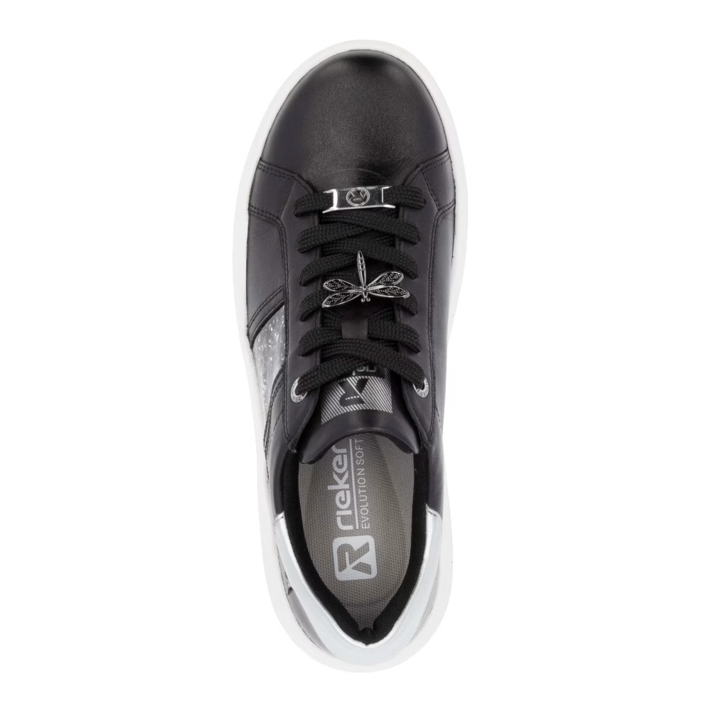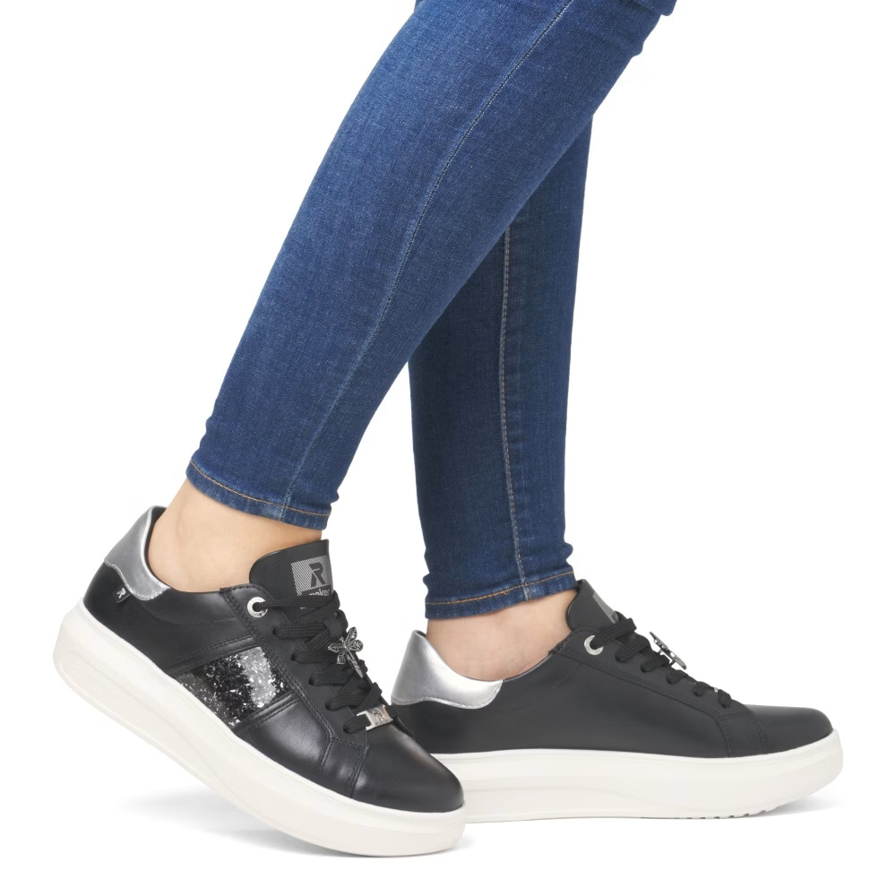A Rieker REVOLUTION bemutatja a modern sportcipők új sorozatát, amely még az egész napos viselet során is különös hangsúlyt fektet a kényelemre. Ezek az egyedi tornacipők minden ruhát a következő szintre emelnek. A fekete bőr felsőrész eredeti dizájnelemekkel az oldalán, fémes ezüst sarokkal és dekoratív szitakötővel a fűzőkön lenyűgöz, biztosítva, hogy ezek a cipők ne maradjanak le. A fűzés lehetővé teszi, hogy a cipőt az Ön igényei szerint alakítsa. Séta közben értékelni fogja a puha, kivehető talpbetétet, amely minden lépésnél kényelmet biztosít. Bárhová is megy, ezek a cipők megbízható és kényelmes társak lesznek. Technológia: RevolutionSoft: Egyedülálló talpbetét, amely puhítja a lábfejet és tökéletesen alkalmazkodik a lábad formájához. Kivehető talpbetét: Az egyszerű karbantartás és a nagyobb kényelem érdekében.