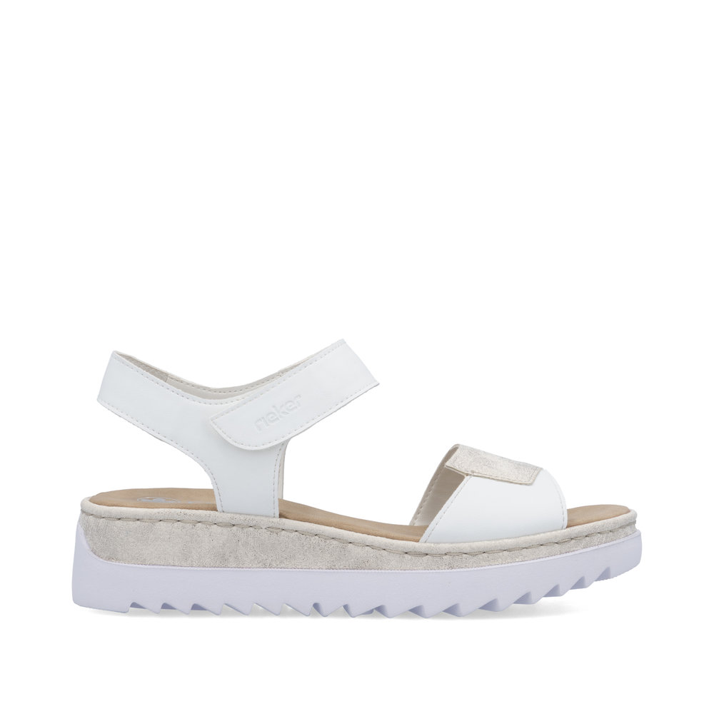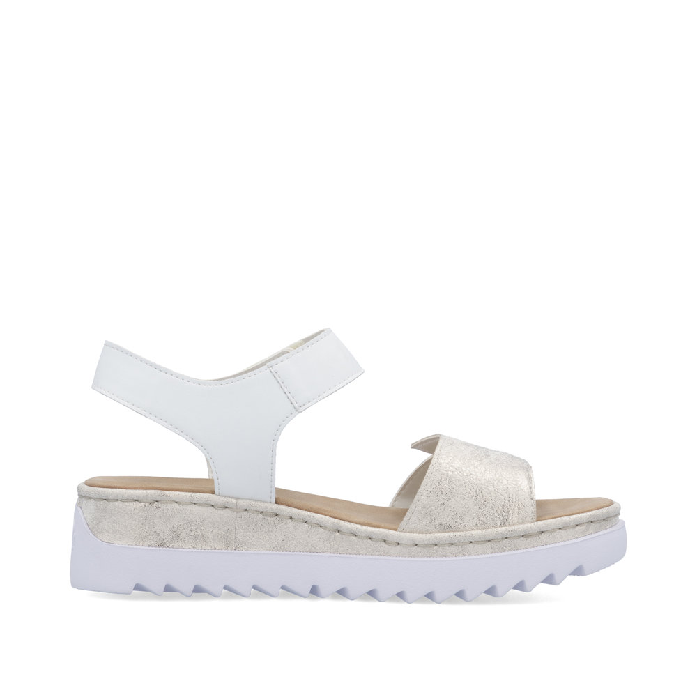 A RIEKER női szandál fehér színben különleges díszítésével az elülső pánton azonnal magára vonja a figyelmet, és egyedi, kifinomult megjelenést kölcsönöz viselőjének. A boka körüli pánt praktikus tépőzárral készült, ami egyszerű felvételt és tökéletes illeszkedést tesz lehetővé. A megemelt talprész nemcsak modern dizájnt nyújt, hanem kiváló stabilitást és hatékony ütéscsillapítást is biztosít járás közben. A puha, kényelmes talpbetét egész napos viselést tesz lehetővé, legyen szó városi sétáról vagy aktív napokról. A RIEKER Antistress és RIEKER Light technológiáknak köszönhetően a cipő rendkívül könnyű, rugalmas, tágas belső térrel rendelkezik és kiválóan csillapítja a lépéseket, ezáltal különleges kényelmet nyújt minden lépésnél. Tökéletes választás azoknak a nőknek, akik nem akarnak választani a stílus és a kényelem között.