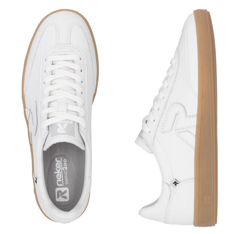 Élvezze a sportos stílust a RIEKER cipőivel, amelyek a klasszikus retro dizájnt ötvözik a modern kényelemmel. Ezek a fehér bőr tornacipők precíz varrásokkal és markáns márkalogóval rendelkeznek, ami egyedi megjelenést kölcsönöz nekik. A fűzős kialakítás lehetővé teszi a tökéletes illeszkedést, míg a kivehető Swing2GO talpbetét biztosítja a láb optimális alátámasztását és hatékony ütéscsillapítást. A kontrasztos barna talp nemcsak divatos megjelenést ad a cipőnek, hanem stabilitást és extra kényelmet is nyújt. Ezek a RIEKER tornacipők tökéletes választás azoknak a nőknek, akik szeretik az elegáns retro stílust és az egész napos komfortot.