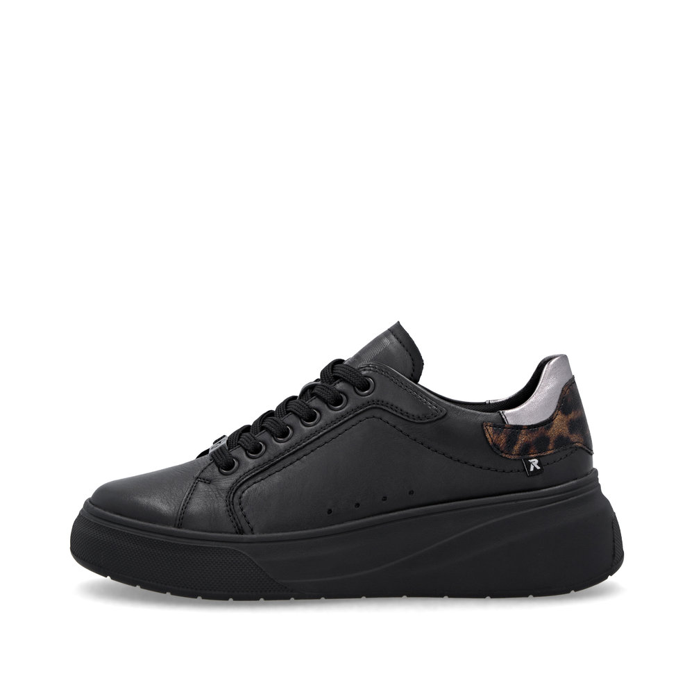 A RIEKER Sport kollekció stílusos tornacipői megbízható társai lesznek a mindennapokban – akár munkába, a városba vagy egy kellemes sétára indul. Az elegáns fekete felsőrészt hátul látványos, mintás és metálfényű applikáció díszíti, amely első pillantásra magára vonja a figyelmet. A fűzős kialakítás lehetővé teszi a cipő tökéletes illeszkedését, míg a puha, kivehető Rieker Soft talpbetét egész napos kényelmet biztosít. Az Antistress technológia csökkenti a terhelést és biztosítja a puhább lépést, a magasabb talp pedig csillapítja az ütéseket és stabil alátámasztást nyújt hosszabb viselés során is. A RIEKER Light technológiának köszönhetően a cipő rendkívül könnyű és kényelmes, így kompromisszumok nélkül élvezheti a mindennapi viselést. A modern megjelenés és a praktikus technológiák tökéletes kombinációját nyújtó cipő tökéletes választás azok számára, akik a kényelmet és a stílust is fontosnak tartják.