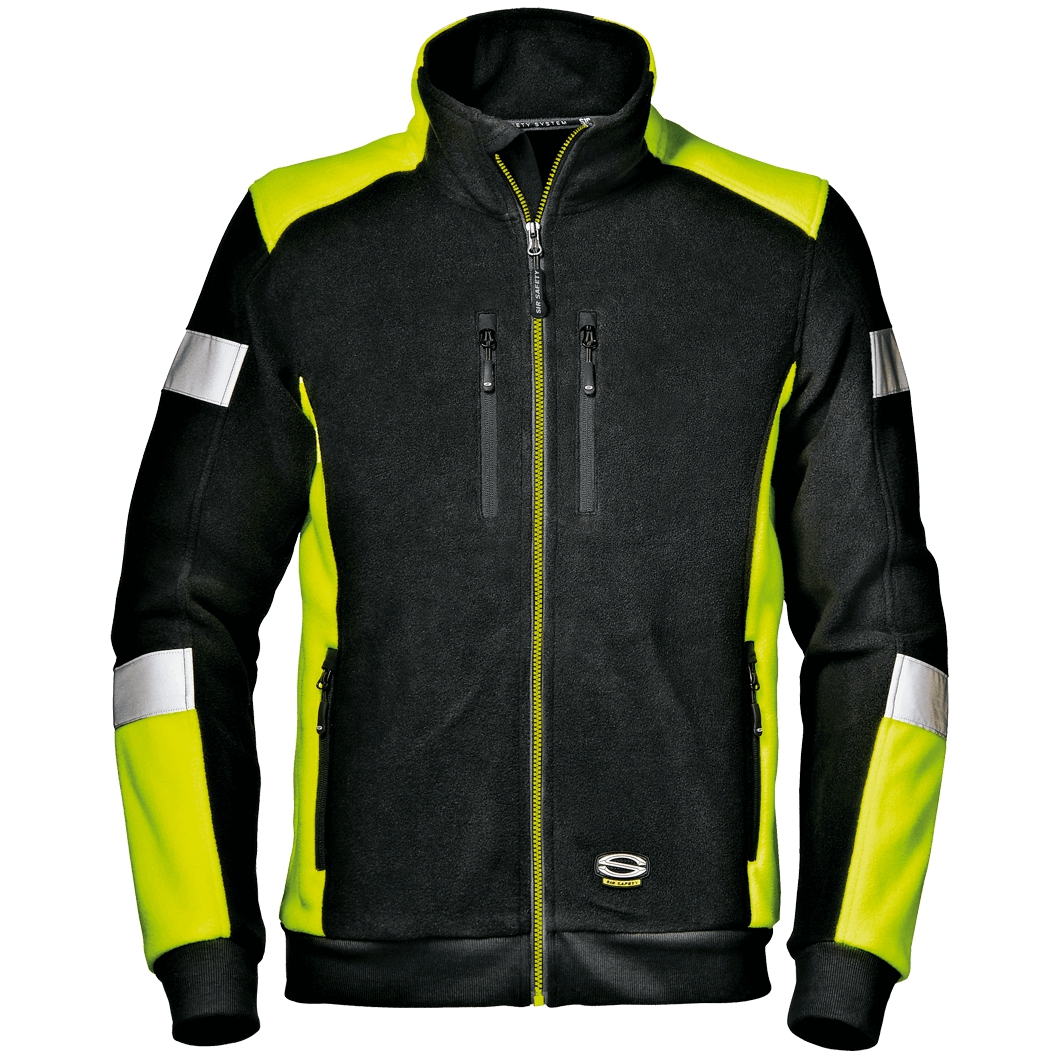 Bunda z technické mikrovláknové tkaniny, 100% polyester 144 vláken, 310 g / m2. Po celé délce zapínání na zip, elastické pletené manžety a pas, boční a náprsní kapsy na zip. Černá s vnějšími rukávy a ramenní podložkou ve žlutých a reflexních vložkách na rukávech, ramenou a zádech.
