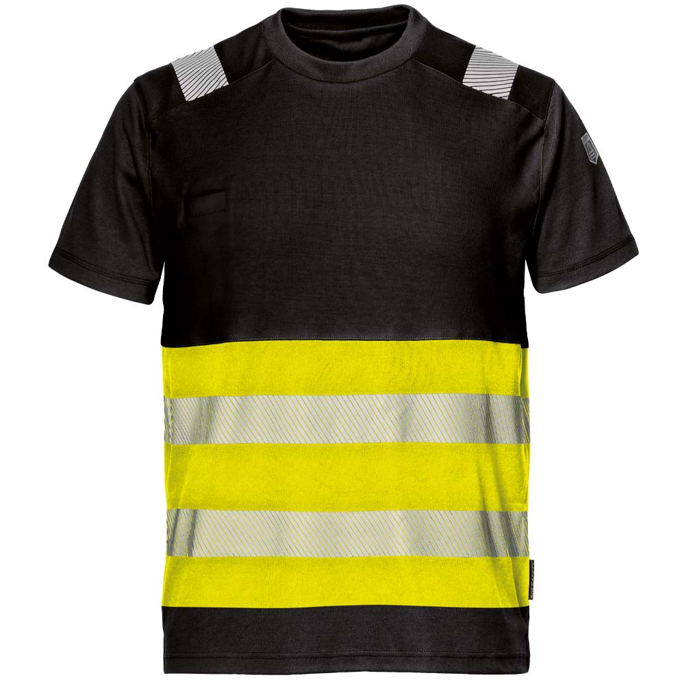 Ez a kerek nyakú póló dupla jersey piké anyagból készült, 55% pamut és 45% poliészter összetétellel, amely biztosítja az optimális kényelmet és tartósságot. A 175 g/m2-es anyagsűrűség könnyű és légáteresztő viseletet kínál, ideális munkakörnyezetben. A felső rész nagy láthatóságú sárga anyagból készült, míg az ujjak, a gallér és az alsó rész kontrasztos fekete színűek. A bal mellrészen egy praktikus tolltartó zseb található. A maximális biztonság érdekében a derékrészen hőhegesztett, dupla szegmentált fényvisszaverő csíkok biztosítják a láthatóságot rossz fényviszonyok között is. A vállrészen további fényvisszaverő csíkok találhatók, míg a nagy láthatóságú kontrasztos betétek a póló alsó részén modern megjelenést biztosítanak. A termék megfelel az (EU) 2016/425 rendelet követelményeinek, valamint az EN ISO 20471 1. osztály előírásainak, így garantálva a biztonságot és a jobb láthatóságot munkavégzés közben.