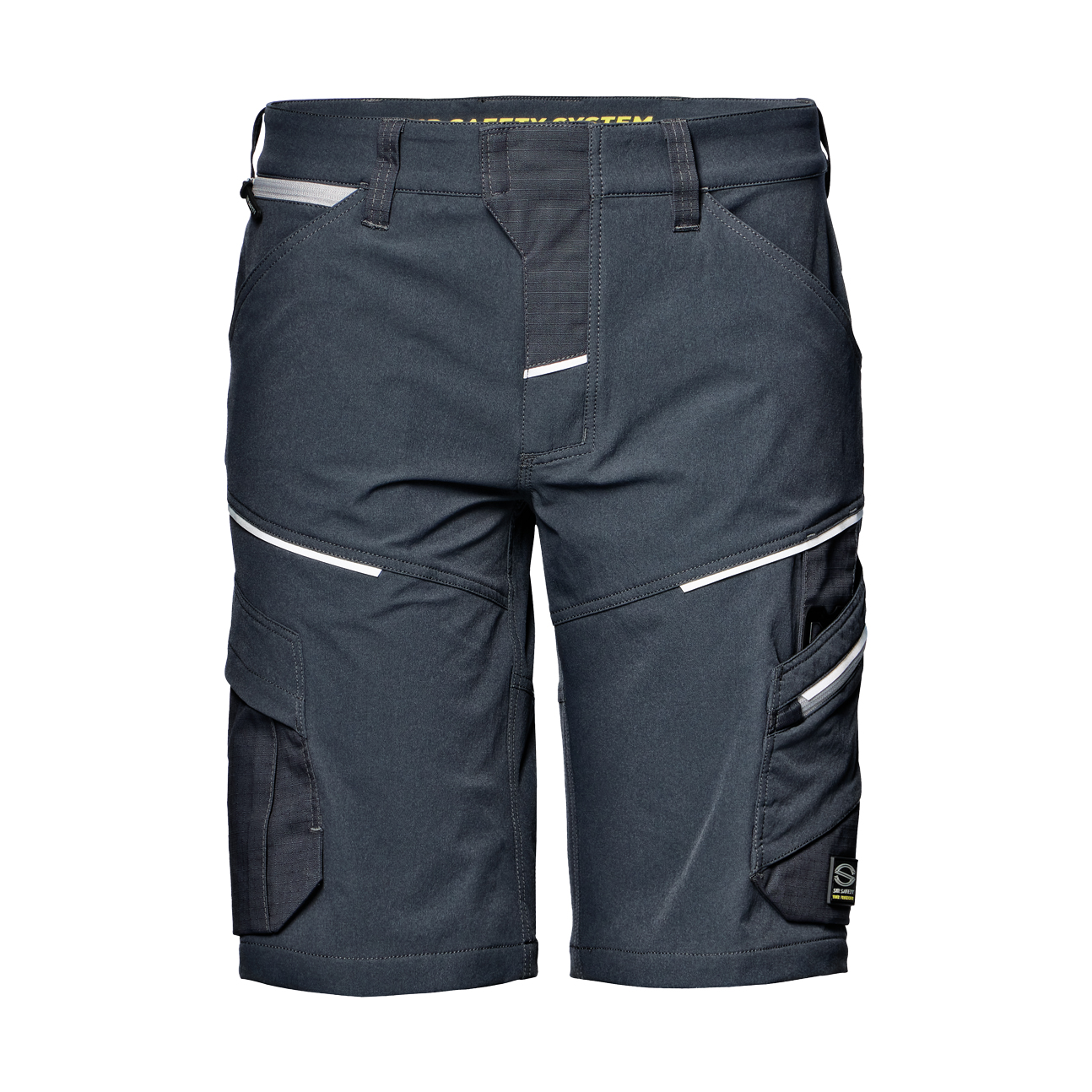Férfi munkás bermudanadrág tartós és rugalmas bi-stretch anyagból (92% nejlon, 8% spandex), amely kopásálló és maximális mozgásszabadságot biztosít. A kontrasztos ripstop stretch betétek (57% pamut, 40% poliészter, 3% spandex, 250 g/m2) extra megerősítést nyújtanak a kritikus pontokon. Gombos és cipzáras záródással, elülső és hátsó zsebekkel, valamint szerszámtartó hurkokkal rendelkezik a derékrészen. A dupla varrások növelik a tartósságot még intenzív használat mellett is. A combon és a vádlin található fényvisszaverő elemek fokozzák a láthatóságot. A vízlepergető bevonat kényelmet nyújt nedves körülmények között is. A termék megfelel a (EU) 2016/425 rendeletnek.
