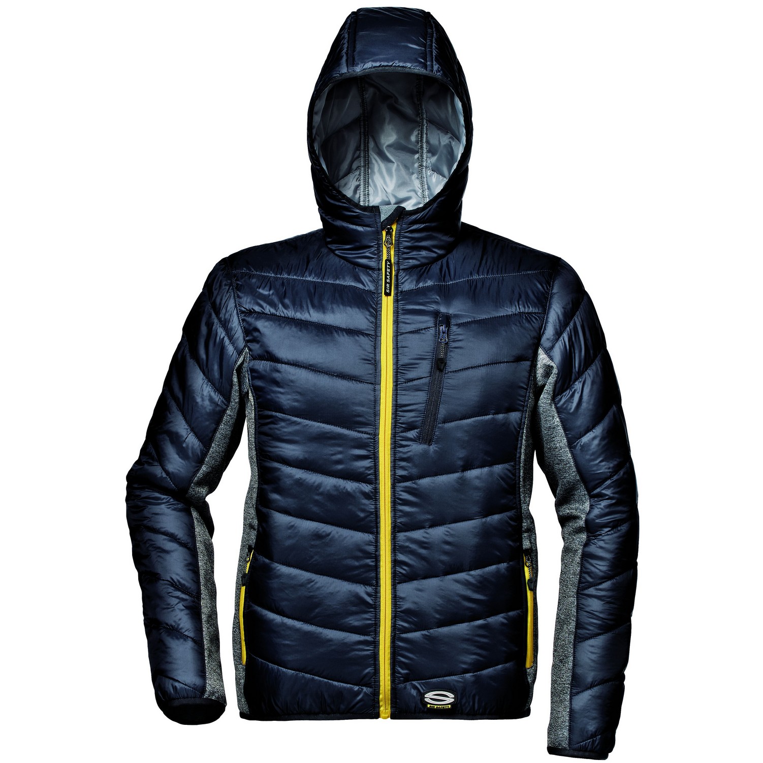 Ultralehká Nylonová bunda s kapucí s vnitřním zateplením 100g/m. Barva tmavě modá/šedá, náprsní kapsa na zip, dvě spodní kapsy na zip, Stretchové profily na kapuci, manžetách, bocích. Moderní bunda do práce, ale i na běžné nošení do města.