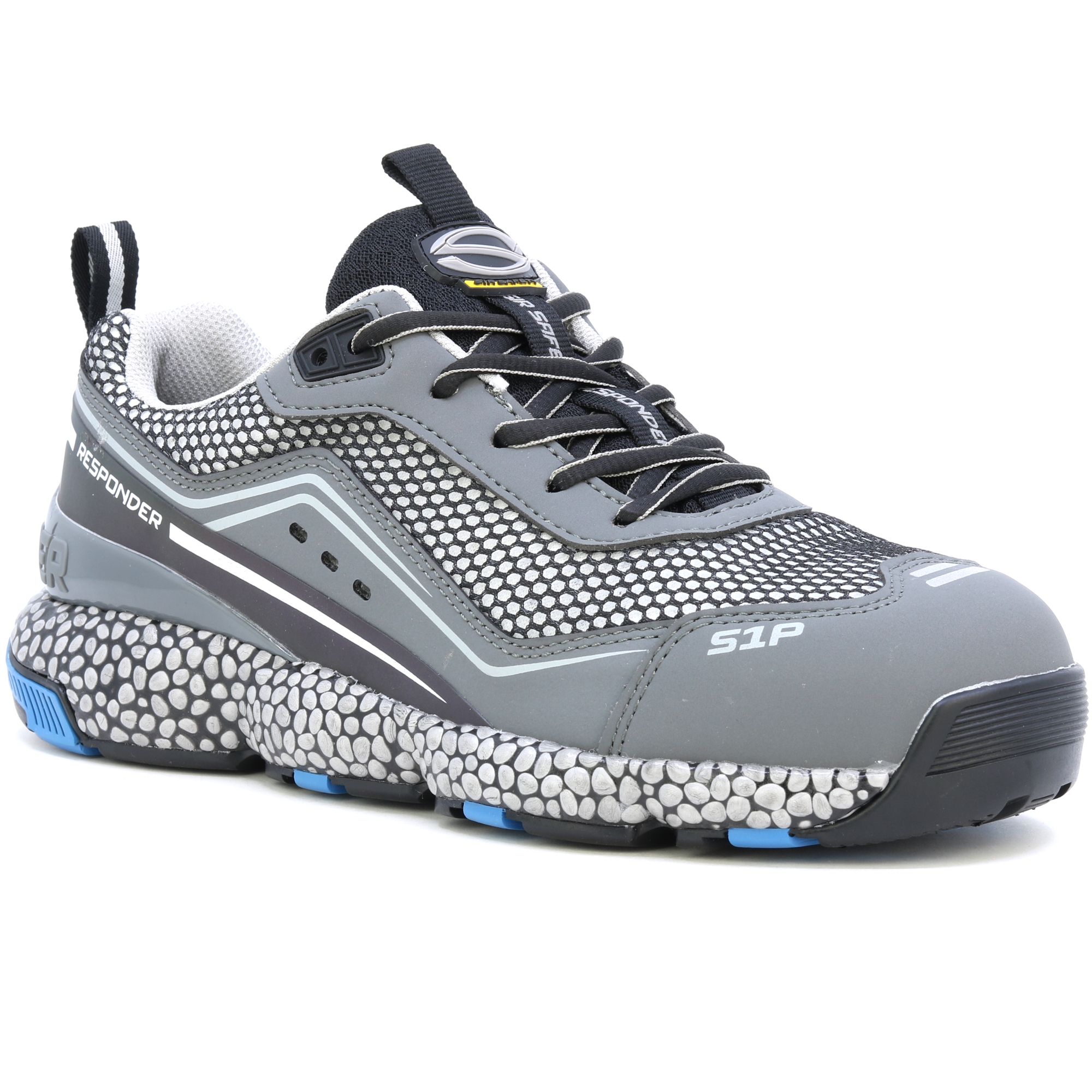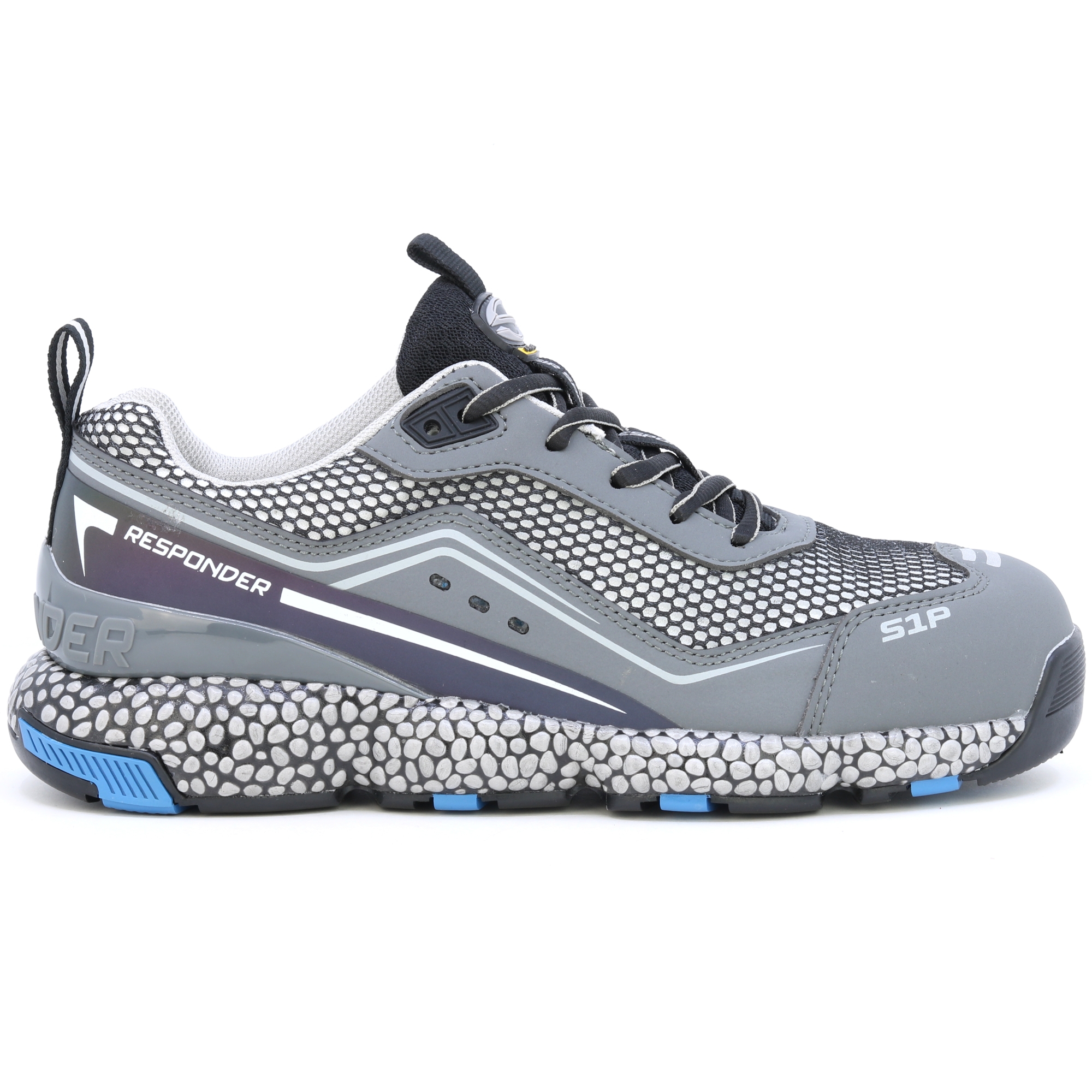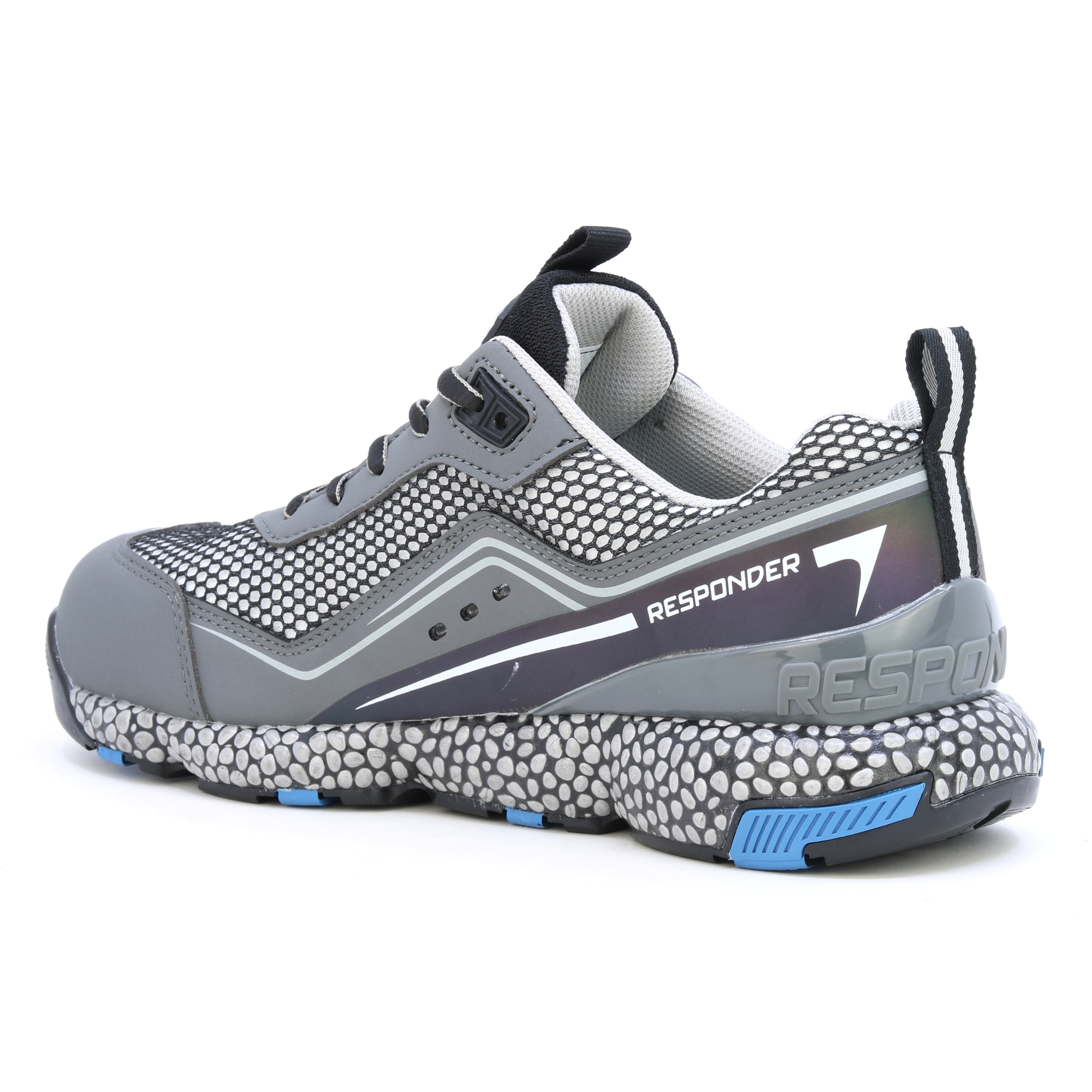 POZOR! Extrémně lehká a pohodlná pracovní obuv. Patentovaný systém Responder dodá pocit jako by jste měli chodidlo v pěnových pantoflích a zároveň zaručí, že nepocítíte únavu ani po celodenním nošení! Nízká obuv s ultradynamickým designem, s hliníkovou špičkou a kompozitní mezipodešví s konstantní tloušťkou 4 mm. Vybaven svrškem z kůže Action Nubuk se zapínáním na tkaničky a reflexními vložkami. E-TPU Responder/pryžová podešev poskytuje vynikající elasticitu a tlumící efekt: mezipodešev vyrobená z expandovaného termoplastického polyuretanu pokrývá celé chodidlo a nabízí flexibilitu a plně citlivé odpružení. Gumová podešev díky svým hlubokým podélným drážkám zvýrazňuje pružnost podešve a zajišťuje vynikající přilnavost na všech typech povrchů. Mezipodešev RESPONDER se skládá ze směsi, která spojuje tisíce E-TPU korálků s vysokou elasticitou a odolností. Podšívka a perforace v plantární oblasti s vynikajícími protišokovými vlastnostmi. Antistatický. Podšívka z polyesterové síťoviny má vynikající odvodňovací schopnost díky své látce a struktuře s vysokou absorpční schopností. Hlavní rysy: Patentovaná technologie RESPONDER použitá v mezipodešvi a stélce poskytuje vynikající citlivé odpružení, extrémní lehkost a flexibilitu po celém povrchu chodidla, čímž zajišťuje vynikající výkon i po dlouhodobém a intenzivním používání. Stabilizátor paty zabraňuje únavě nohy a zlepšuje stabilitu nohy.