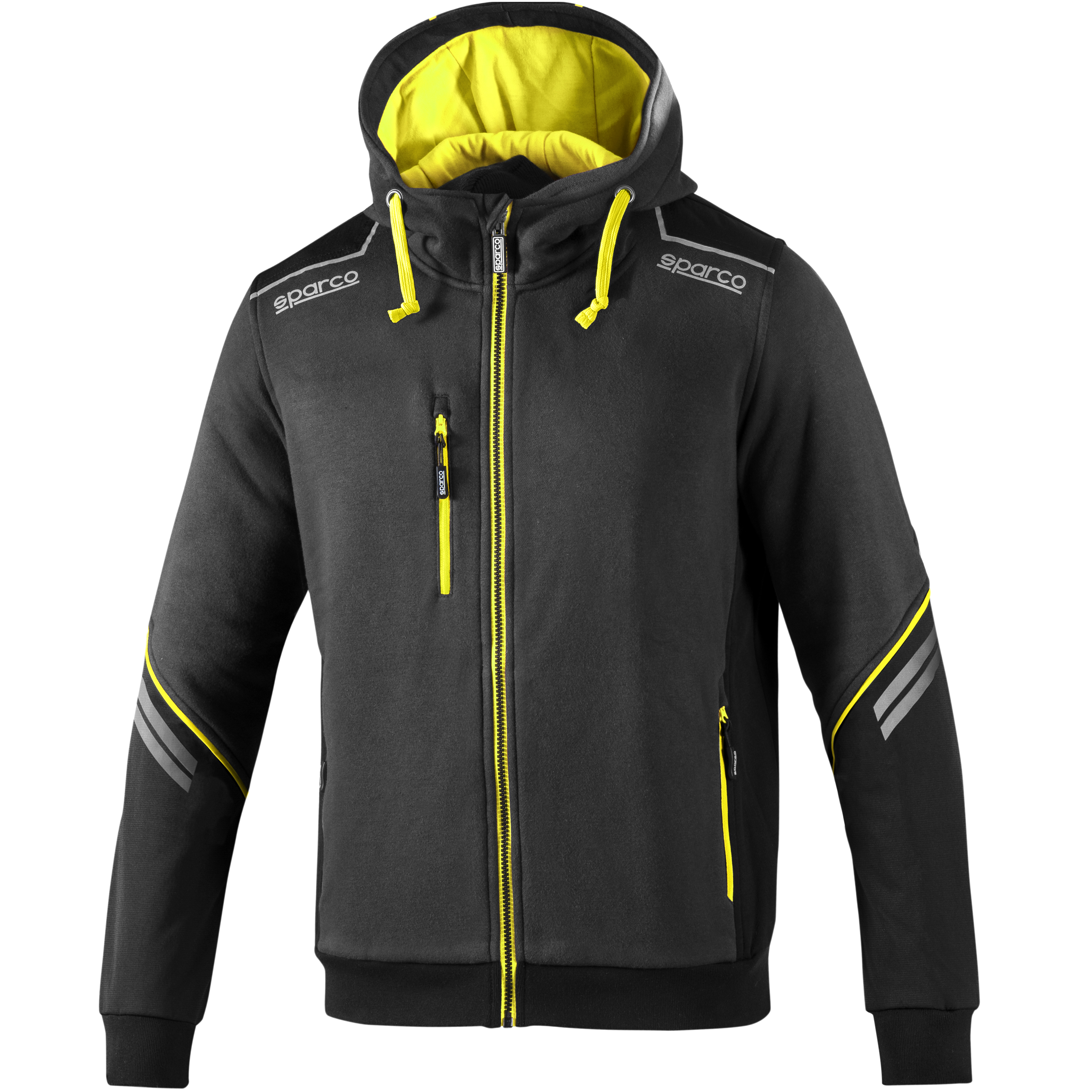 80% bavlna - 20% polyester / 280gsm Sparco reflexní loga, vyztužené rukávy s vložkami proti oděru a vysoce viditelnými reflexními pruhy. Vyztužné vložky na ramenou, ultra posuvný boční zip na náprsní kapse, integrovaná nastavitelná kapuce s kontrastním vnitřkem.