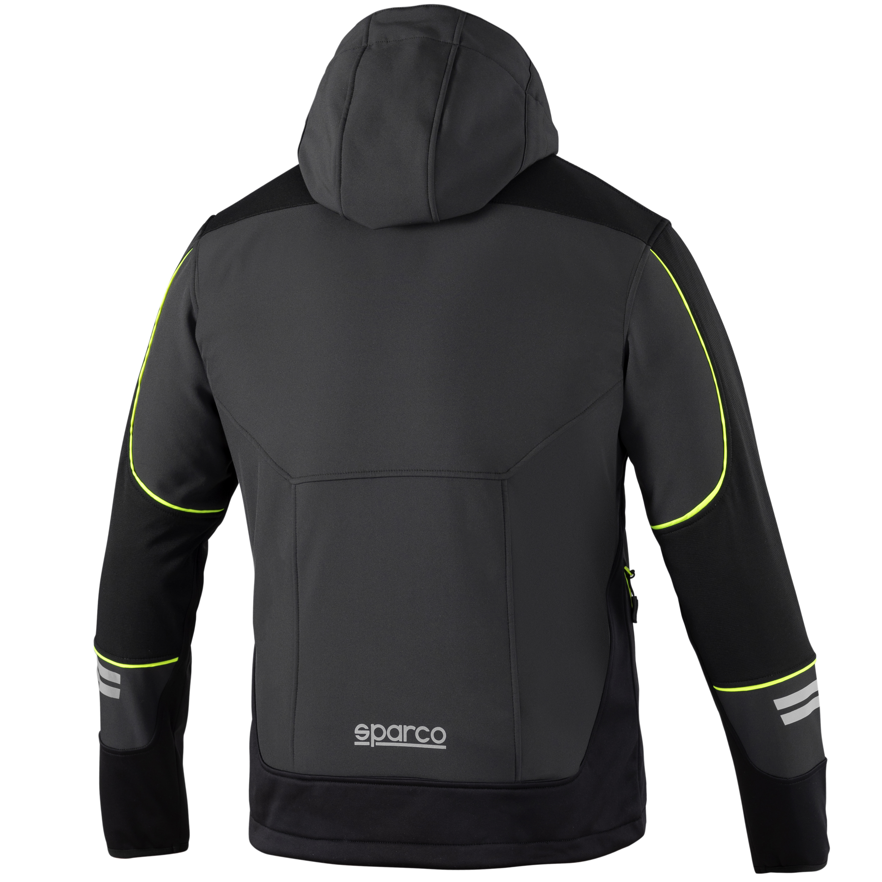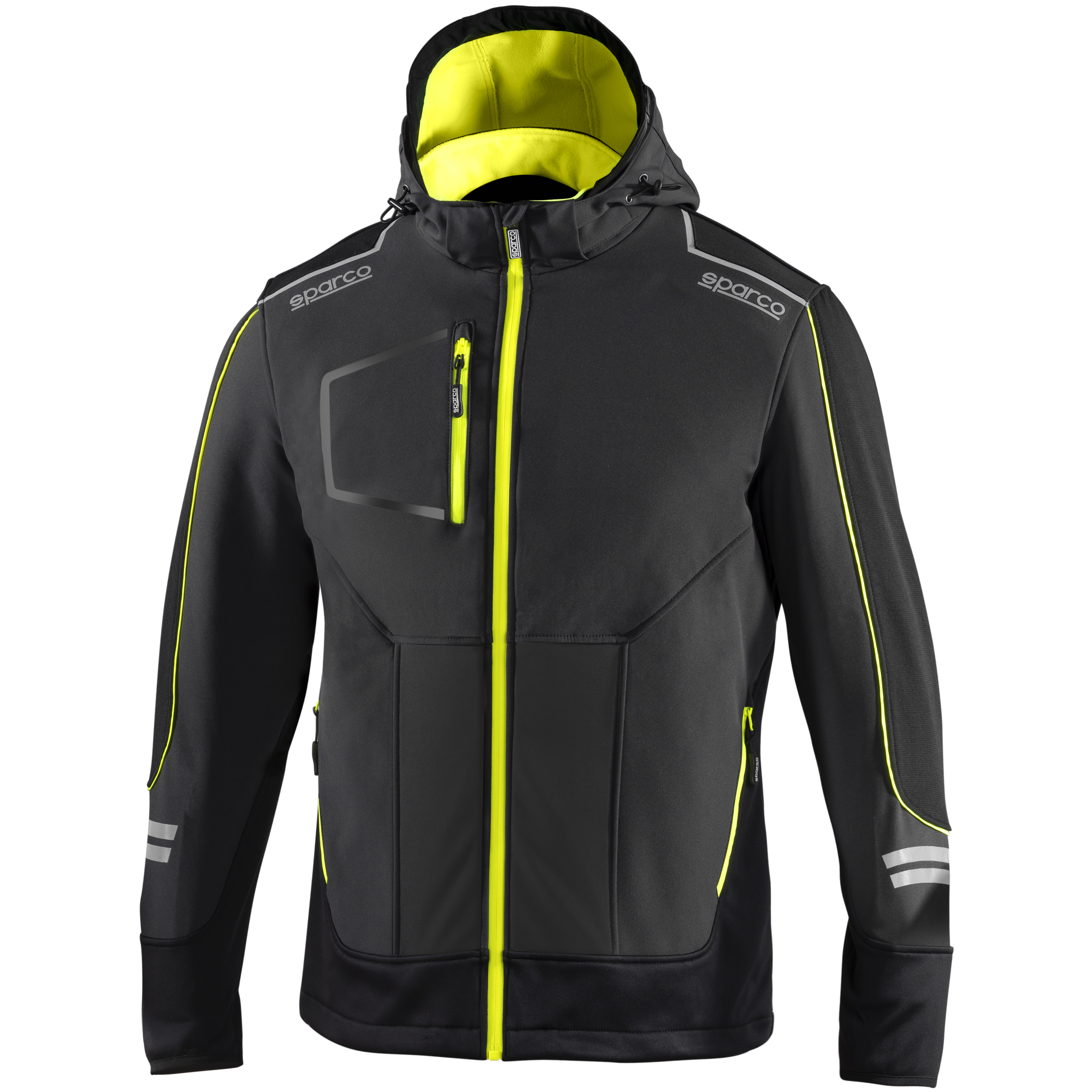Softshellová bunda Sparco, která je větruodolná a nepromokavá. Je vybavena fleecovou vnitřní podšívkou. Materiál: 94 % polyester - 6 % spandex / 330 g/m2 vnitřní: 100 % polyester (polar fleece) reflexní loga sparco, vyztužené vložky na ramenou, ramena a rukávy z materiálu odolného proti oděru. Potažené voděodolné zipy, boční a náprsní kapsy se zapínáním na zip s vysokou viditelností, reflexní proužky na rukávech, odnímatelná a skládací kapuce s dvojitým nastavením, super strečová tkanina na manžetách, vnitřní nastavitelná podšívka pro maximální přizpůsobení.