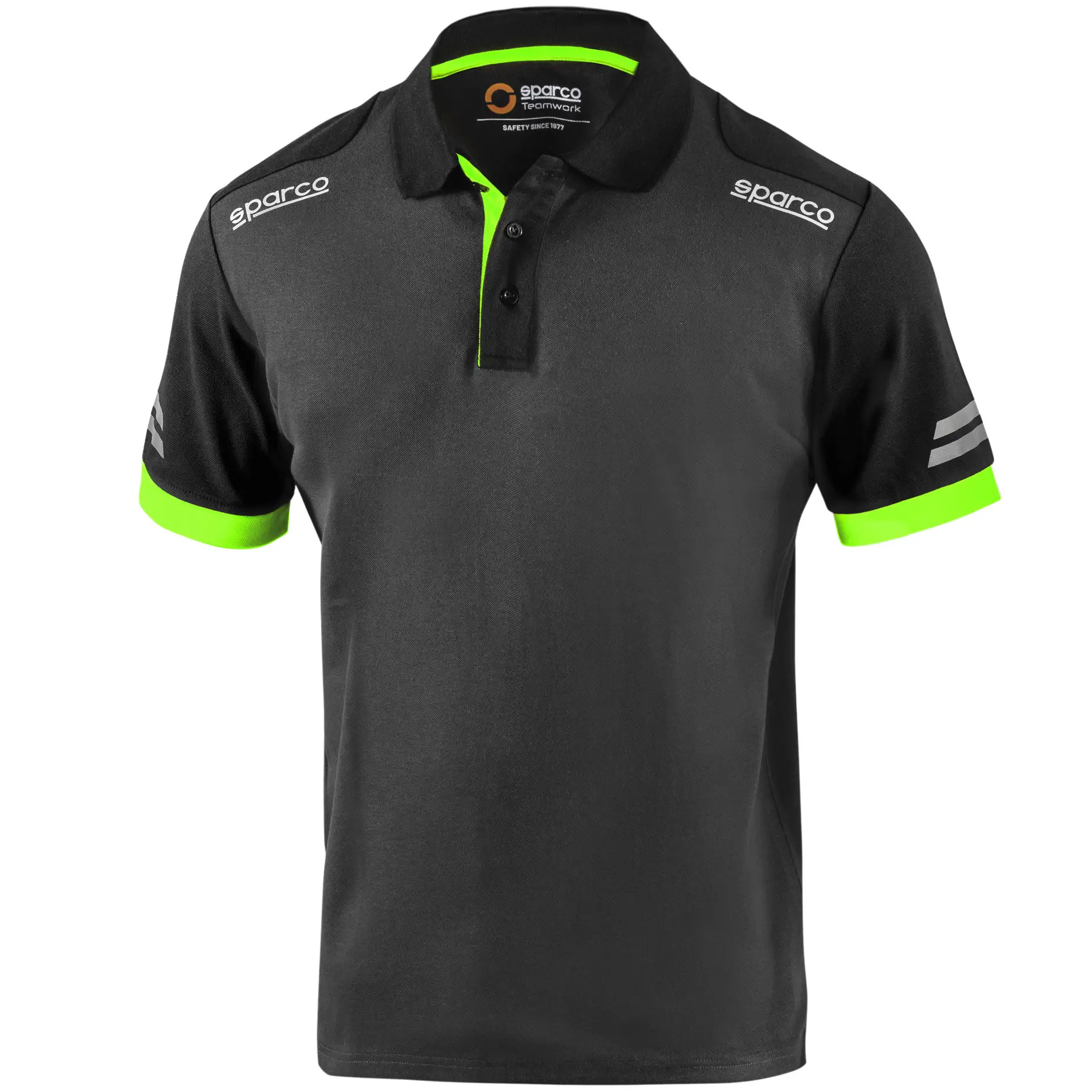 65% pamut – 35% poliészter piké hatással / 180 g/m2, fényvisszaverő Sparco logók, nagy láthatóságú csíkok a fényvisszaverő ujjakon, kontrasztos betétek az ujjakon és a galléron, megerősített vállrész és 3 gombos nyakkivágás, oldalsó hasítékok az alsó részen.