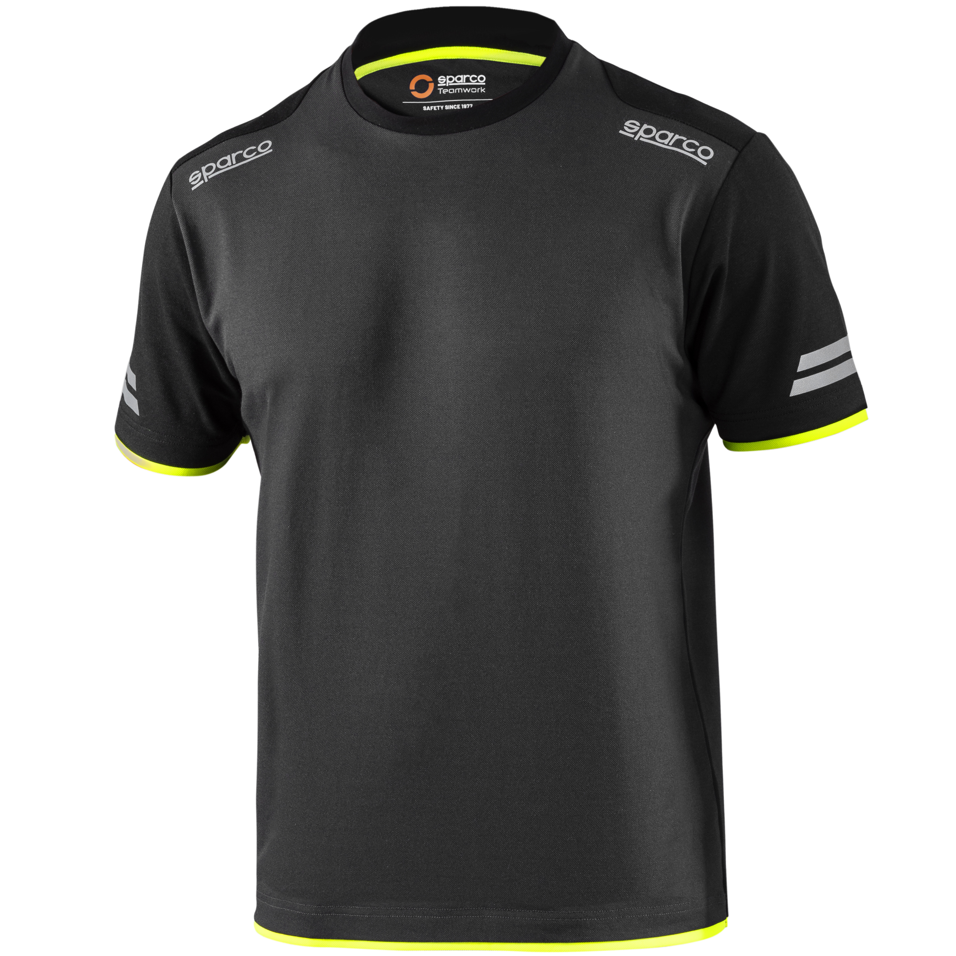 50 % bavlna - 50 % polyester s efektem pique / 170 g/m2 reflexní loga Sparco, vysoce viditelné pruhy na rukávech, zesílená ramena, kontrastní vložky.